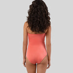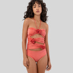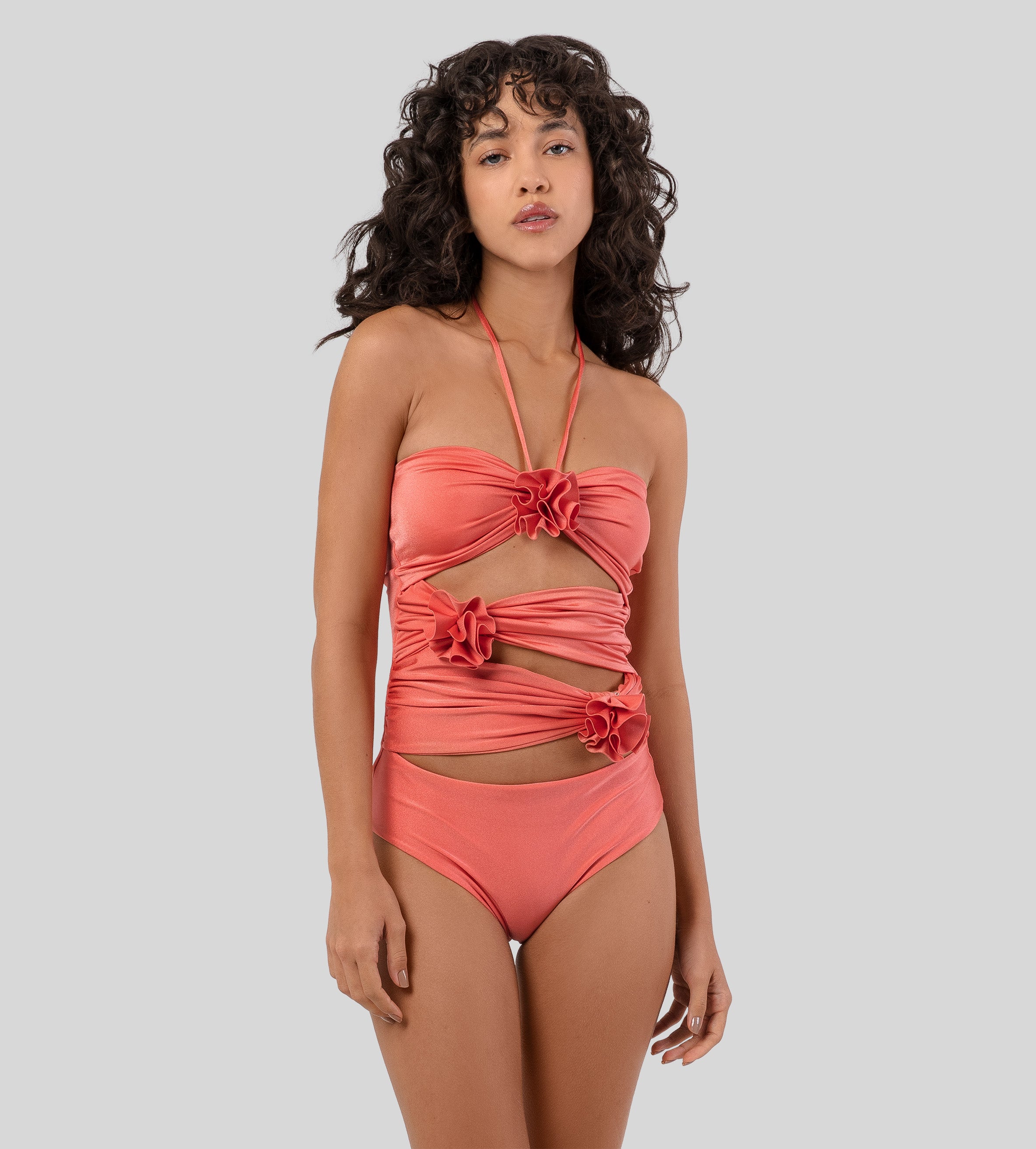 One-piece swimsuit with a straight neckline at the front and back, knot closure and asymmetrical openings on the abdomen with 3 flower-shaped ruffles. This suit has a higher rise in the leg that offers a sexier silhouette.