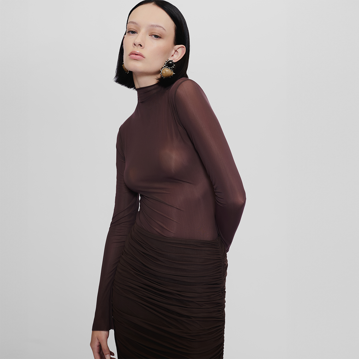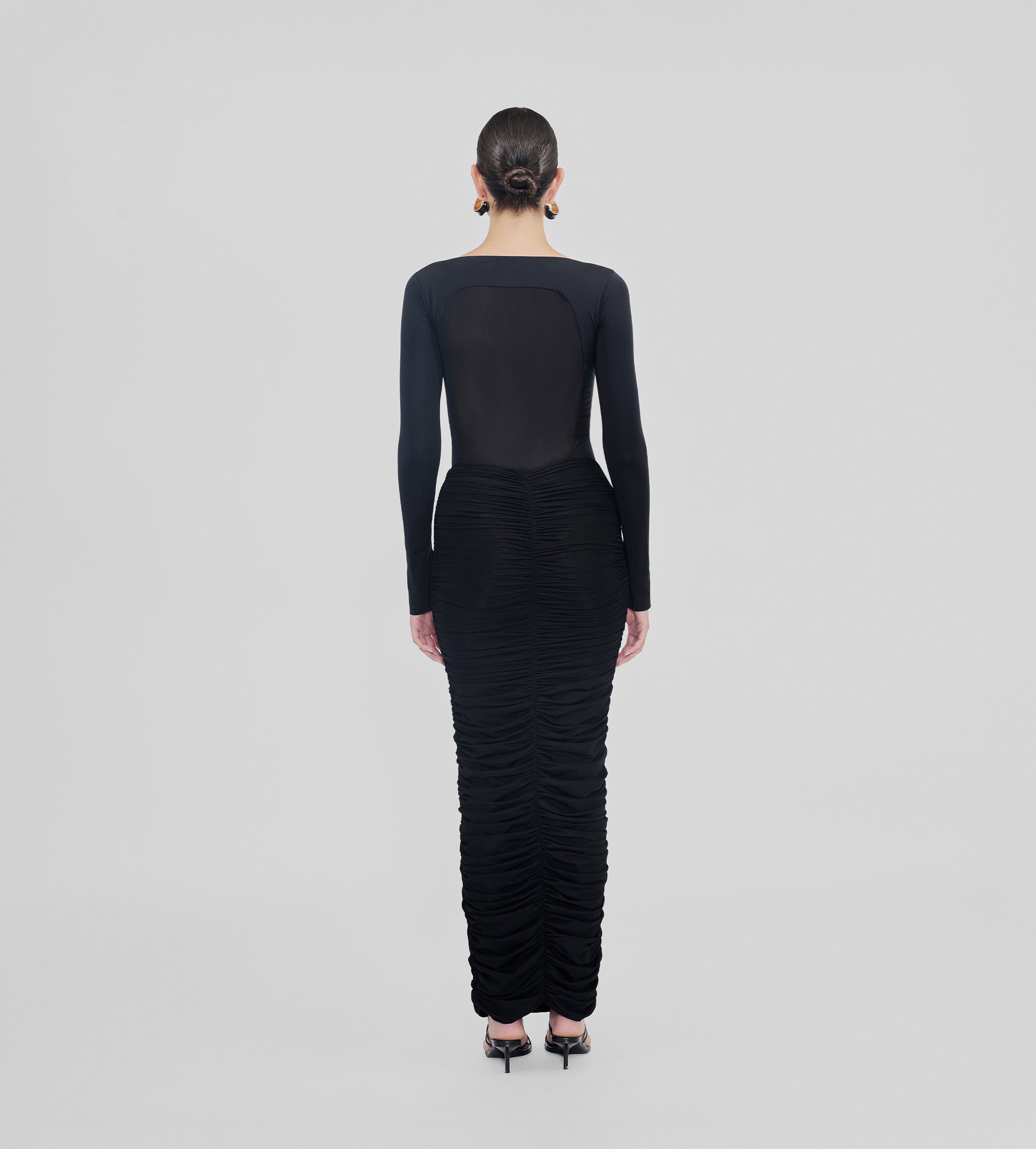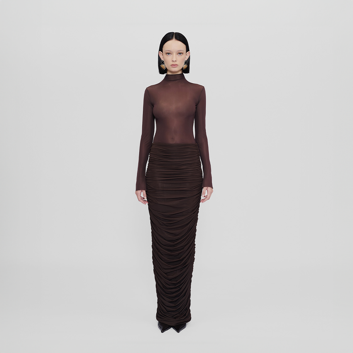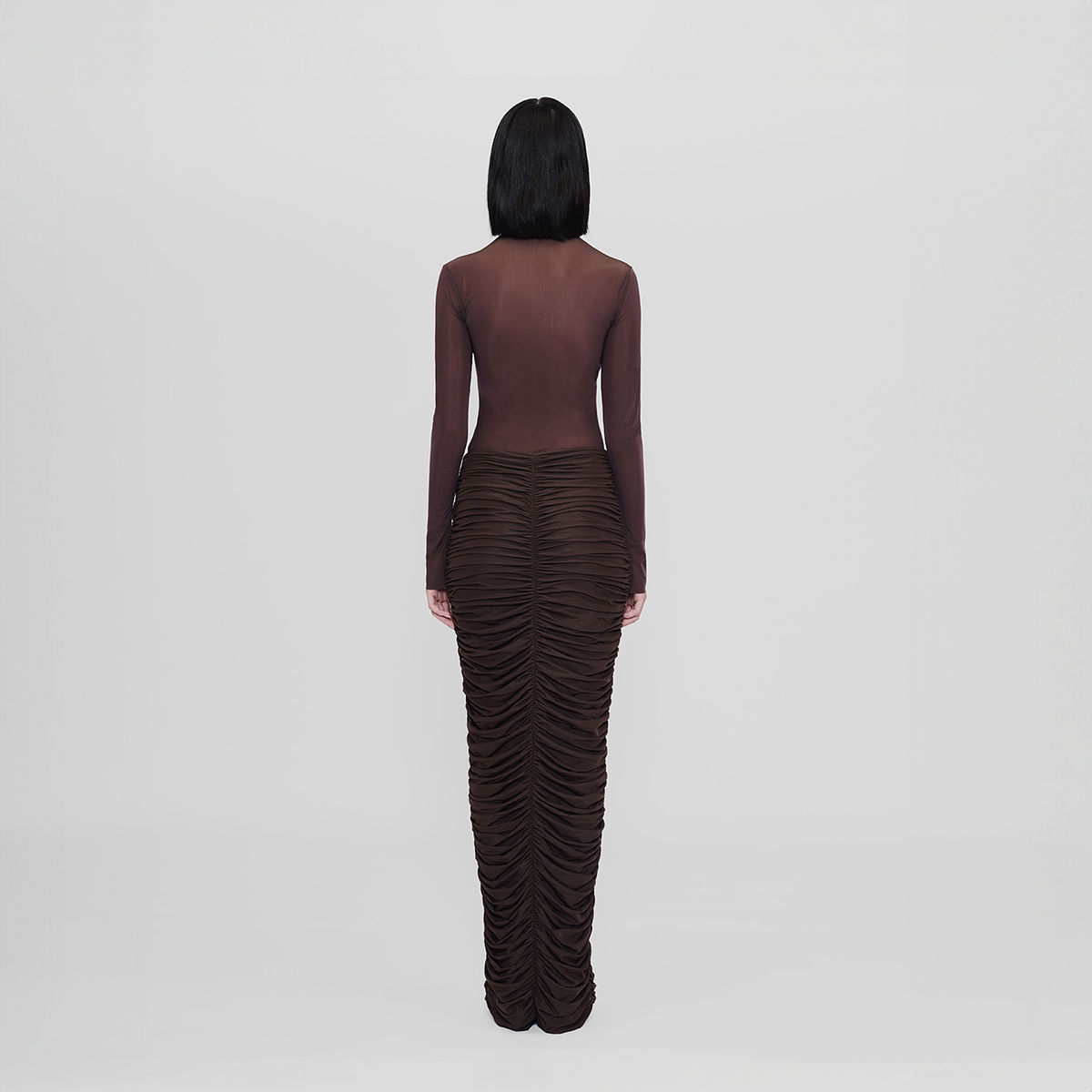 High-waisted long skirt with ruched details at the front and back, crafted from our new see through lycra. This versatile design enhances any outfit, bringing an effortless blend of sophistication and charm.