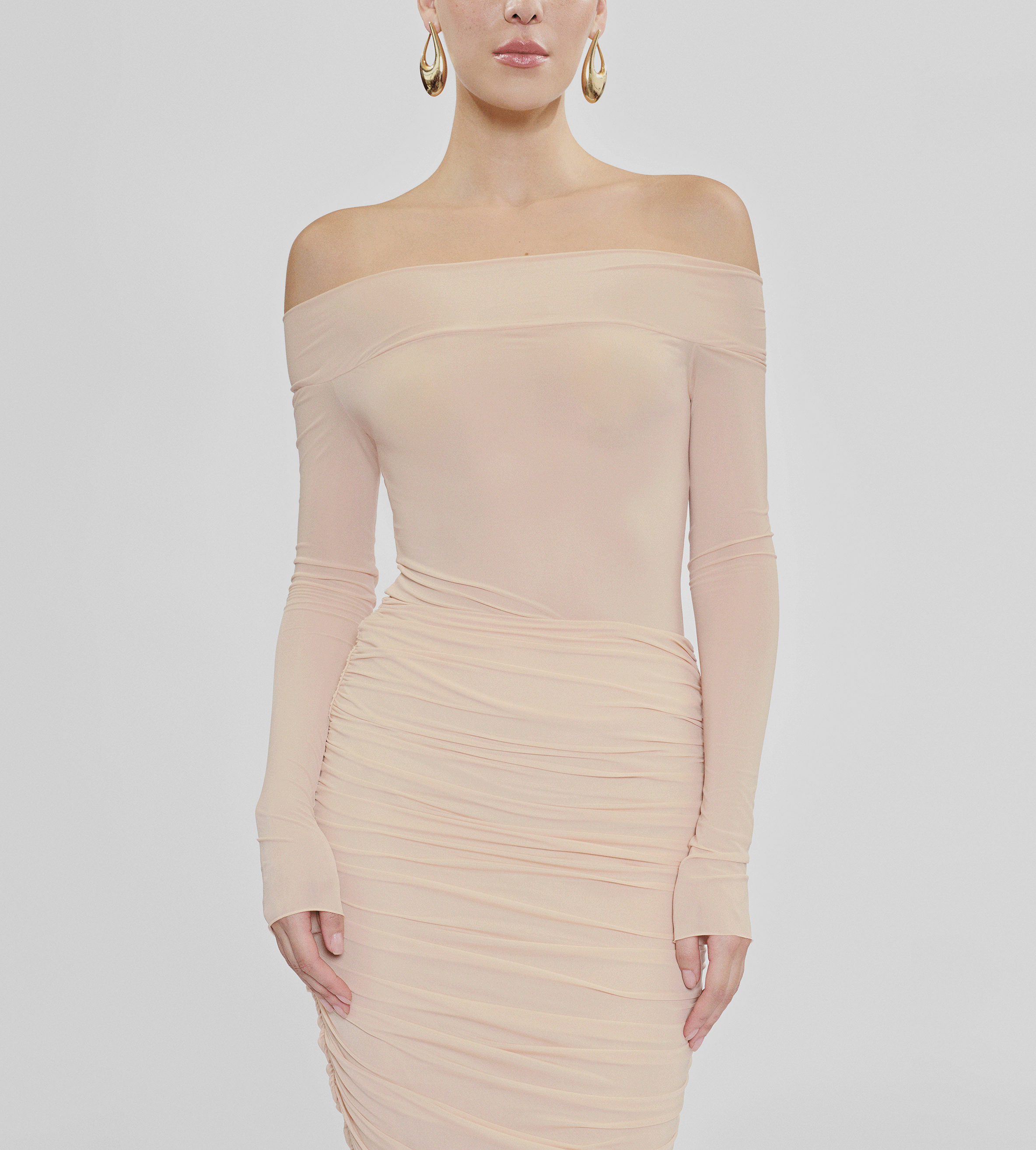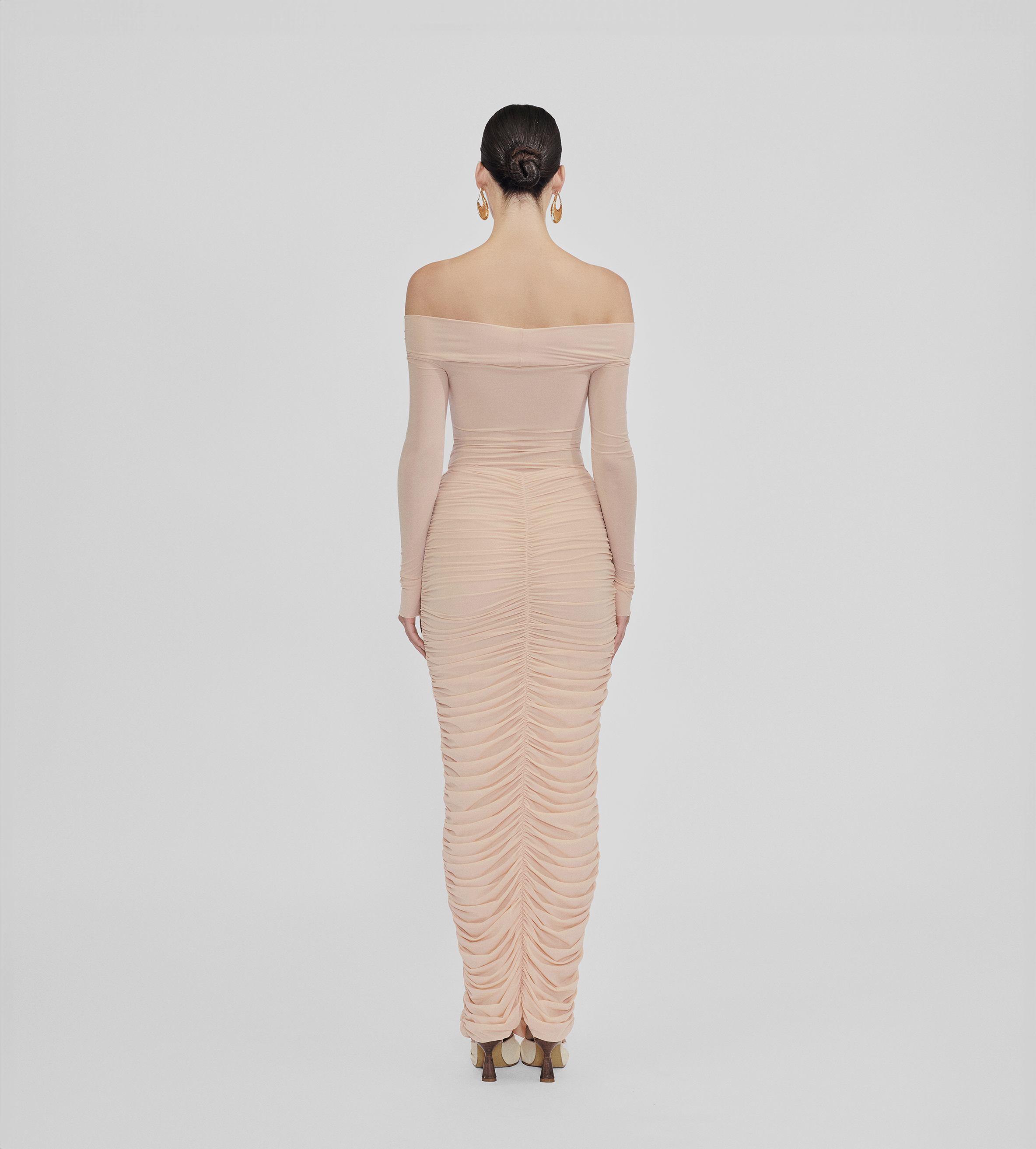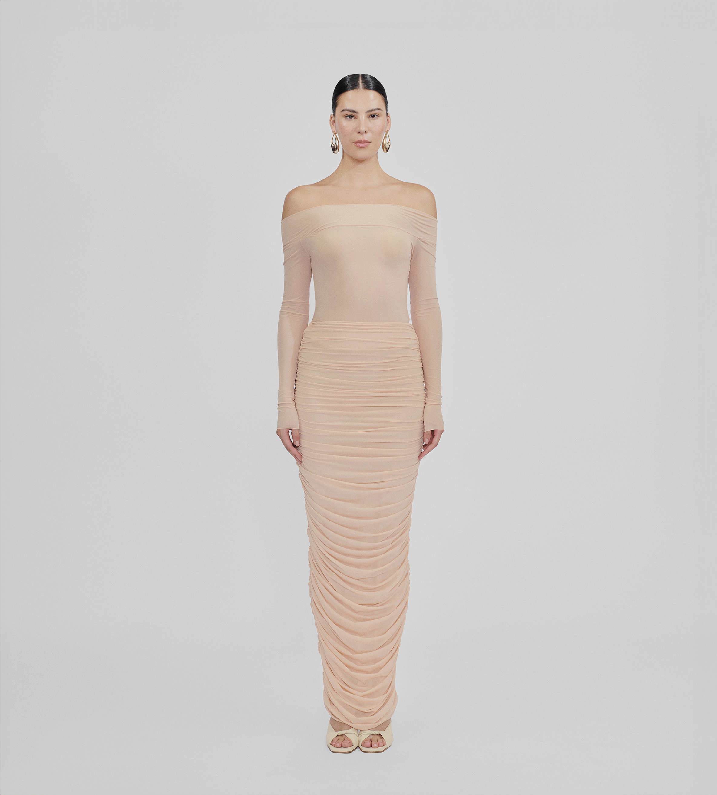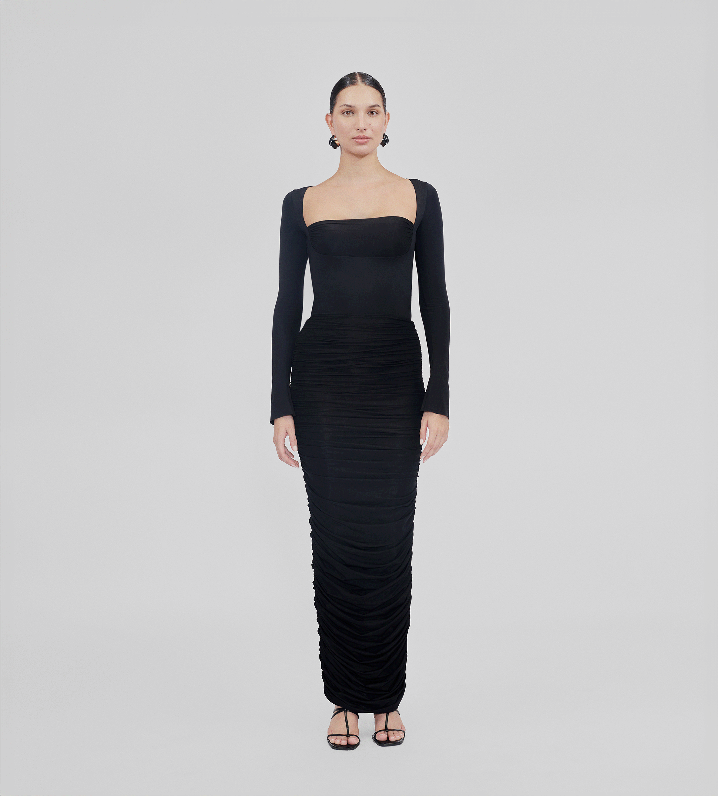 High-waisted long skirt with ruched details at the front and back, crafted from our new see through lycra. This versatile design enhances any outfit, bringing an effortless blend of sophistication and charm.