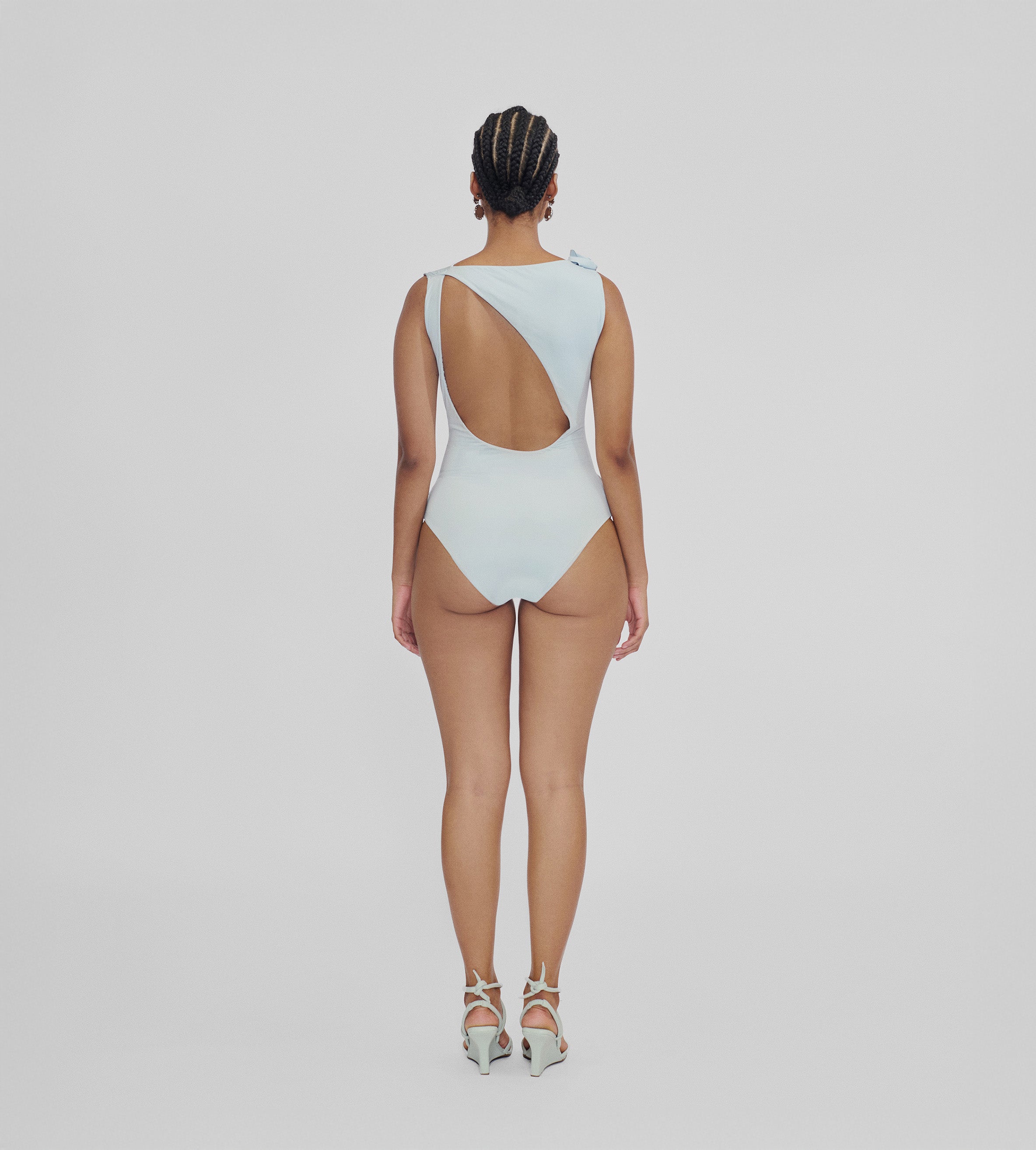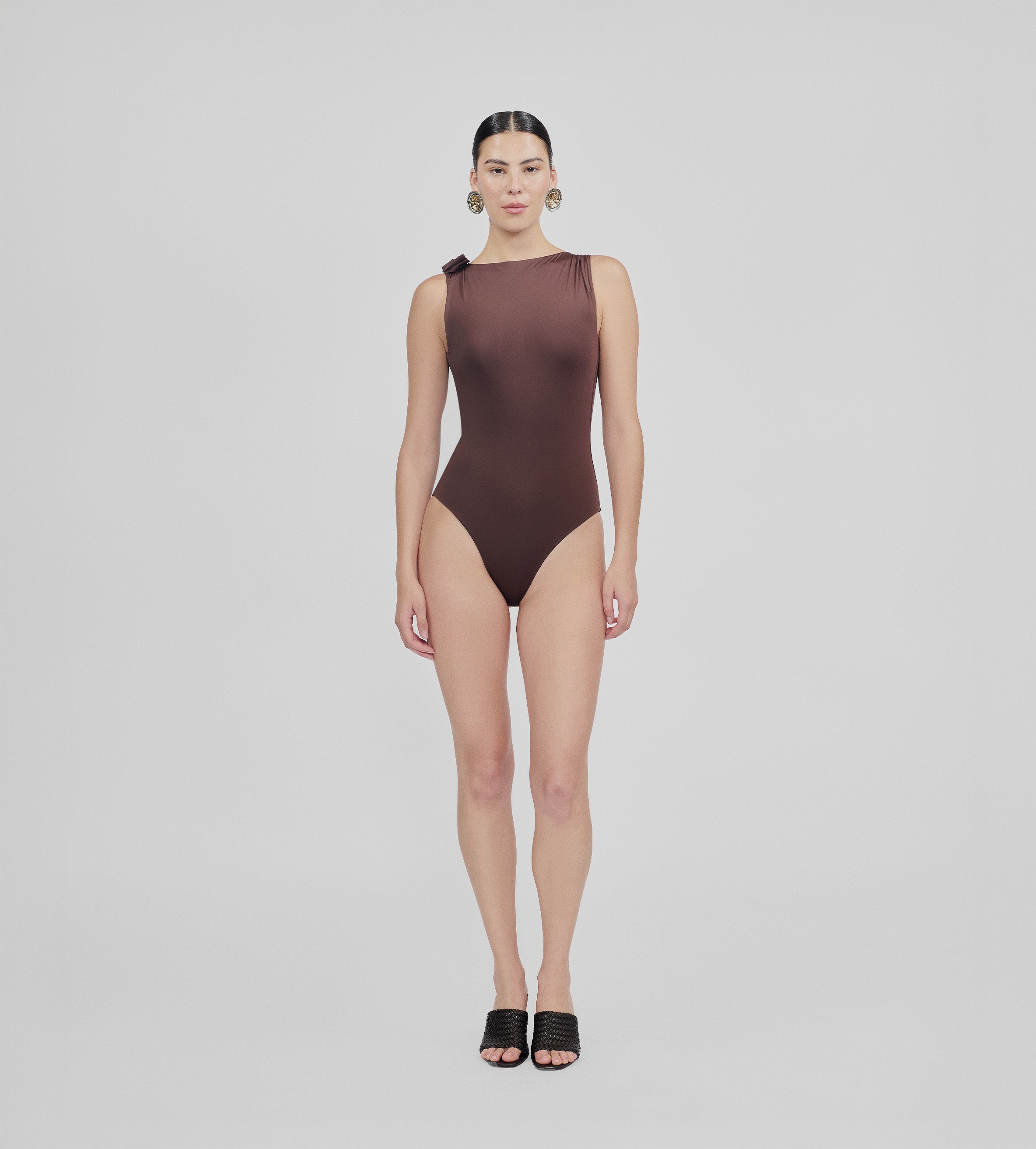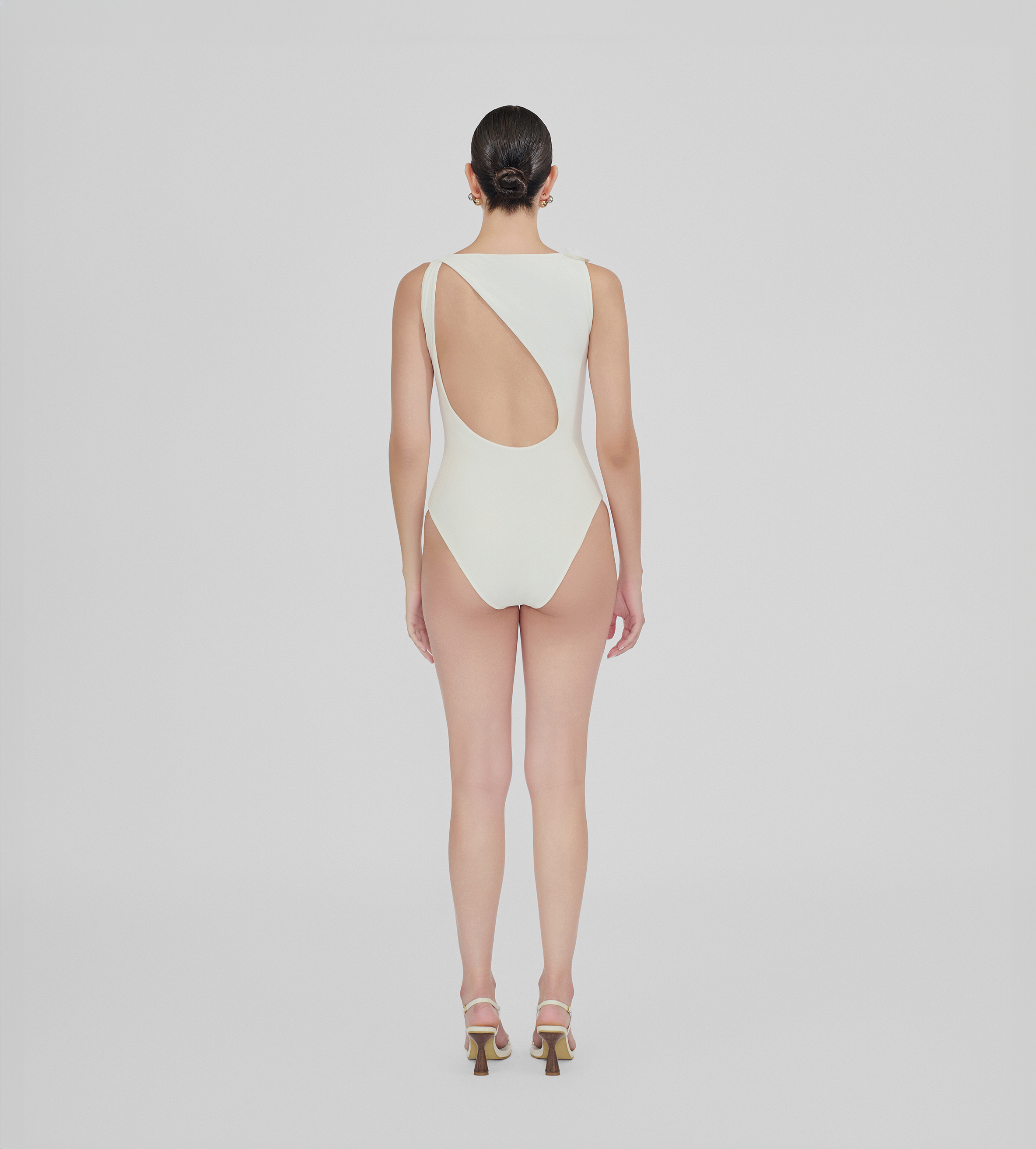 The Claver one-piece seamlessly blends elegance and modernity, featuring a flattering boat neckline and delicate shoulders adorned with our new 3D floral embellishment. The design is elevated by an asymmetric, sensuous drop-shaped open back. Its minimalist aesthetic effortlessly complements any ensemble, making it a versatile addition to your wardrobe.