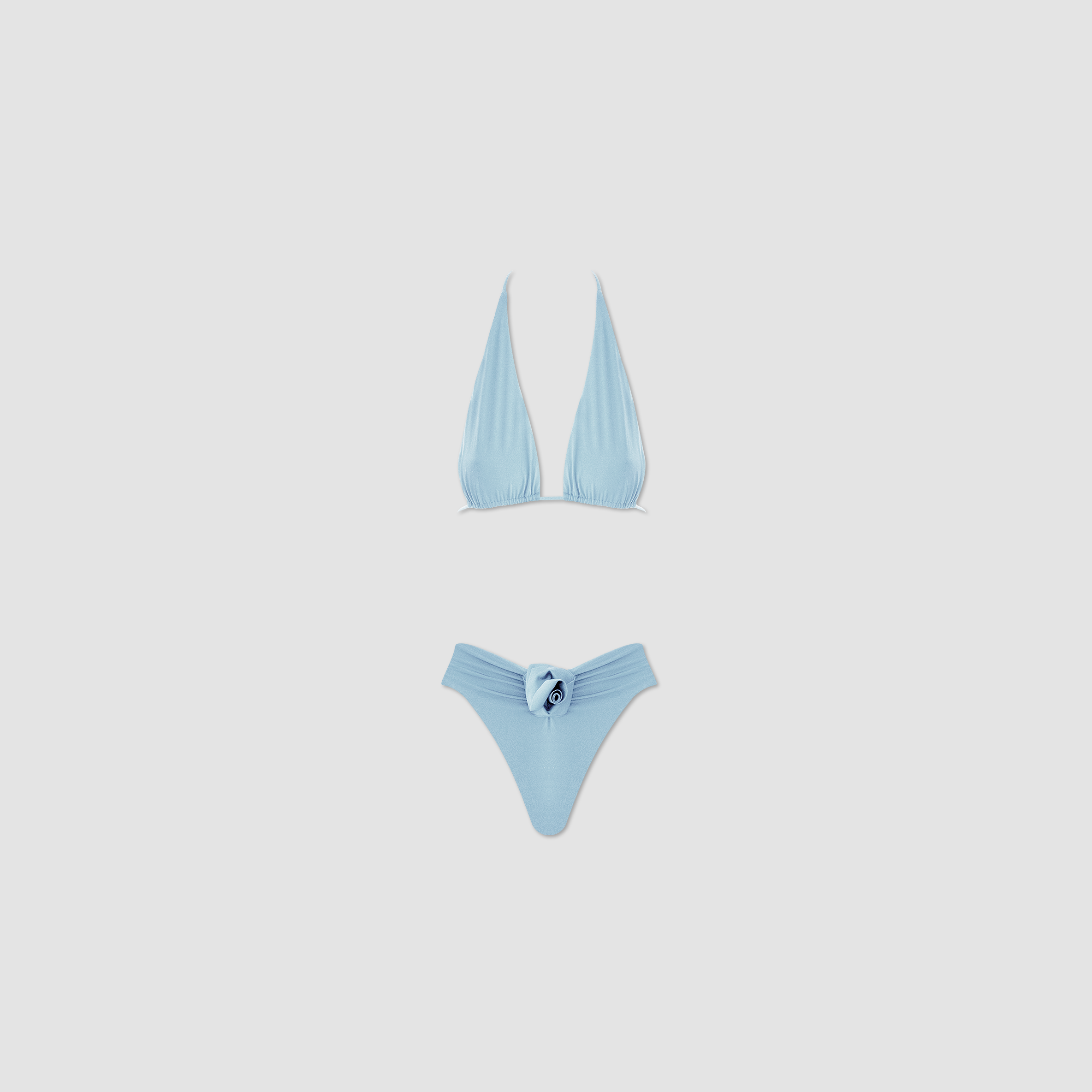 The Malanga two-piece features a ruched plunging top beautifully finished with wrap straps, adding an extra feminine touch. Paired with high-rise briefs that enhance the figure, the design includes a ruched front and a stunning 3D flower embellishment.