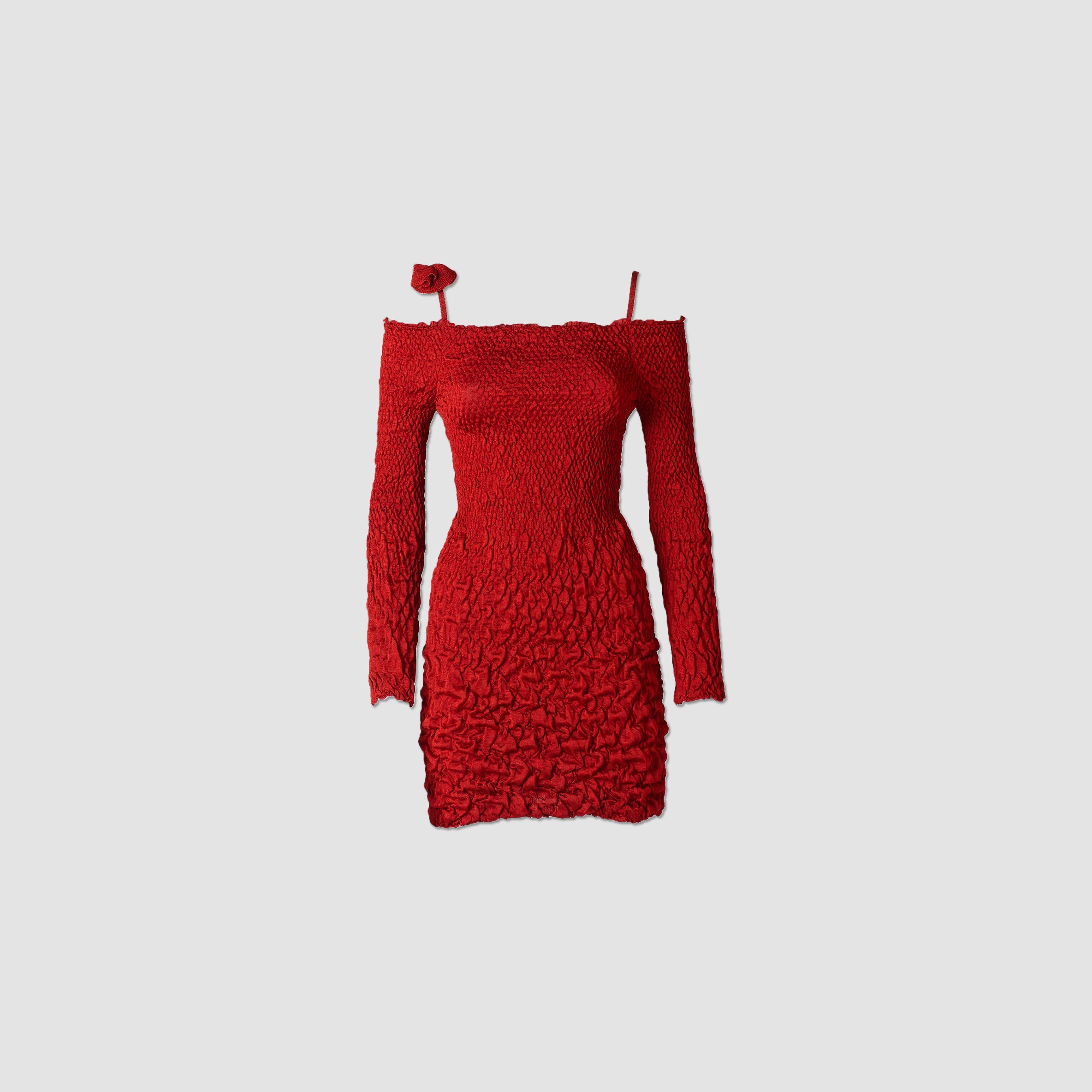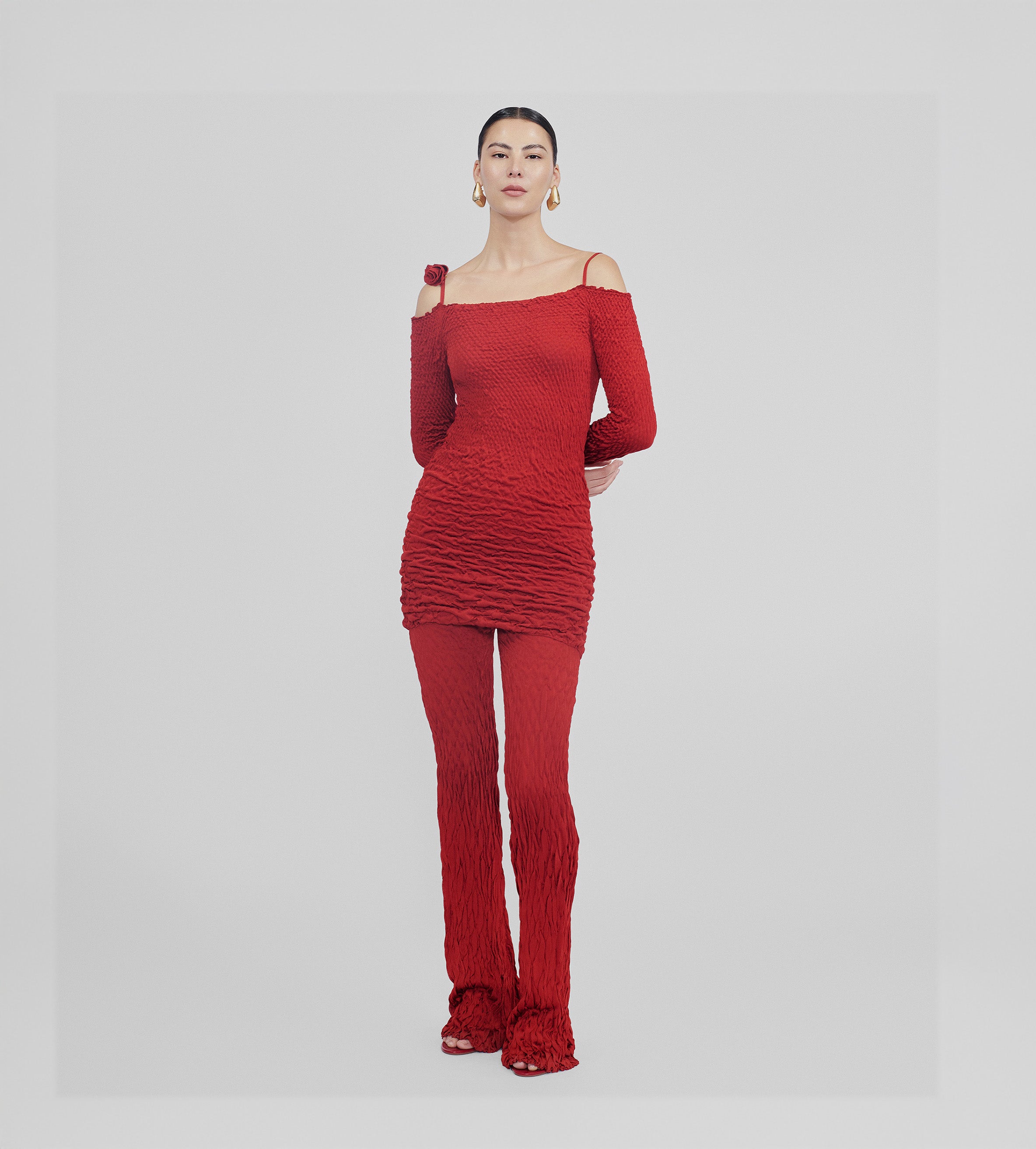 Off-shoulder mini dress crafted from our new textured knit fabric, featuring long sleeves, thin adjustable straps and a striking 3D knitted floral detail at the shoulder. This design beautifully evokes the dynamic texture of crashing waves, while drawing inspiration from the enchanting magic of the sea.