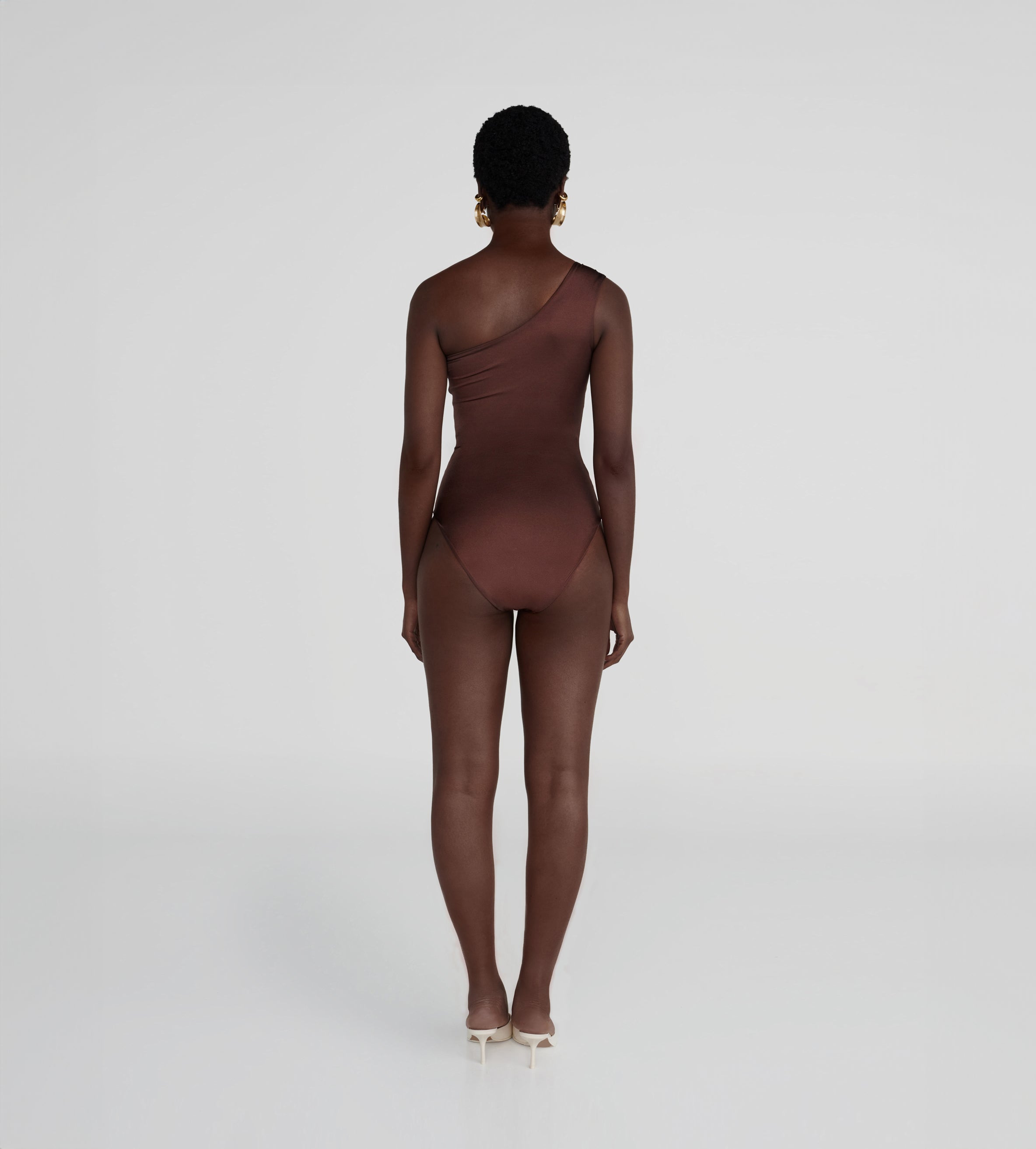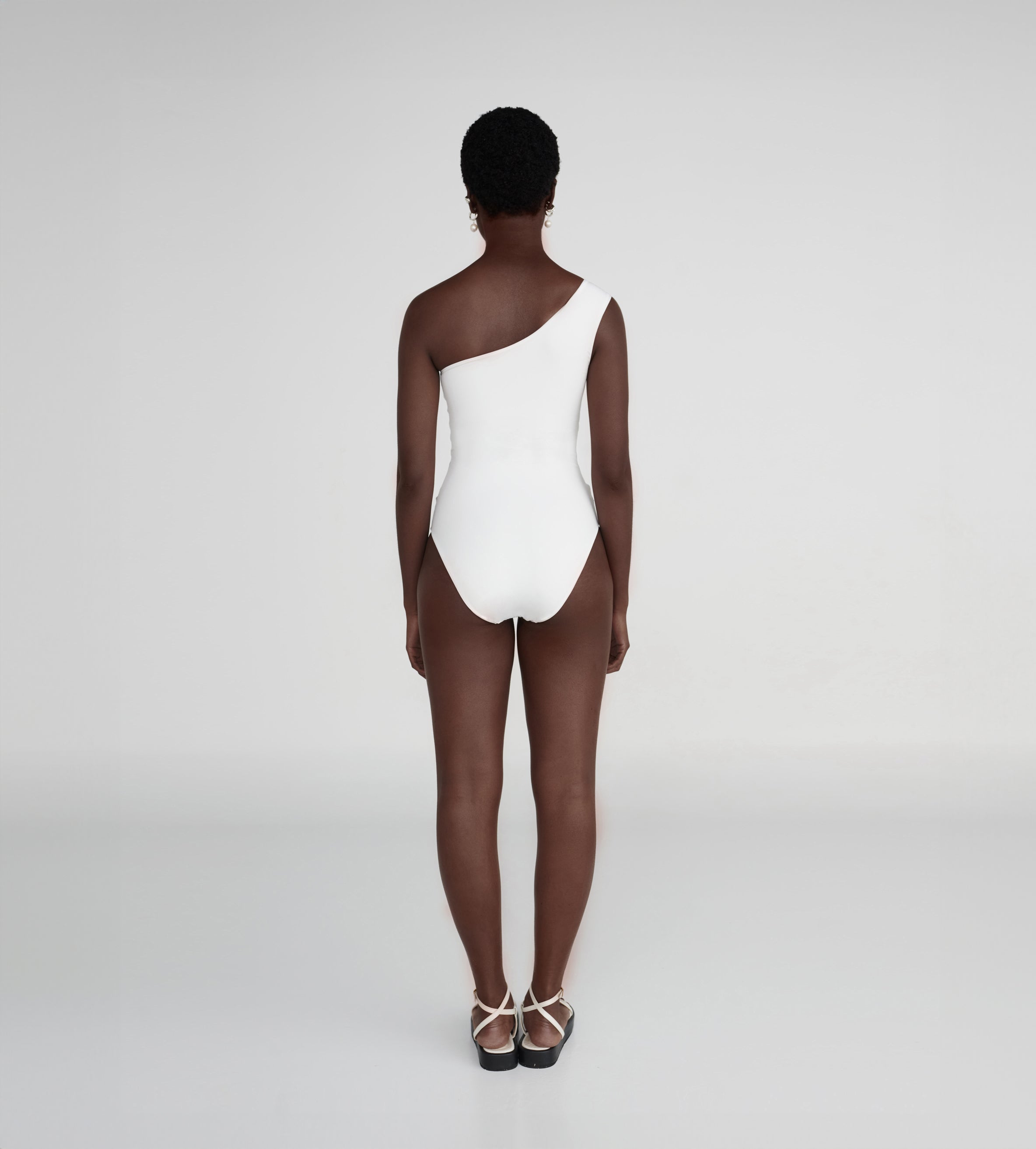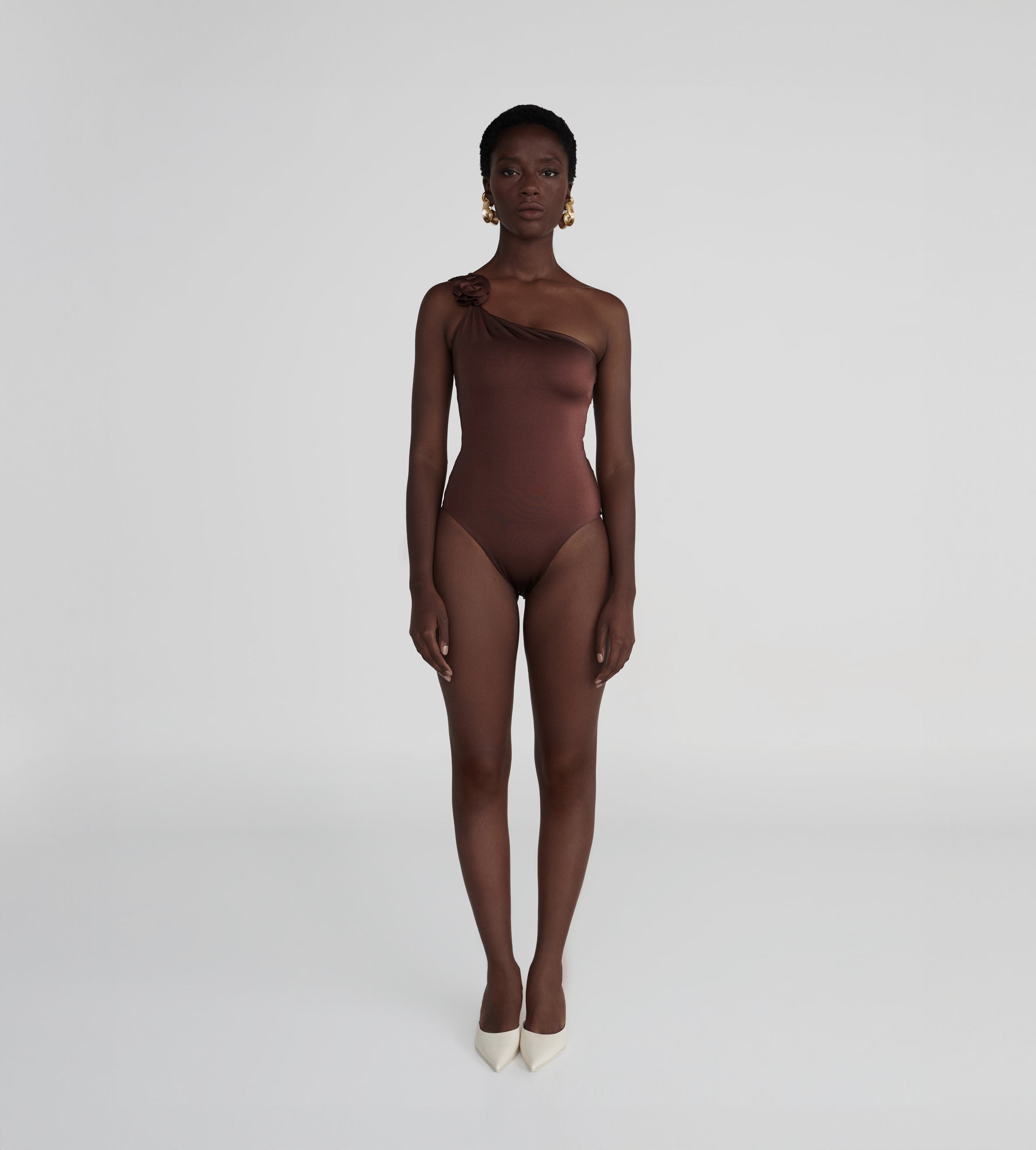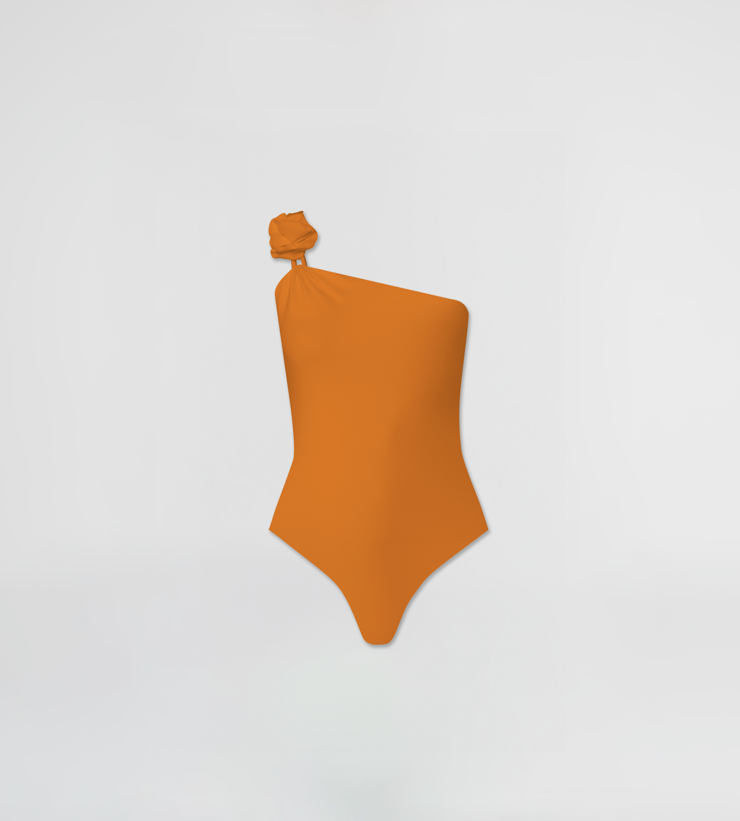 One-shoulder asymmetric one-piece with a 3D handmade flower detail, a sophisticated yet classical look perfect to be worn on every occasion.