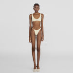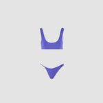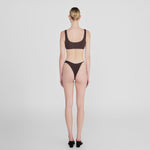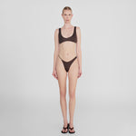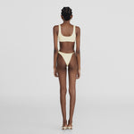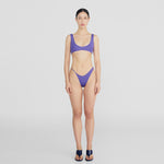 The Ago two-piece boasts a wide scoop neckline and back, offering a flattering, supportive fit, paired with asymmetric, high-leg, low-coverage bottom that elongates the figure.