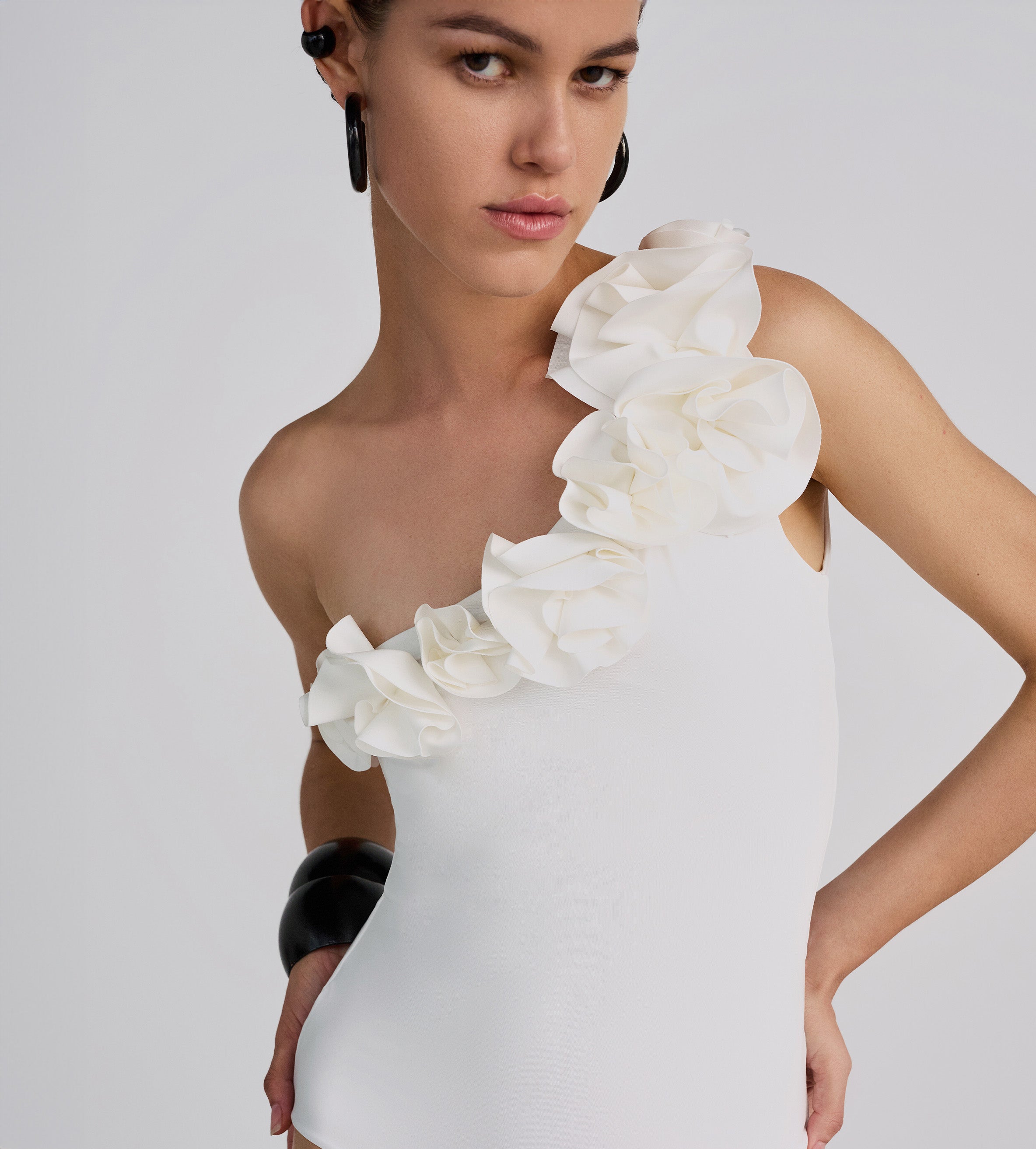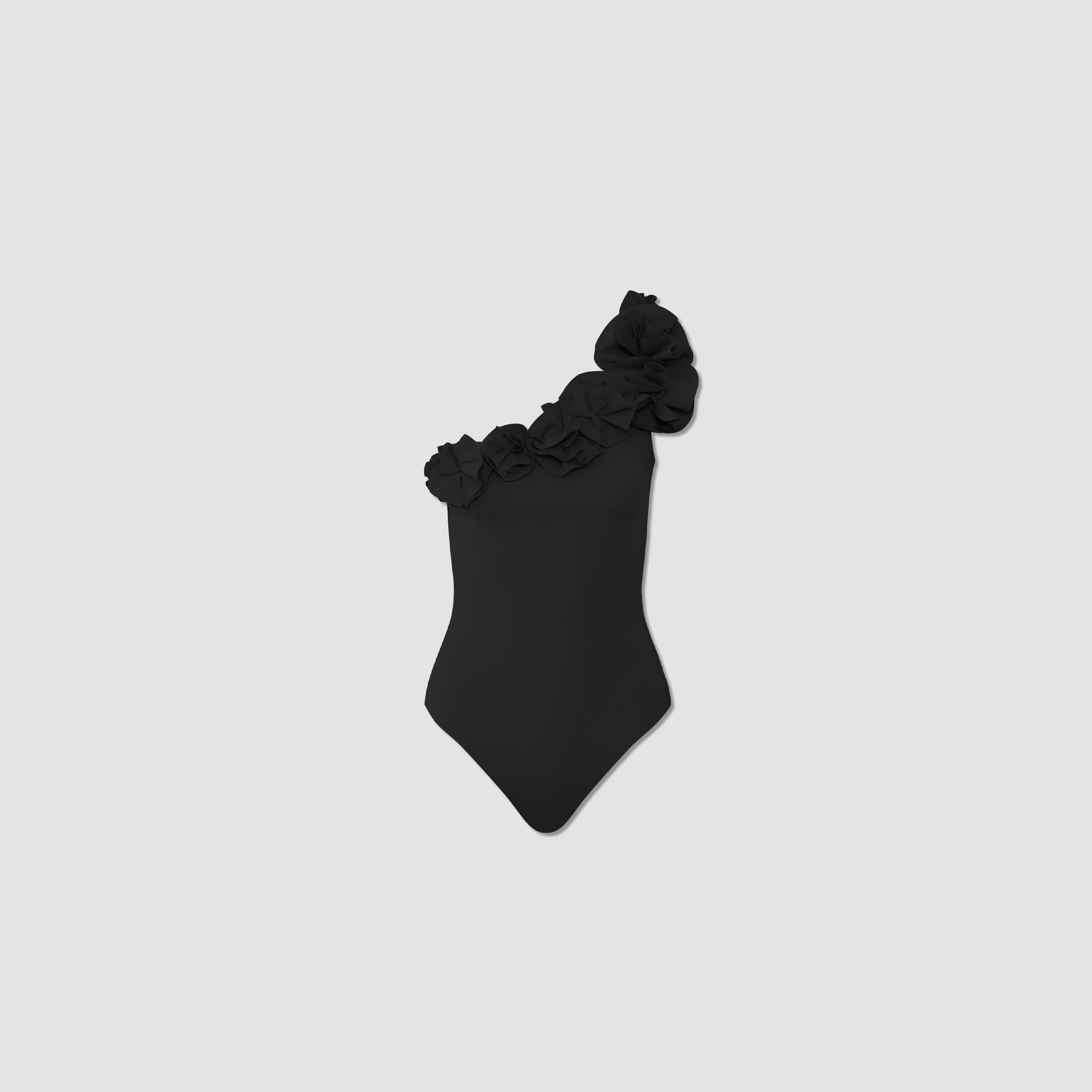 Traje de baño de una pieza, con escote asimétrico de un solo hombro, abertura profunda en espalda y detalle de cascada de flores hechas a mano en delantero; tu compañero ideal para un look de día y de noche.