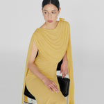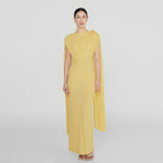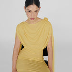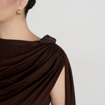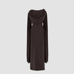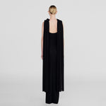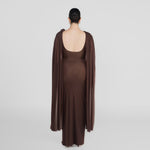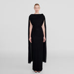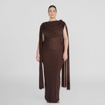 The Batista long dress boasts a softly draped cowl scoop neckline and a deep, round open back, followed by flowing shoulder sashes that cascade into a sleek, column-shaped silhouette.