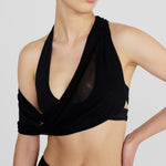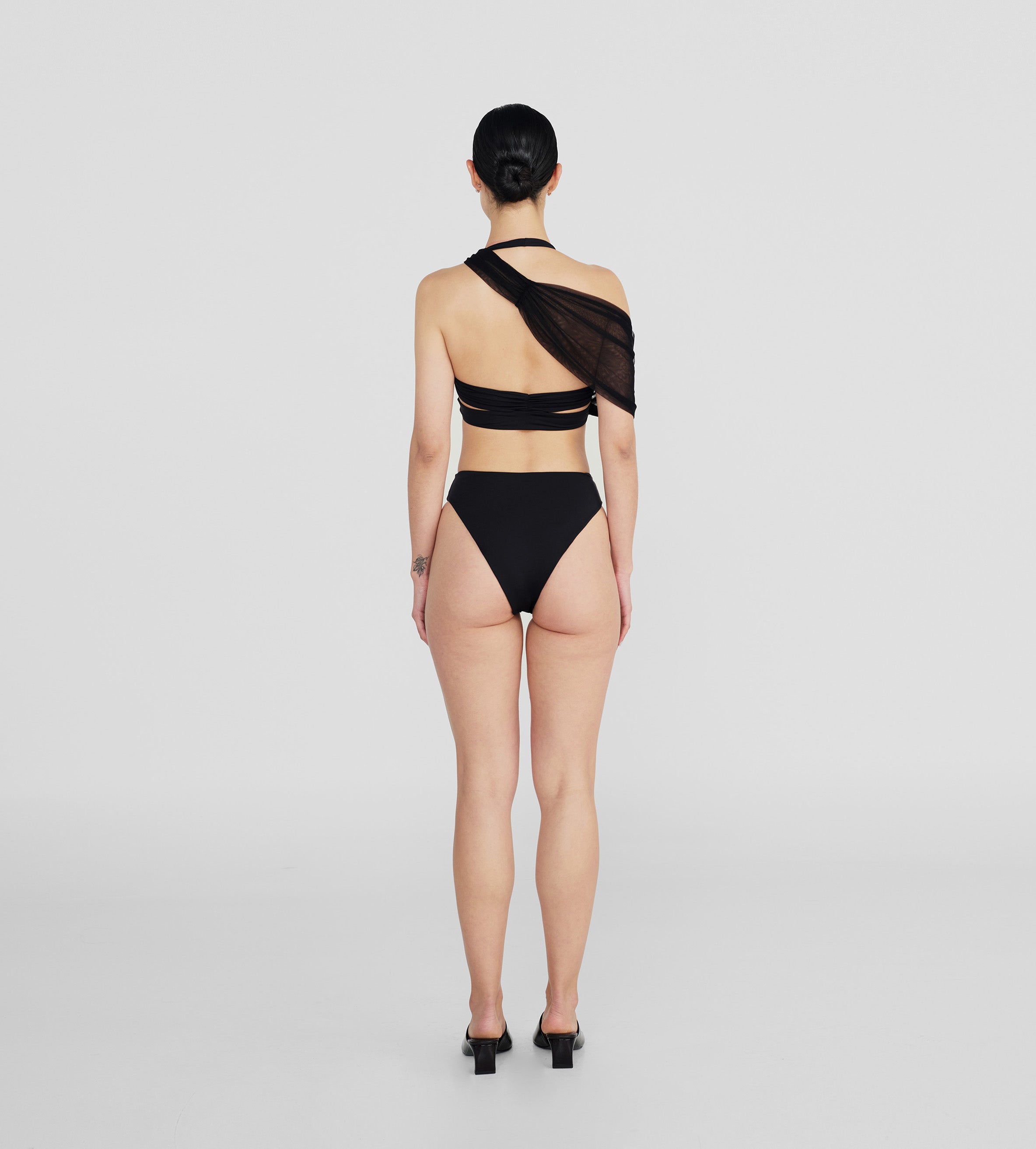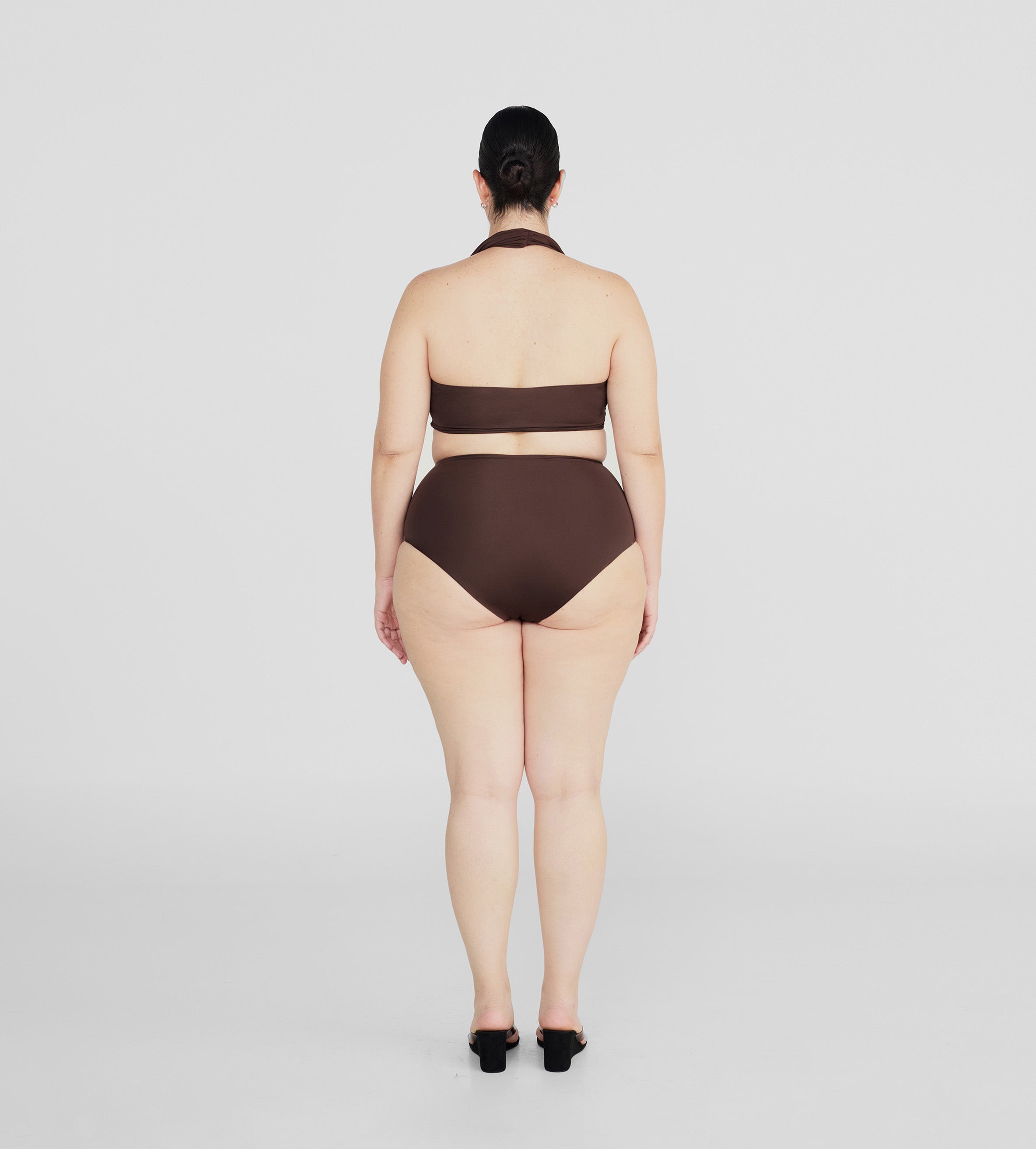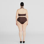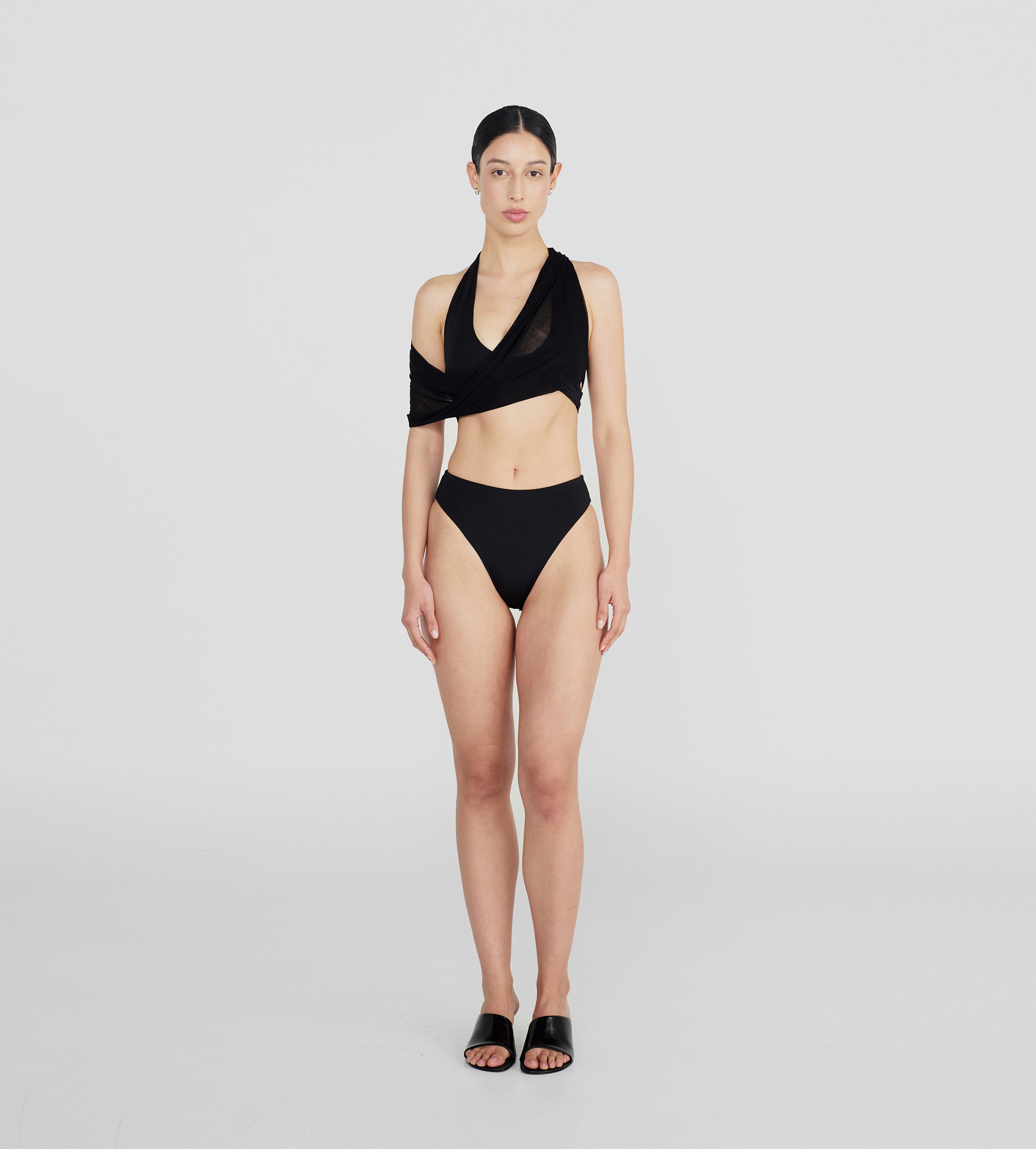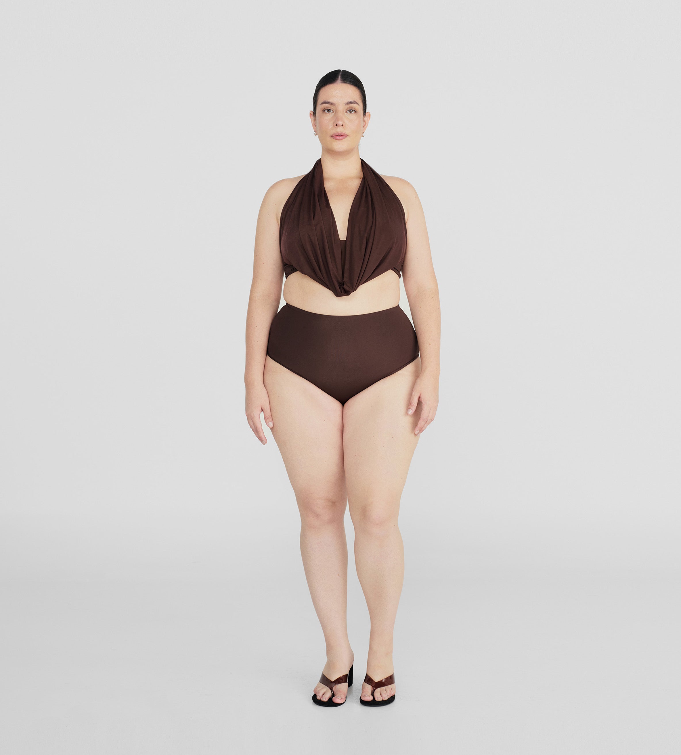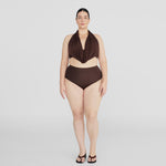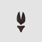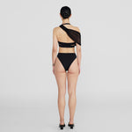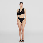 The Giglio two-piece features a dramatic, plunging cowl front made of two layers for versatile styling, finished with an open back accented by criss-cross cutouts, paired with high-rise, high-leg bottoms.