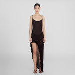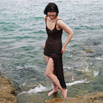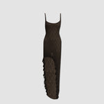 The Isla Bonita dress features a graceful scoop neckline with delicate, thin straps, and a figure-hugging silhouette that gently flows into a cascading asymmetric skirt. Crafted from a structured Italian knit with a luxurious feel that drapes beautifully, exuding both elegance and effortless movement.