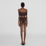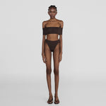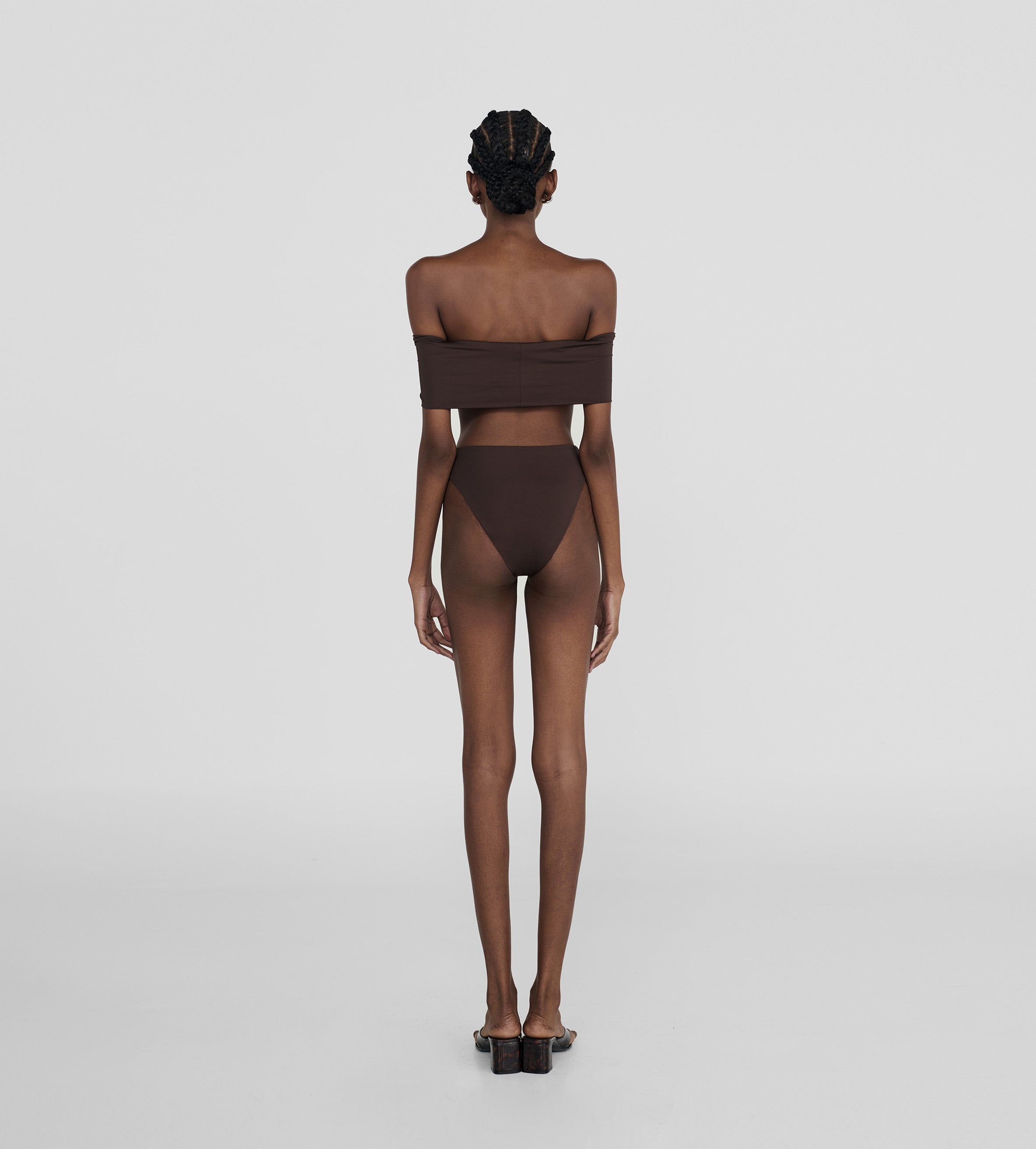 The Lumea two-piece boasts a double-layered, off-shoulder bandeau top, paired with high-rise, high-leg bottoms.
