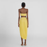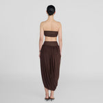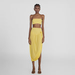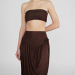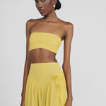 The Noriega set features a ruched, strapless tube-top paired with a long skirt, designed with a V-shape finish at front that flows into a twisted, draped silhouette, with a sensual side slit and 3D floral detail at the waist.