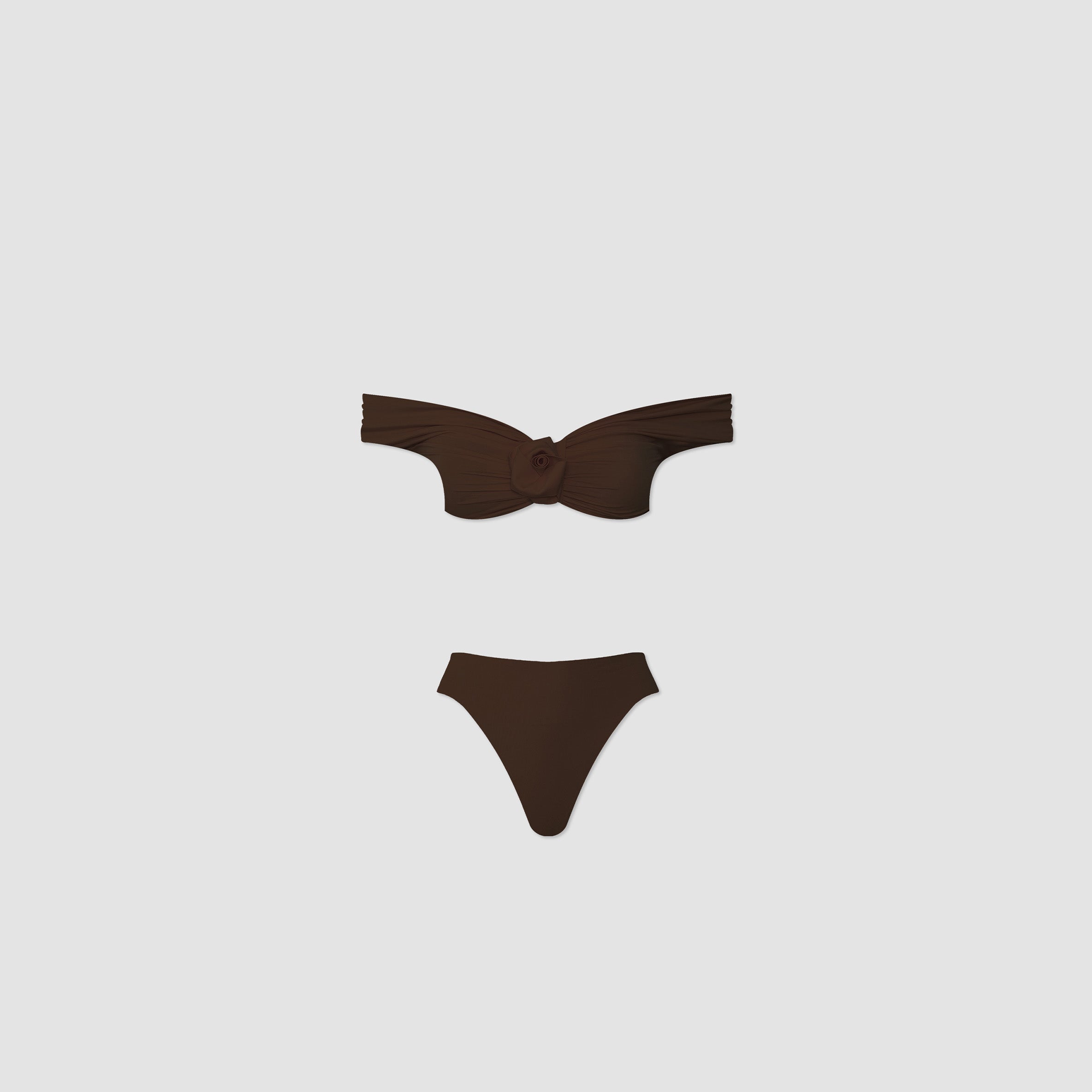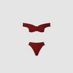Our Sauco two piece offers a modern twist on a vintage silhouette. Featuring an off-shoulder heart neckline top with arm-side ruching and a central 3D flower detail. Paired with a high-rise briefs featuring a deep cut-leg.