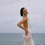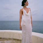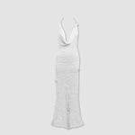 The Tal Para Cual long dress, crafted from an exquisite, delicately floral-textured Italian knit with body-contouring softness, seamlessly blends a dramatic deep cowl neckline with delicate, thin straps that tie gracefully at the neck. Its sleek mermaid silhouette is elegantly complemented by a striking open back, adorned with strategically placed 3D floral accents that highlight our new floral design.