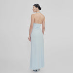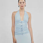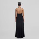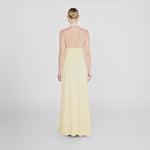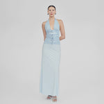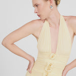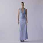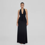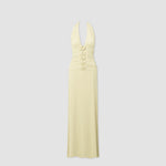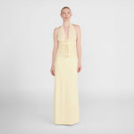 Our Villadiego dress perfectly blends our two most iconic fabrics. This long halter dress features a deep V neckline with a softly draped bust and strategically ruched straps that elegantly sculpt the body. A cascade of handmade flowers that gracefully embellish the design, showcasing our new floral creation. The draped open back and sleek A-line skirt complete this ensemble.
