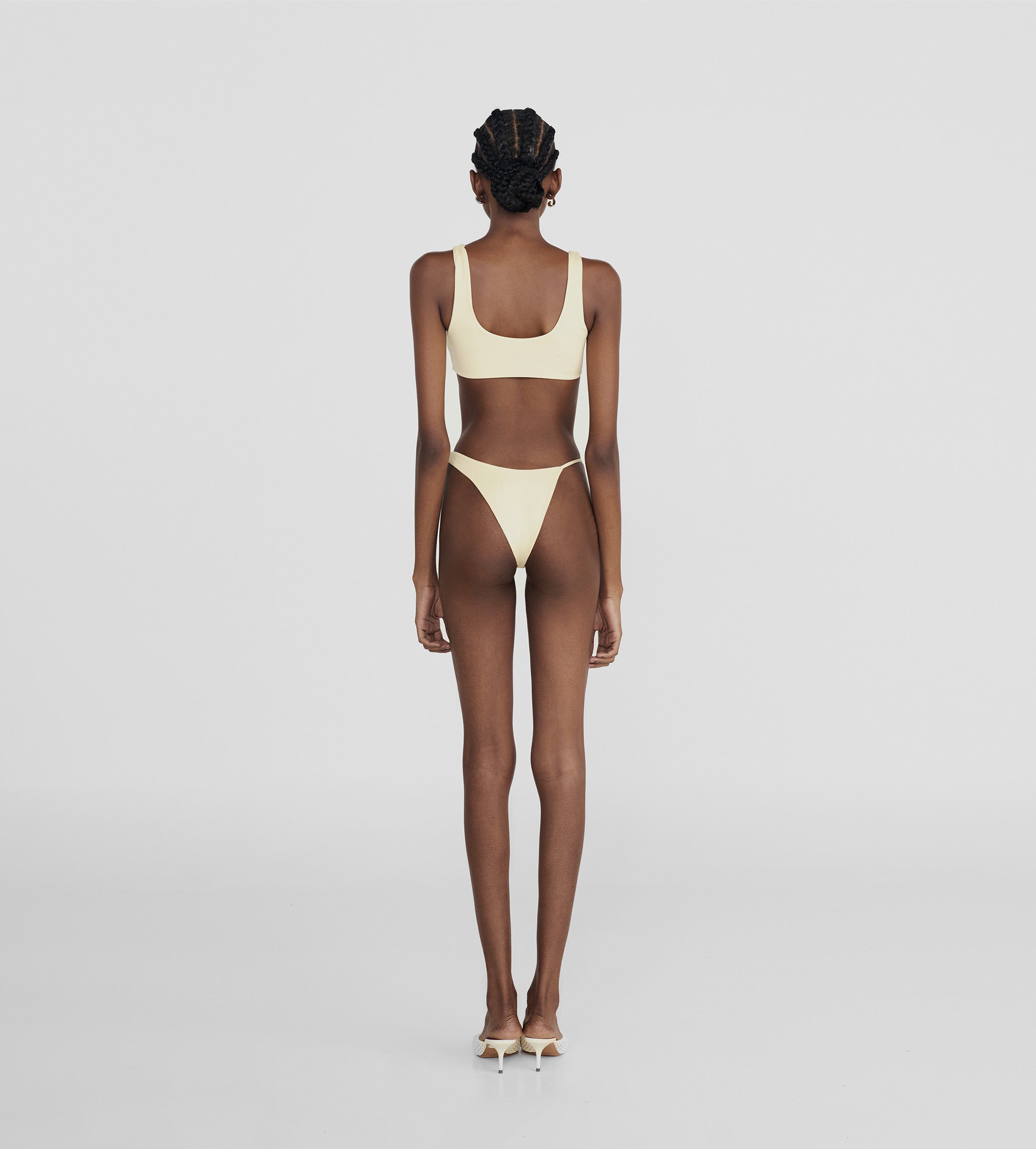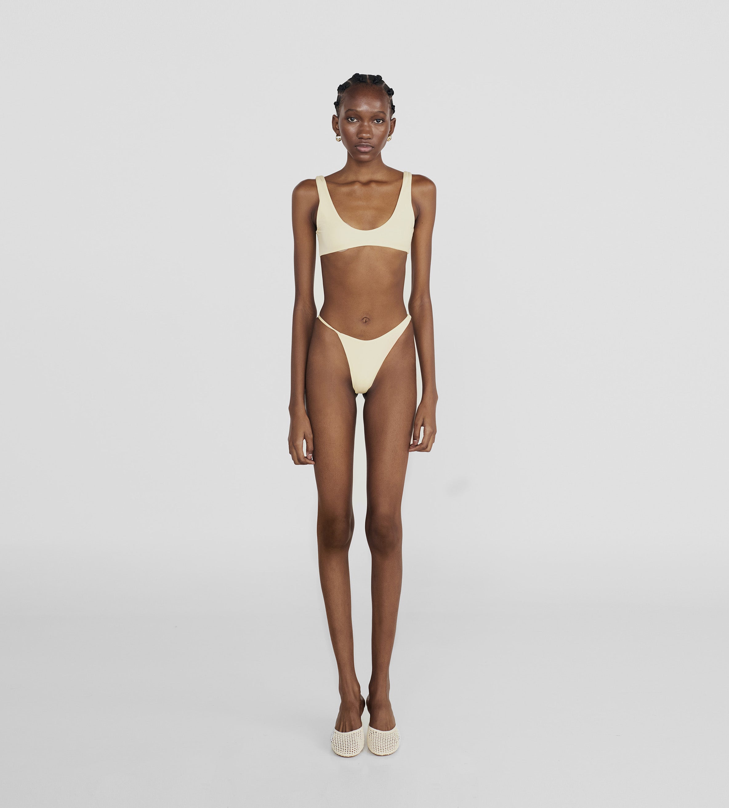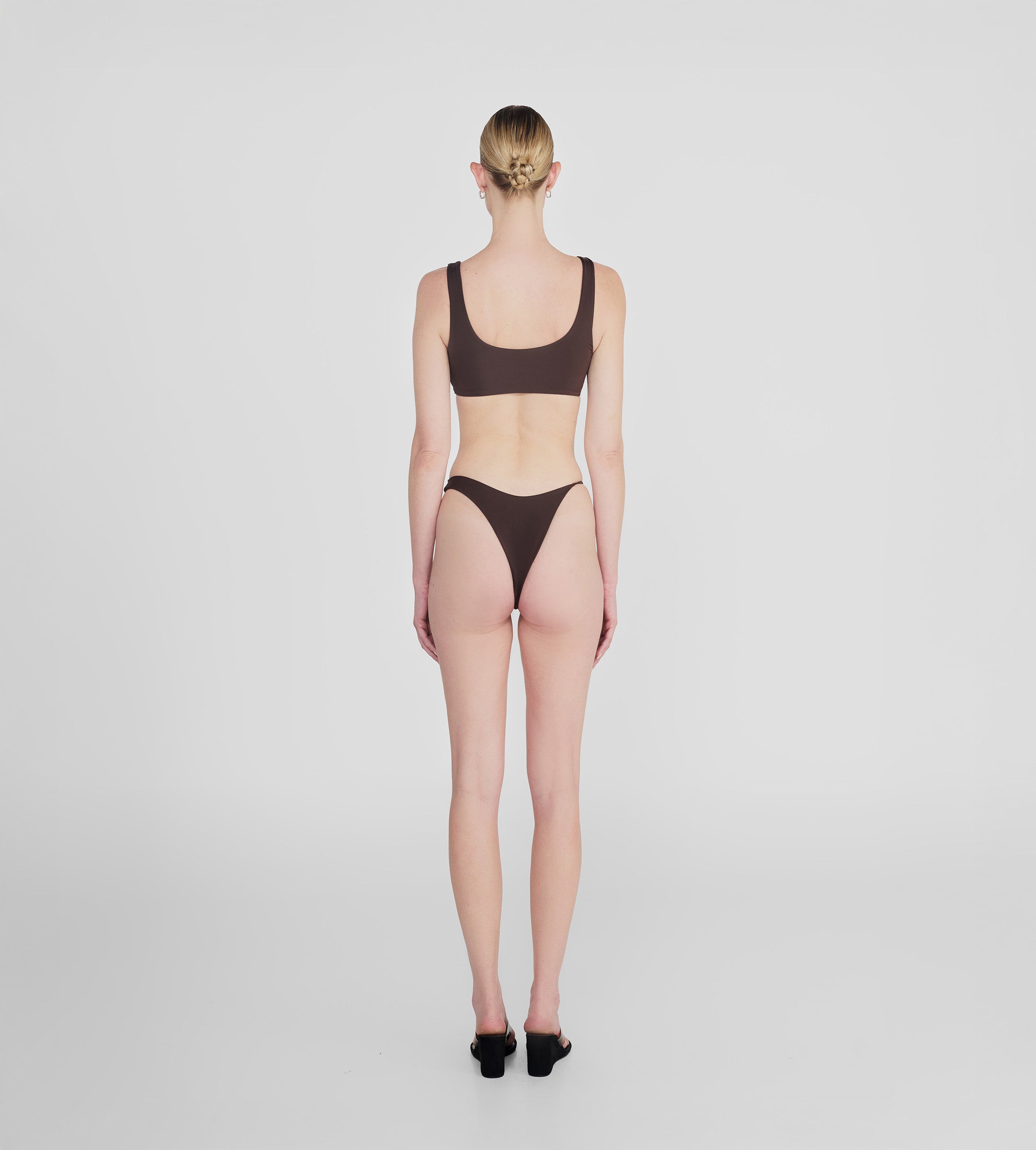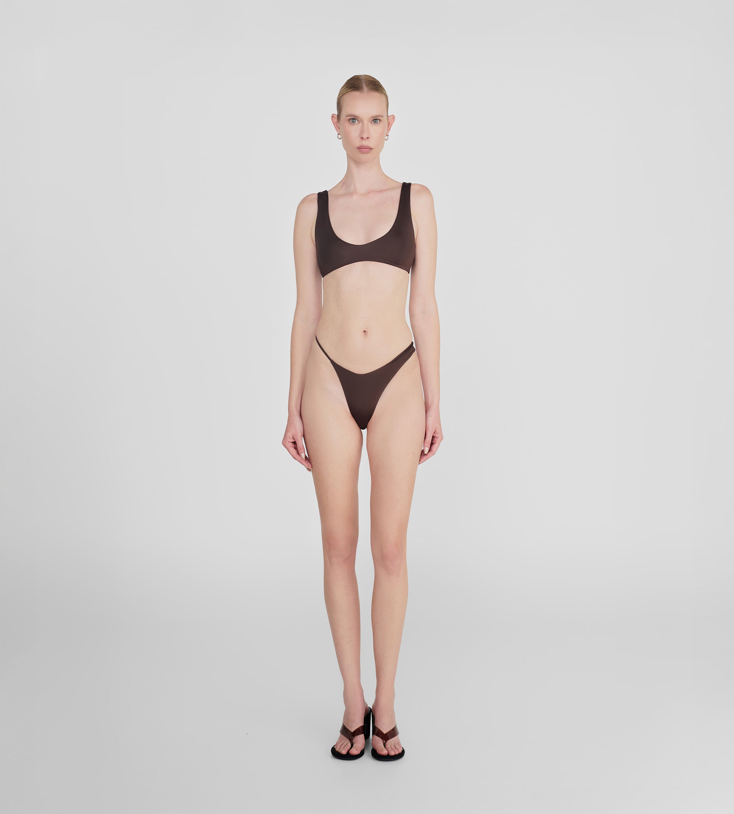 The Ago two-piece boasts a wide scoop neckline and back, offering a flattering, supportive fit, paired with asymmetric, high-leg, low-coverage bottom that elongates the figure.