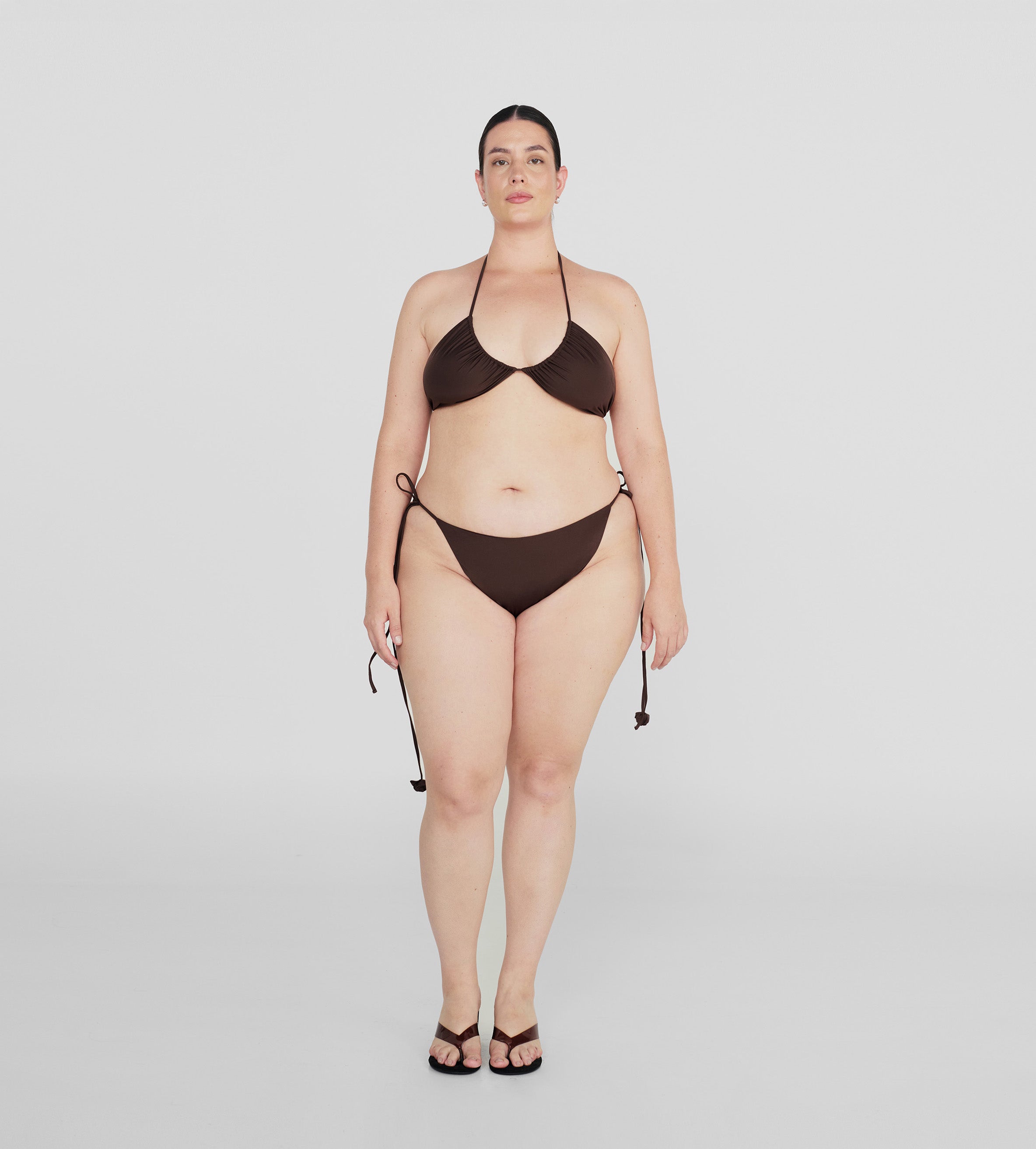 The Arazo two-piece highlights softly ruched cups and ultra-thin straps for versatile styling, paired with low-rise bottoms featuring delicate side ties, adorned with rosebud accents.