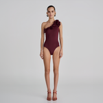 Traje de baño de una pieza, con escote asimétrico de un solo hombro, abertura profunda en espalda y detalle de cascada de flores hechas a mano en delantero; tu compañero ideal para un look de día y de noche.