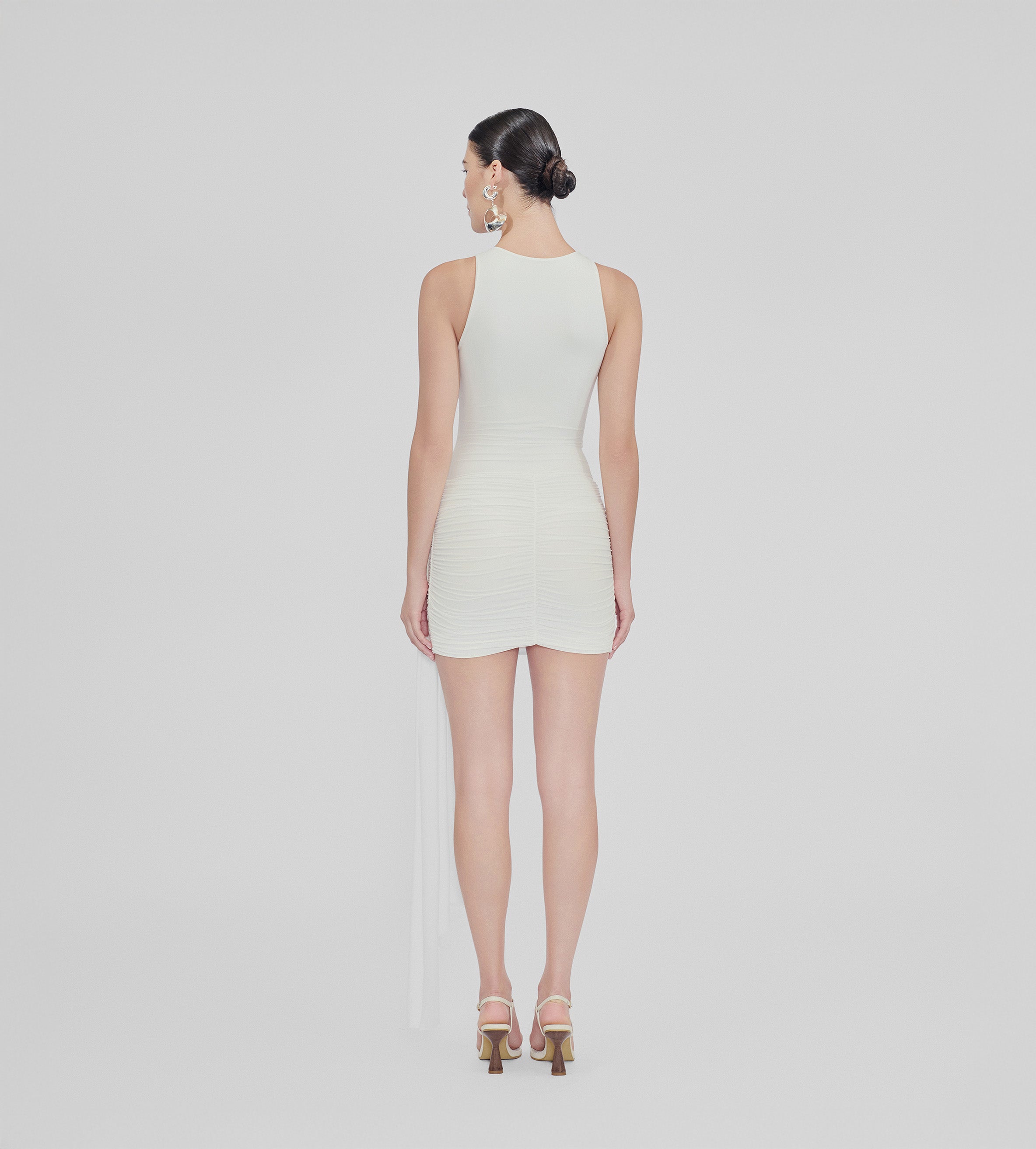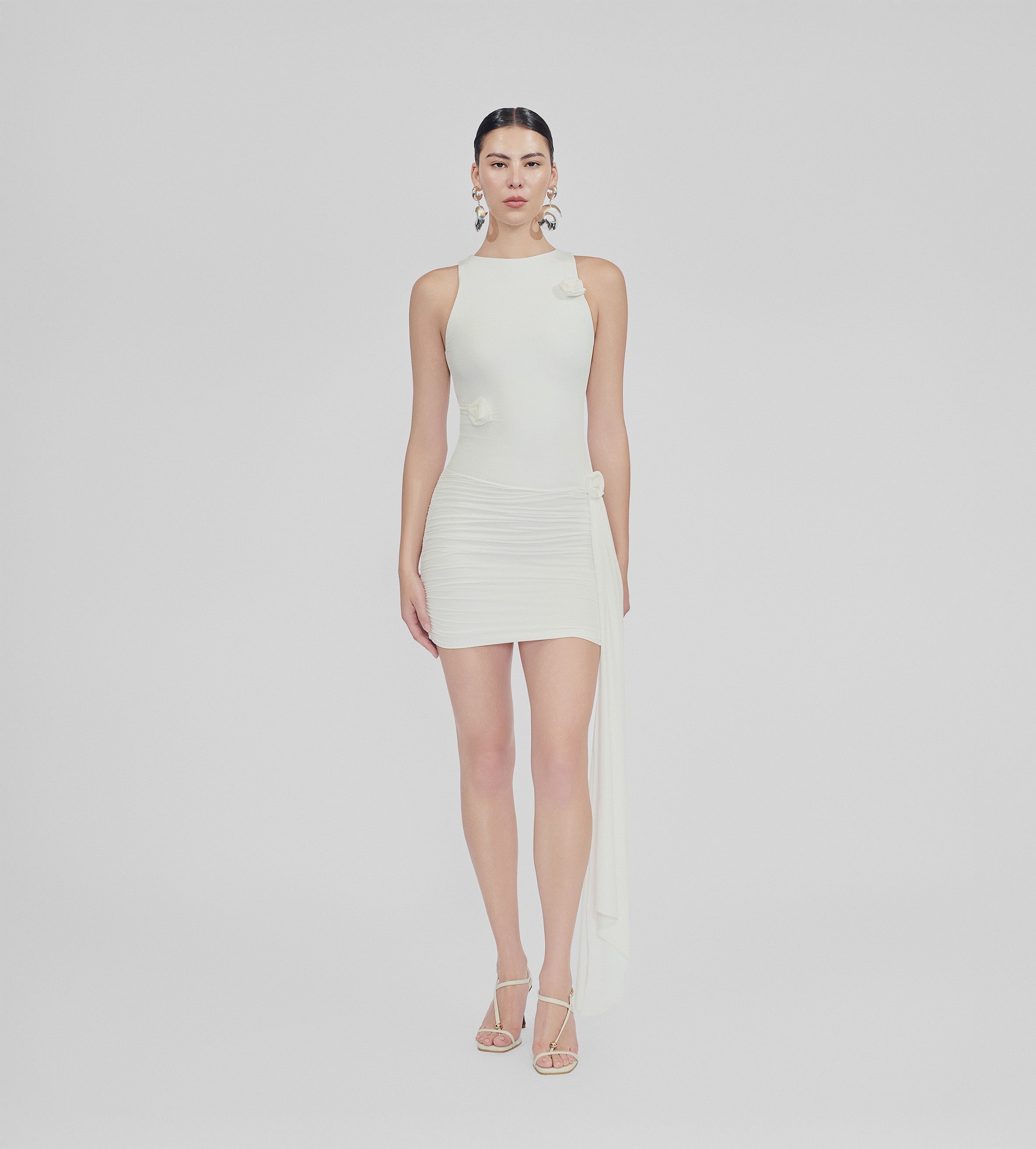 Our Azahar mini dress, crafted from our iconic stretch fabric, features a high round neckline and a form-fitting silhouette enhanced by memory-shape technology. The mini draped skirt cascades with single draping at the front and double draping at the back, beautifully accentuating the natural curves of the body. The look is completed with a side sash and strategically placed 3D handmade flowers.
