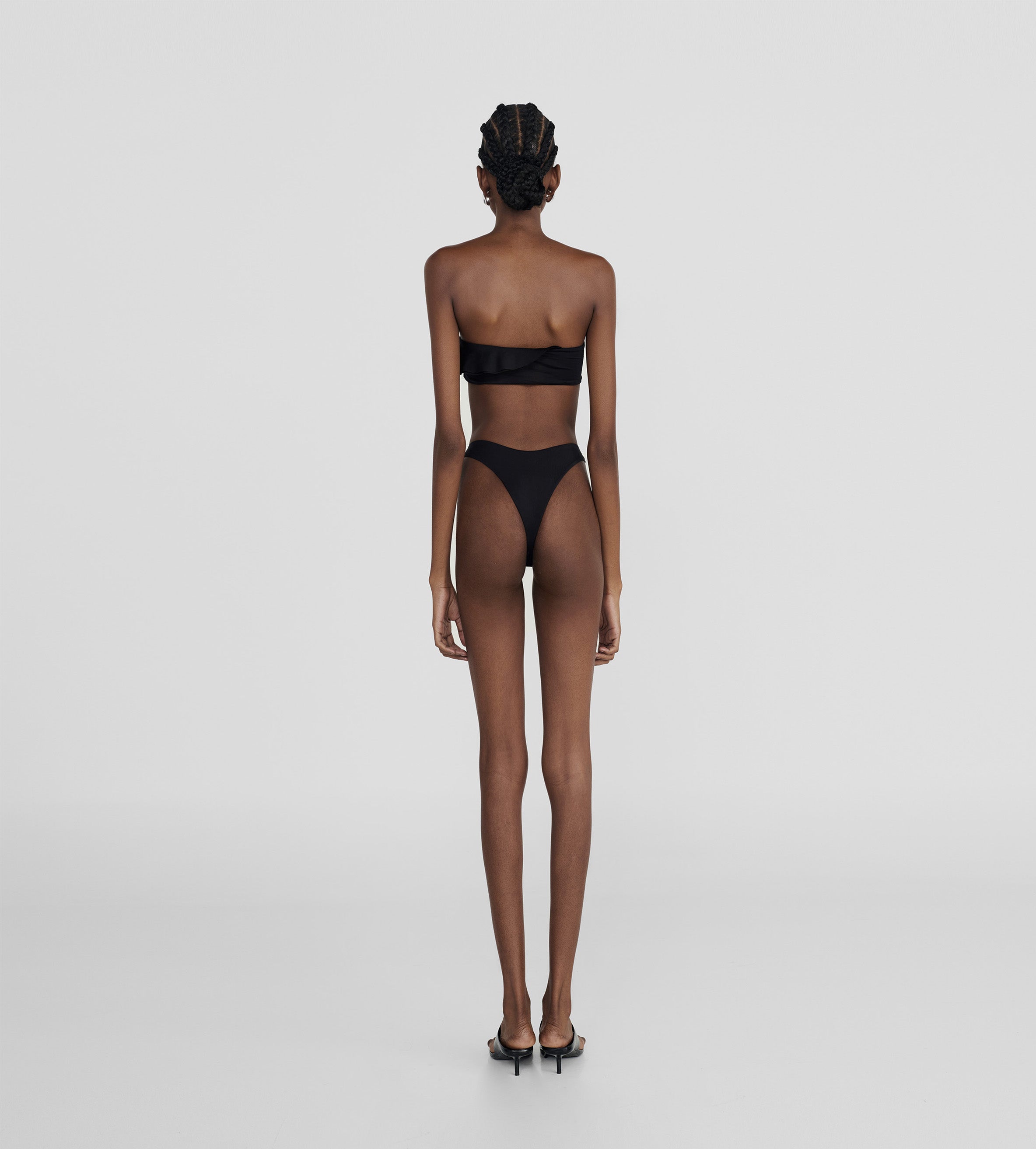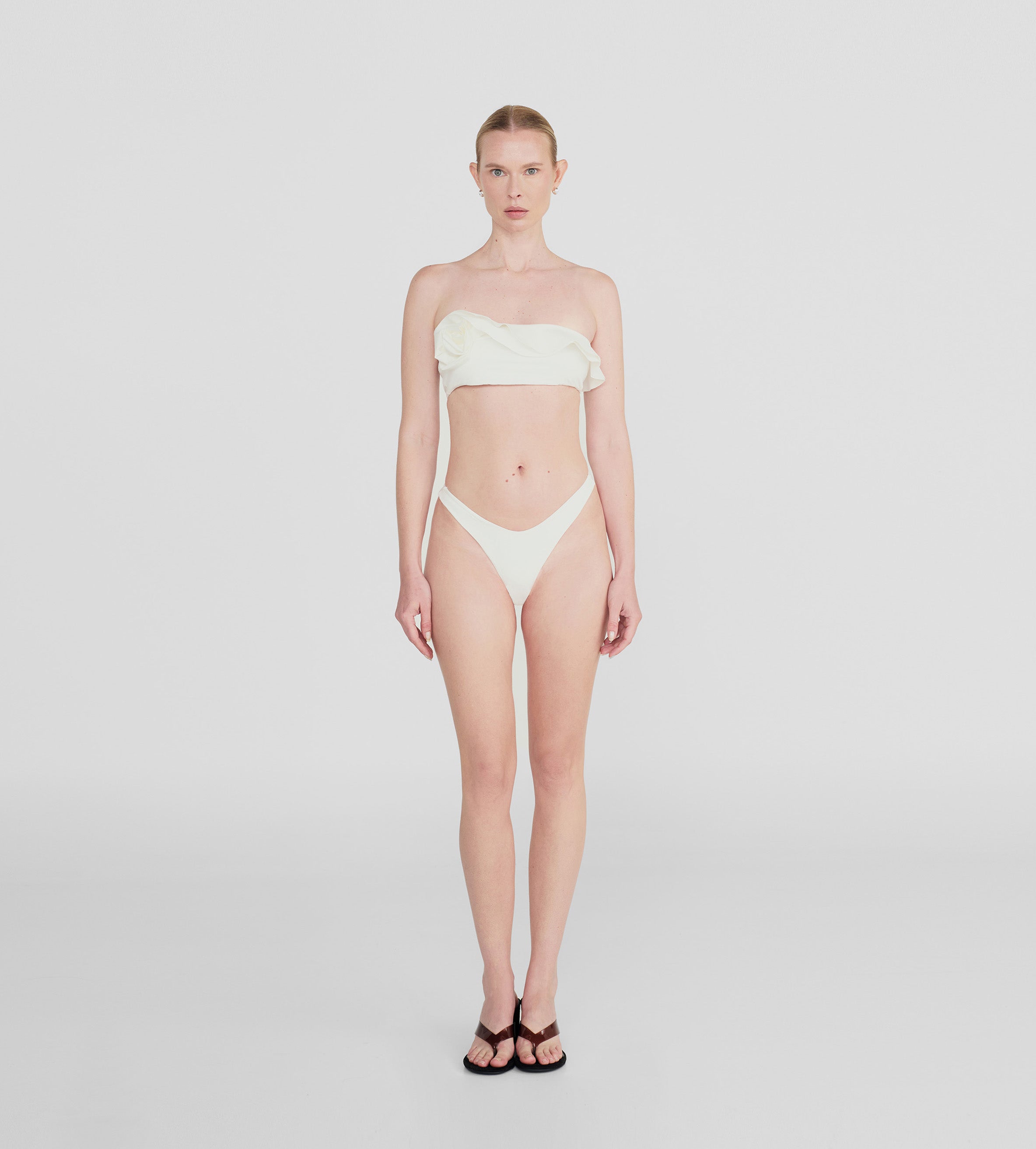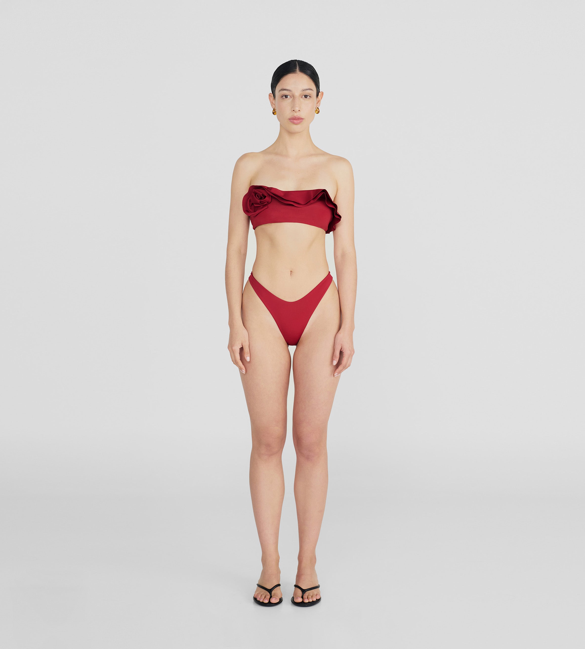 The Bies two-piece showcases a bandeau top, adorned with an asymmetric ruffle that blooms into a delicate 3D floral side detail, paired with a high-leg, seamless fit, clean-cut bottom that elongates the figure.