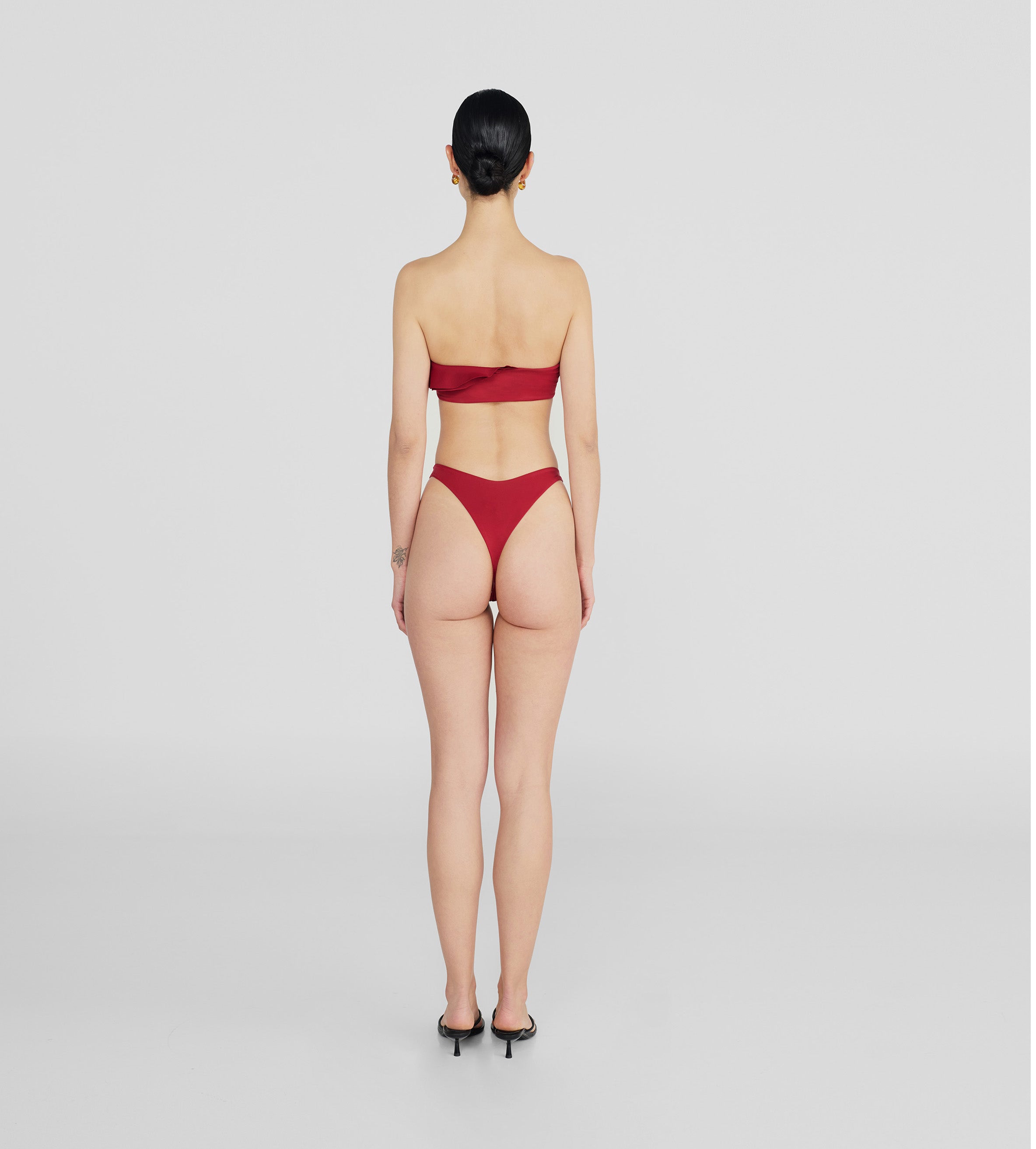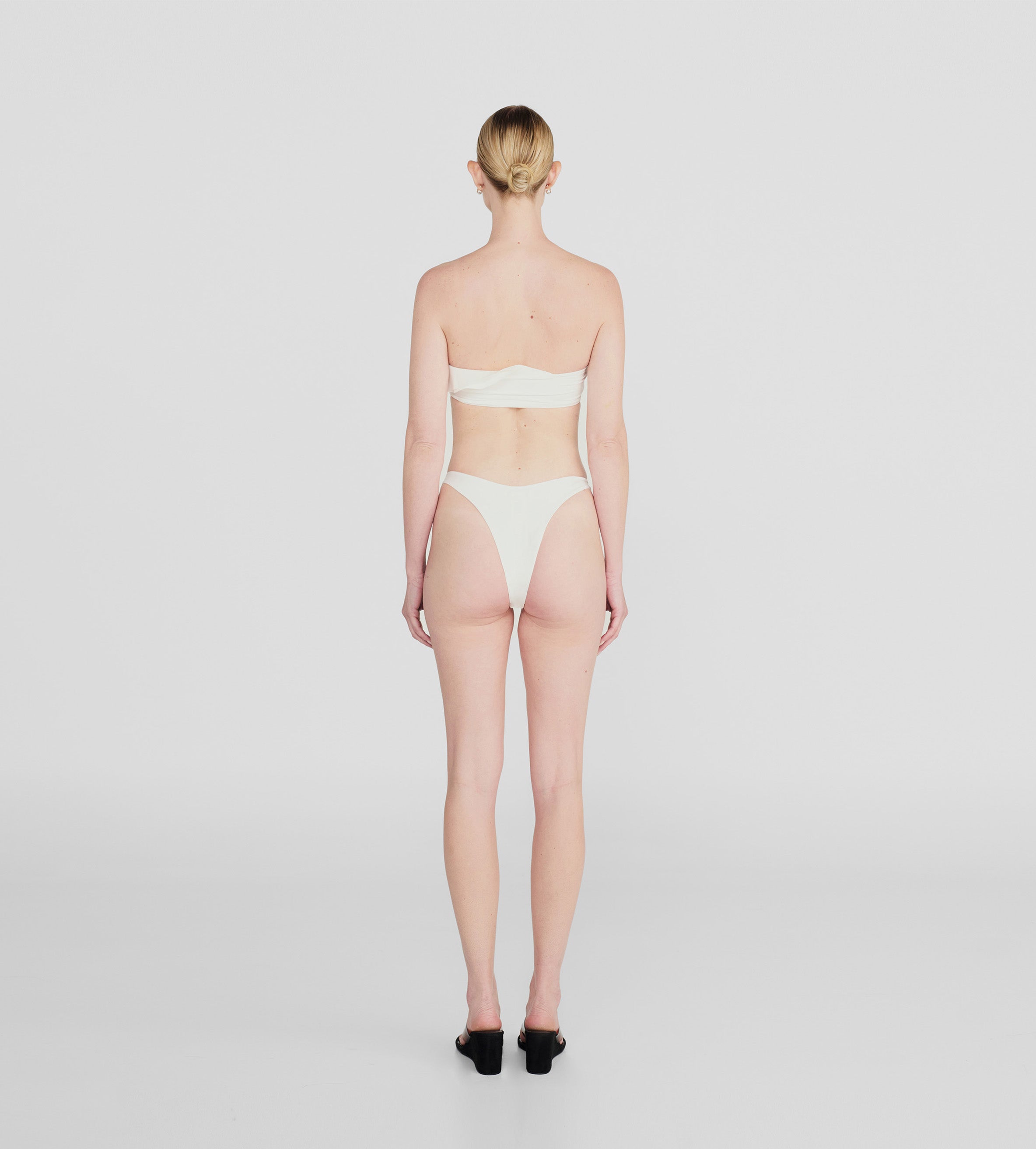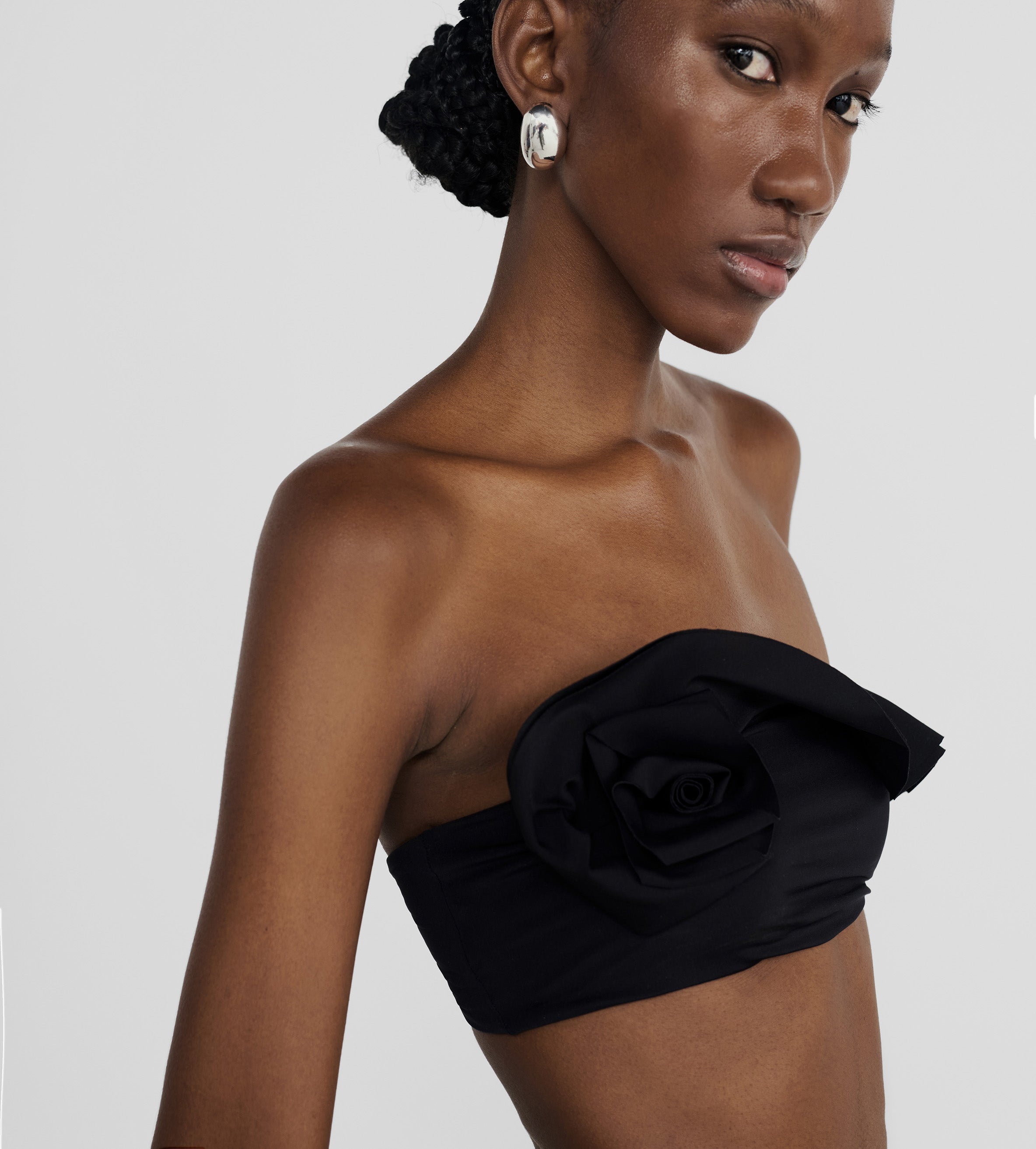 The Bies two-piece showcases a bandeau top, adorned with an asymmetric ruffle that blooms into a delicate 3D floral side detail, paired with a high-leg, seamless fit, clean-cut bottom that elongates the figure.