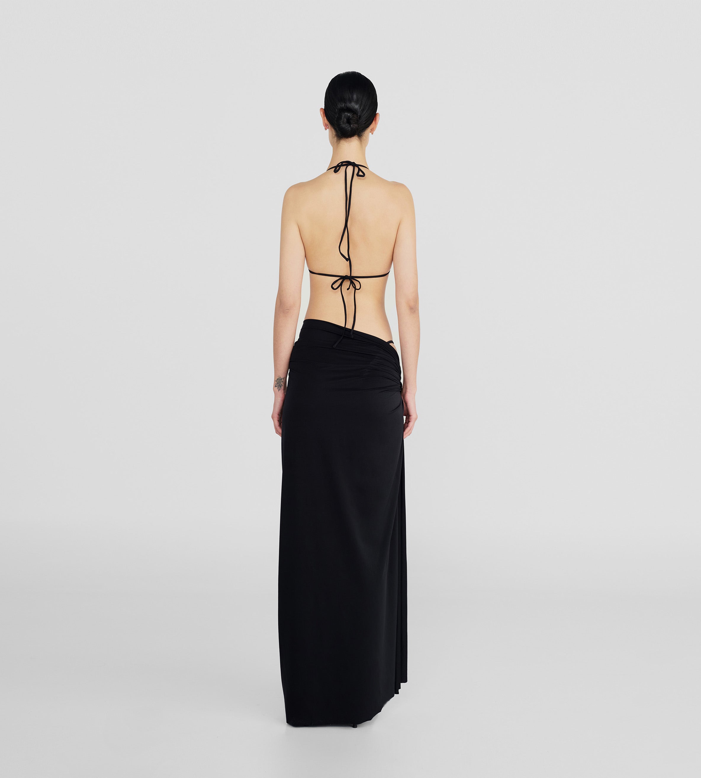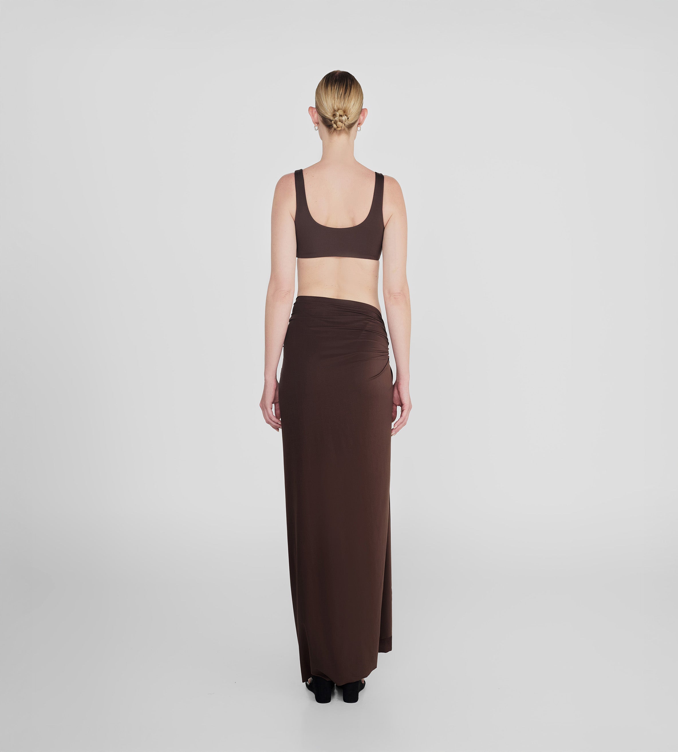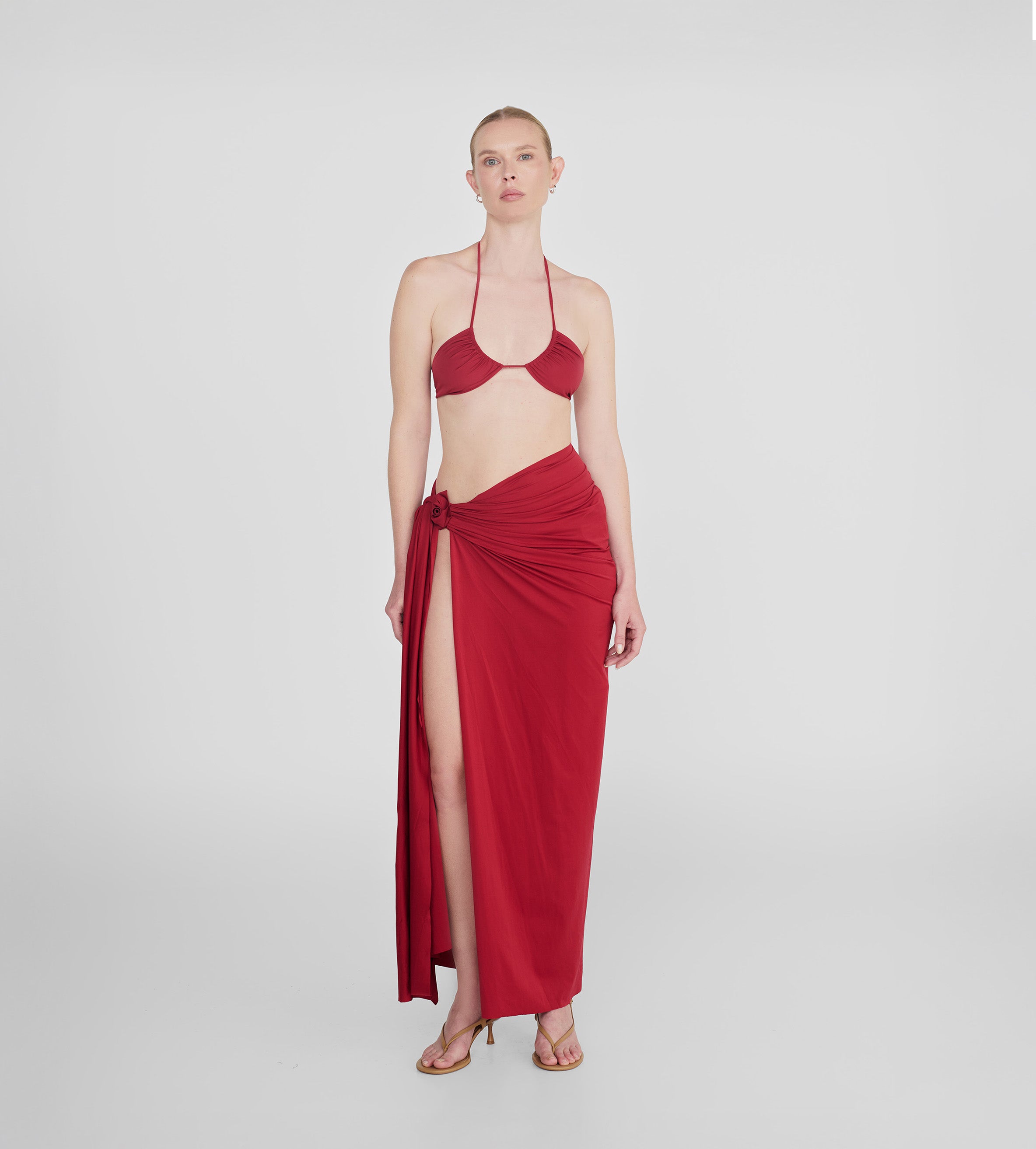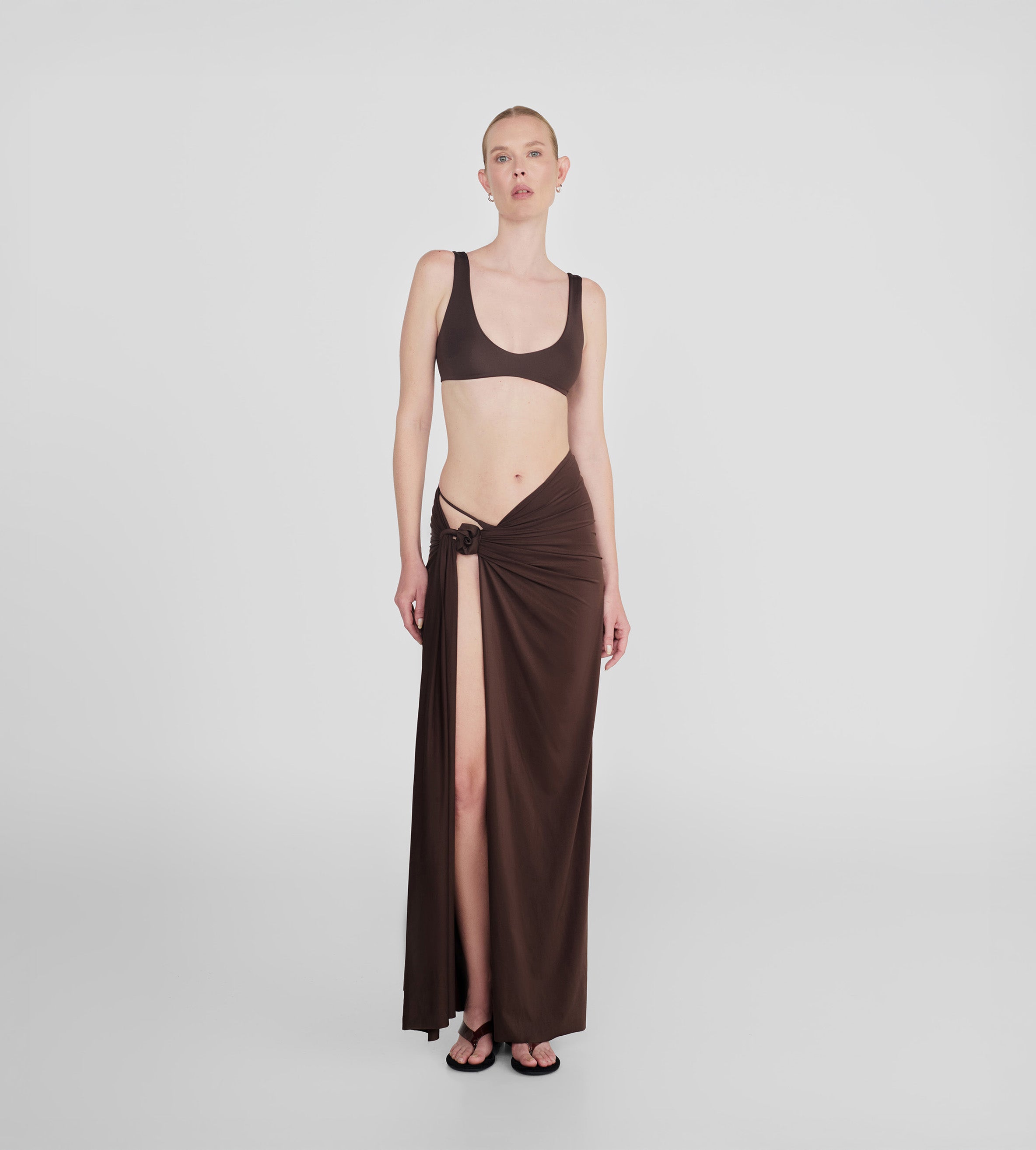 The Capella pareo skirt features an asymmetric, ruched waistband that flows into a front knot loop, adorned with a 3D floral embellishment.