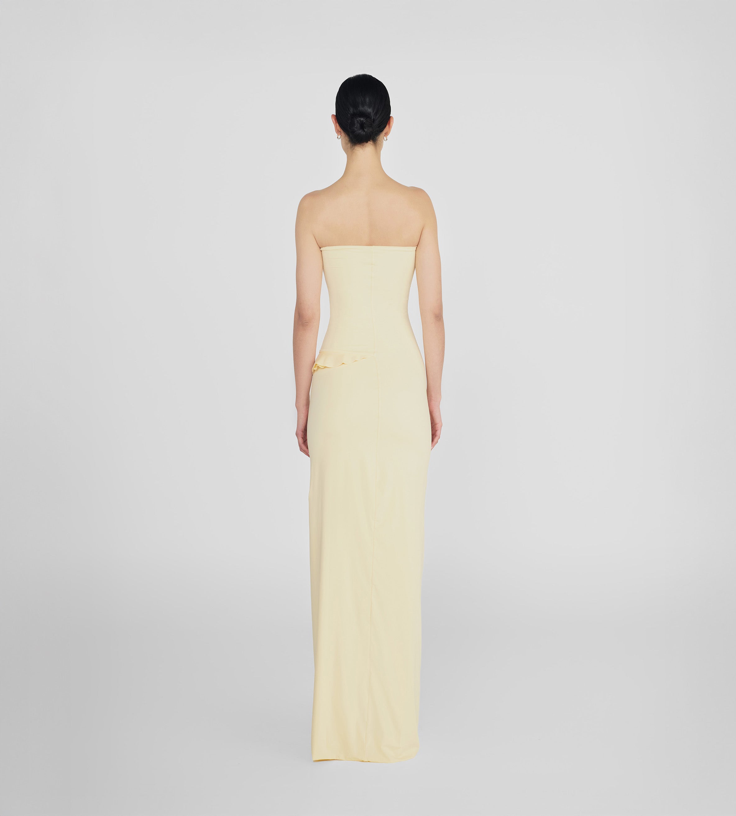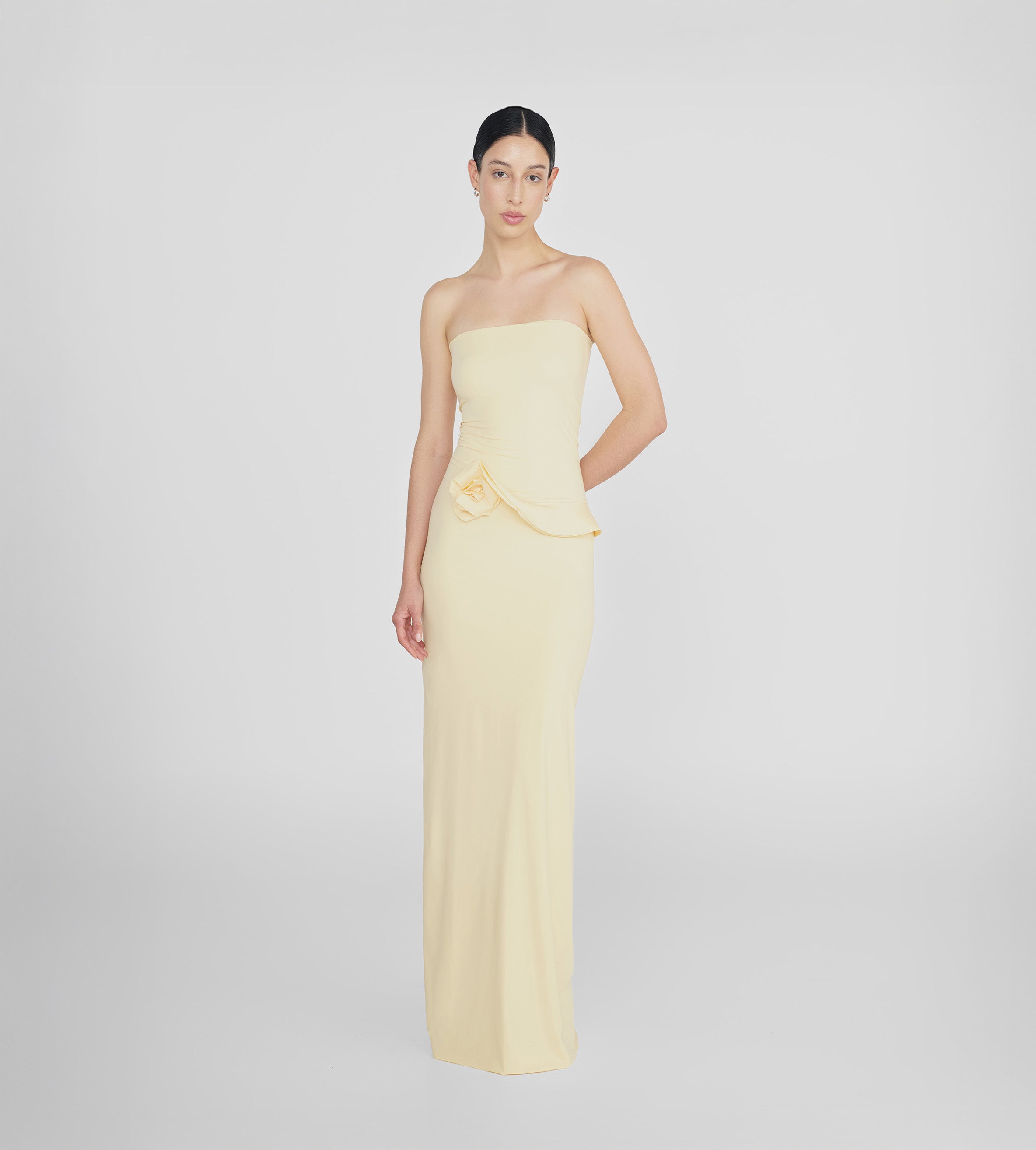 The Caracola dress boasts a sleek, strapless neckline, and a cinched silhouette that flows into a column-style skirt, accented by an asymmetric ruffle at the waist that unfurls into a delicate 3D floral embellishment on the side.