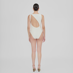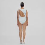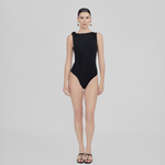 The Claver one-piece seamlessly blends elegance and modernity, featuring a flattering boat neckline and delicate shoulders adorned with our new 3D floral embellishment. The design is elevated by an asymmetric, sensuous drop-shaped open back. Its minimalist aesthetic effortlessly complements any ensemble, making it a versatile addition to your wardrobe.