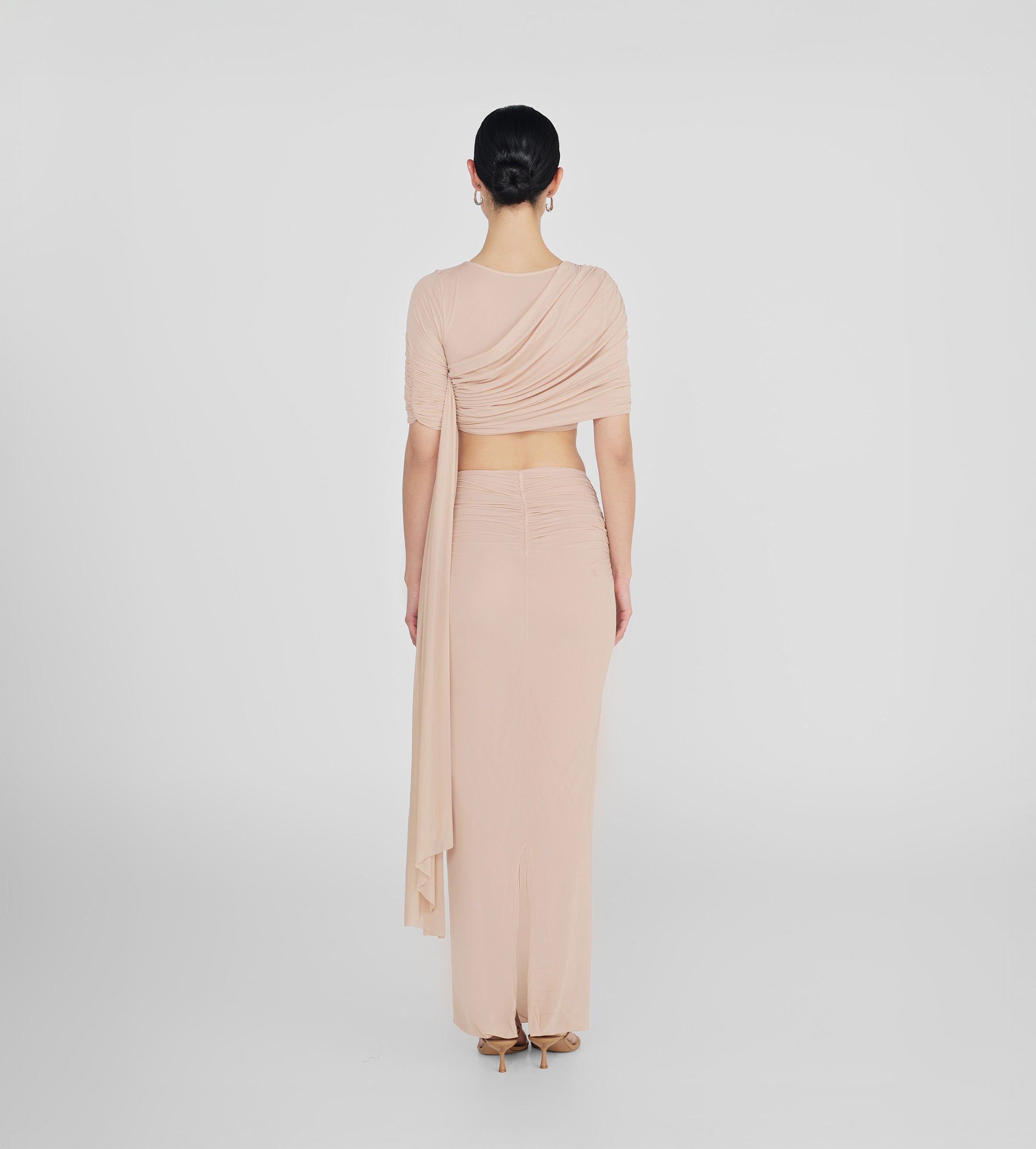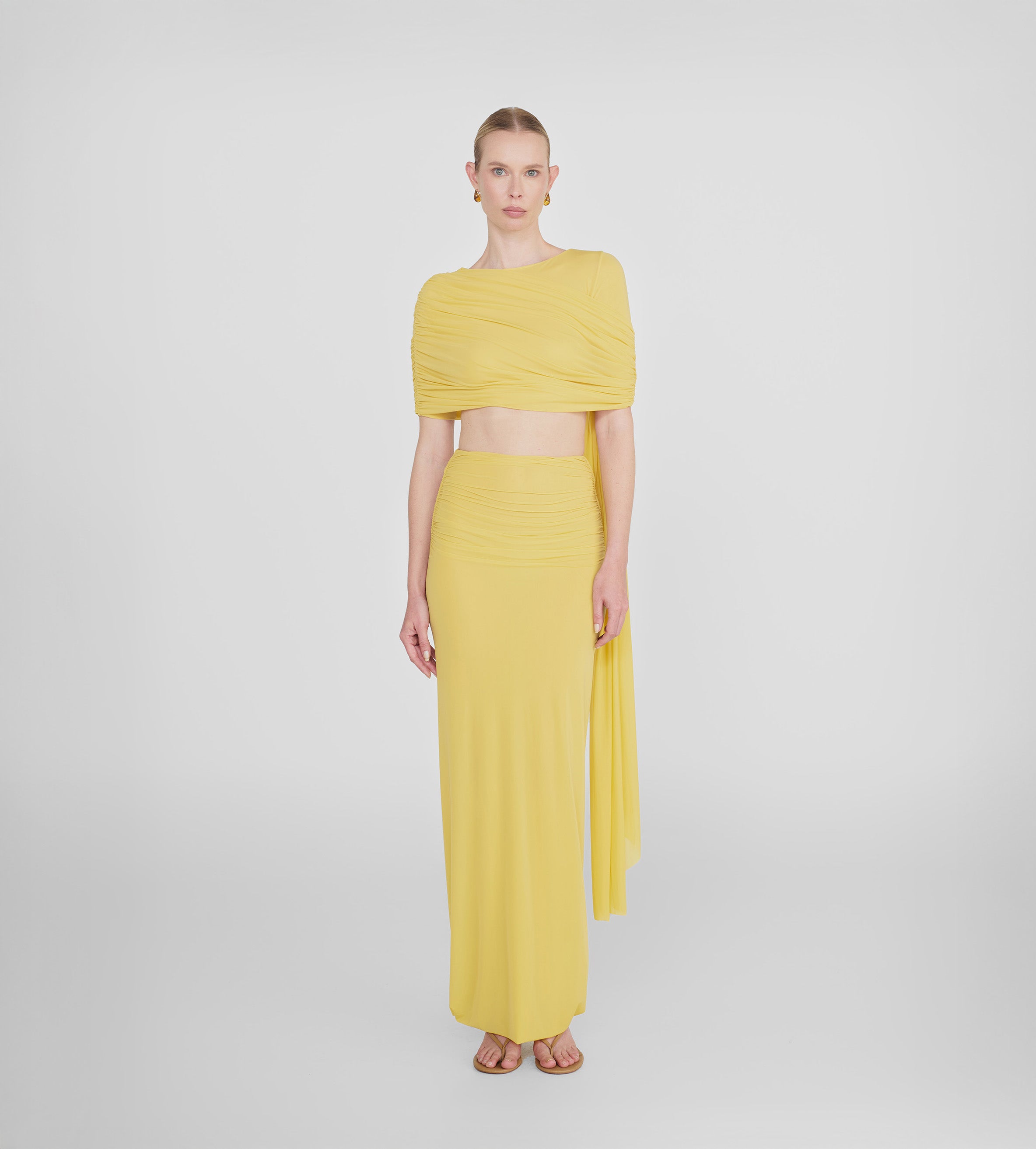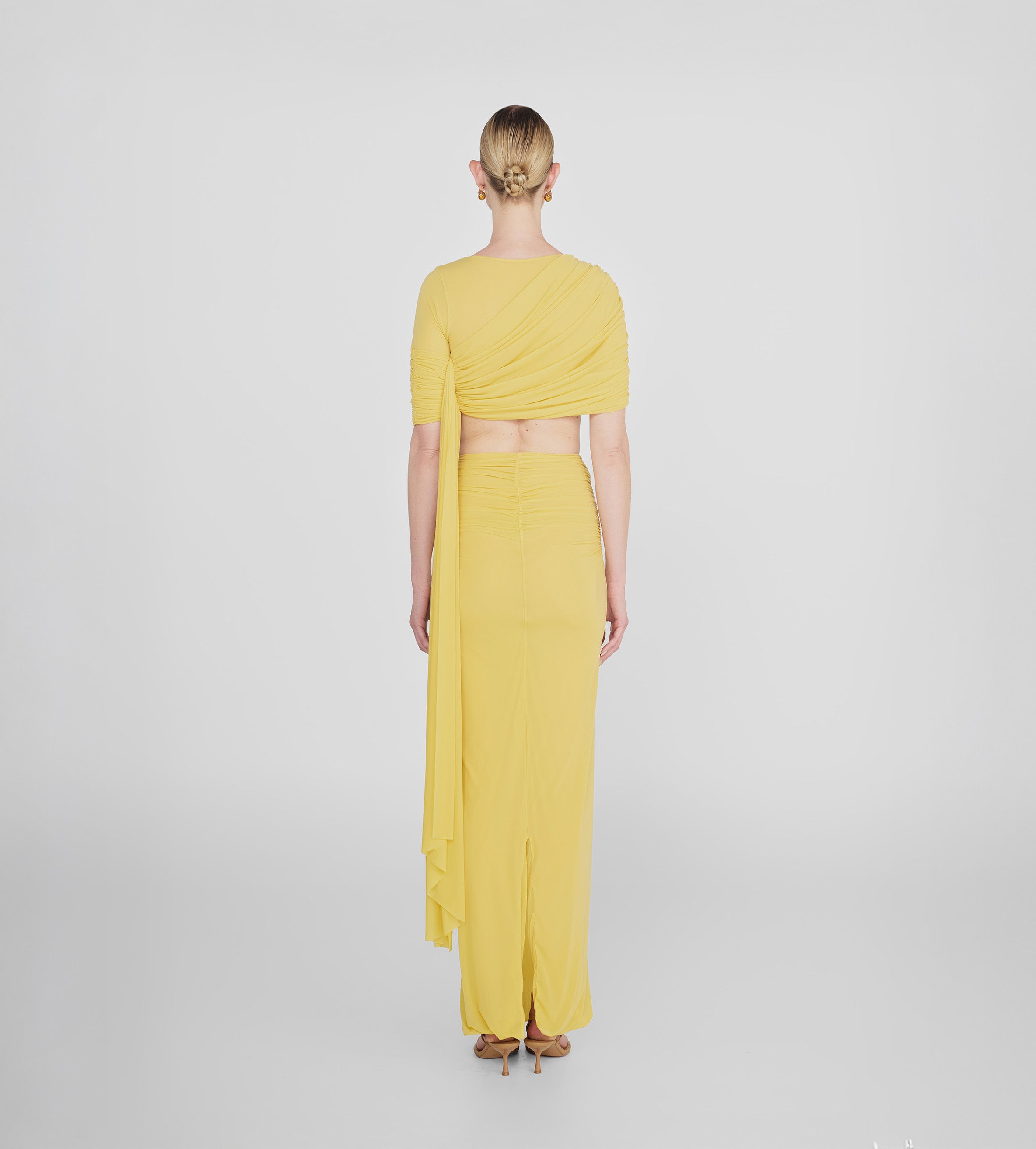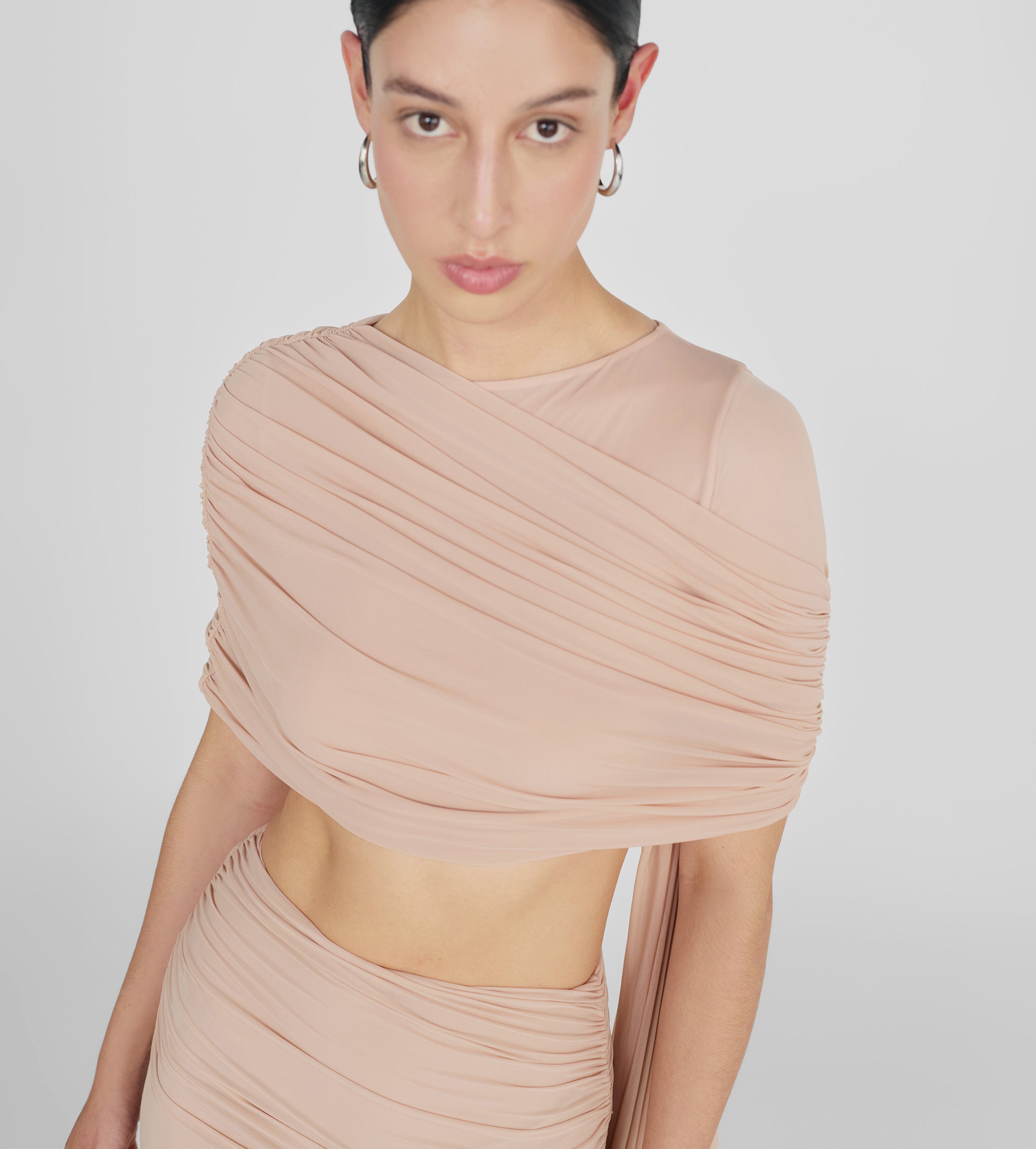 The Luz top features short sleeves and a fully ruched front that flows into an asymmetric draped back, completed with a side long sash.