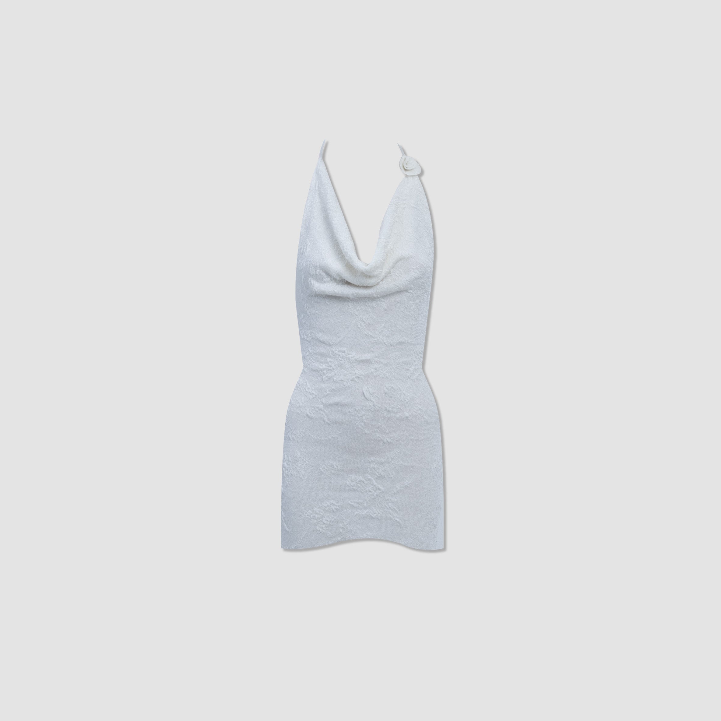 Tu Cariñito mini dress is crafted from an exquisite Italian knit with delicate floral-textured and body-contouring softness. It features a dramatic, deep cowl neckline with thin, delicate straps that elegantly tie at the neck. Its sleek, figure-hugging silhouette is perfectly balanced by a striking open back, and a romantic floral design detail at the front.