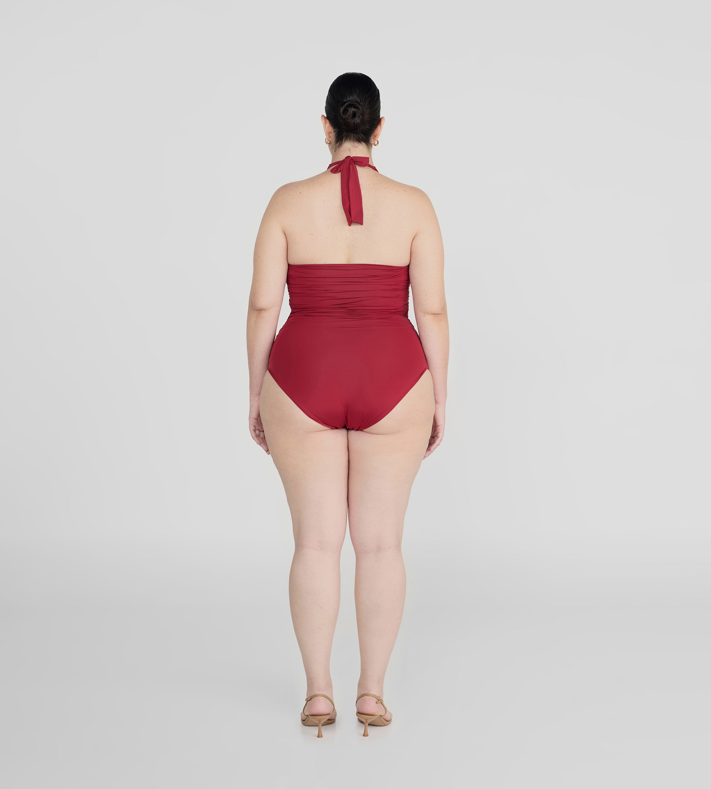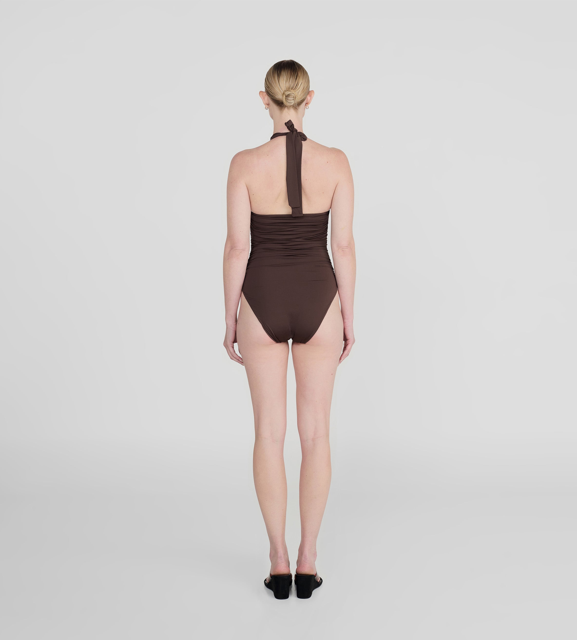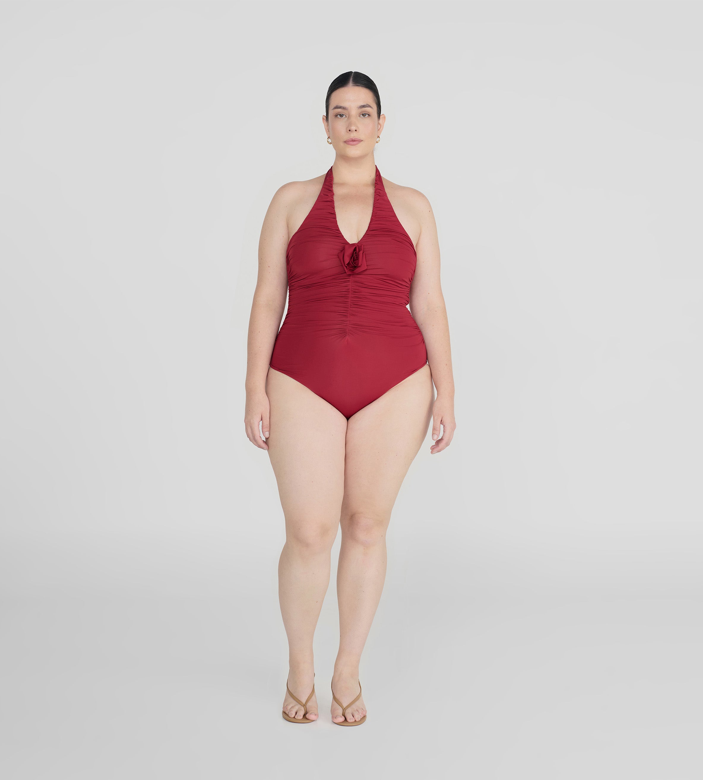 The Yojaira one-piece showcases a plunging halter neckline that elongates the silhouette, fastening elegantly at the neck. Delicate ruching along the center front and back accentuates the bodice, sculpting a flattering shape and culminating in a striking 3D floral embellishment.