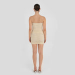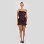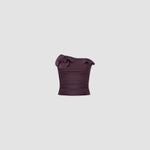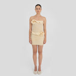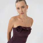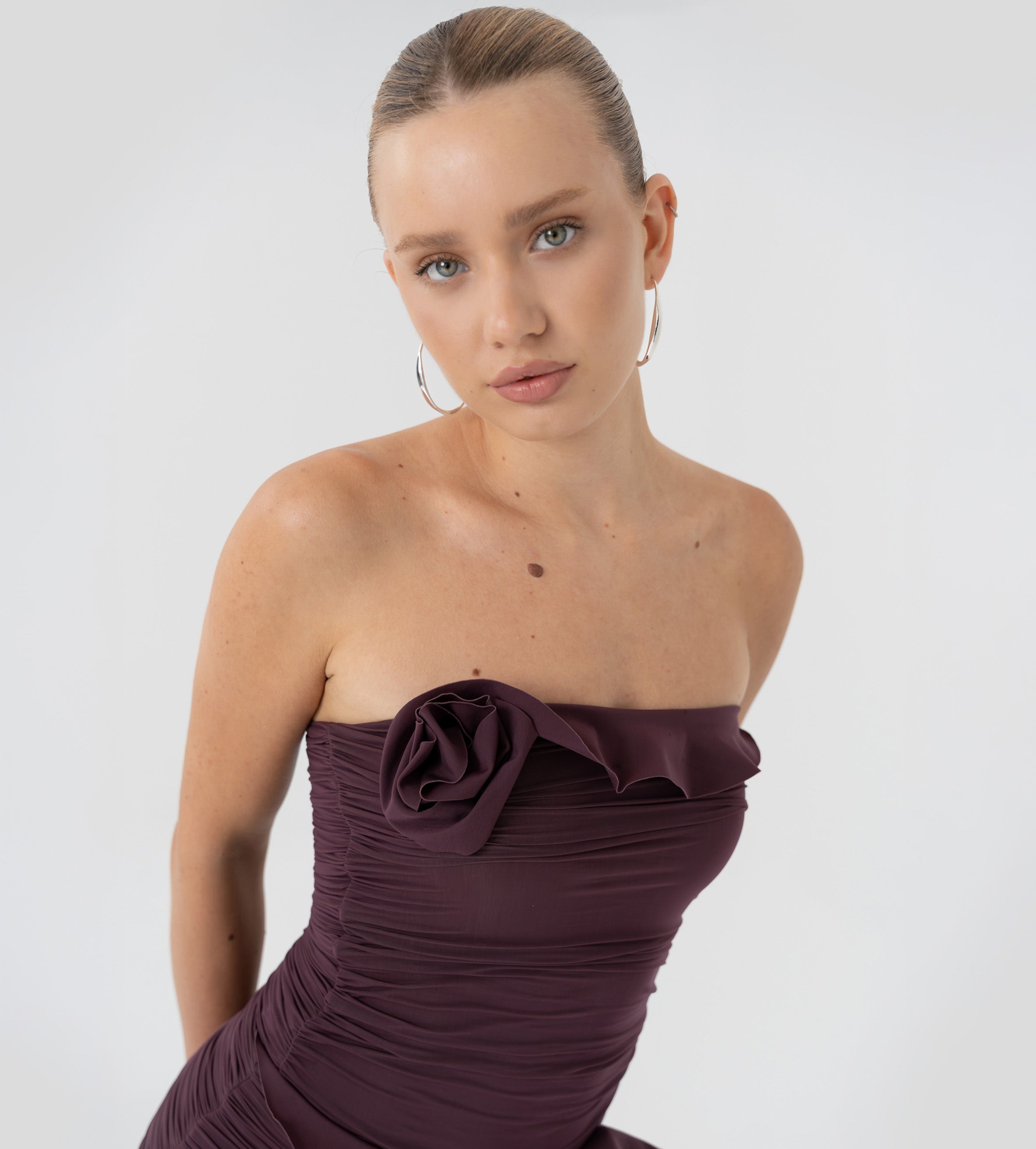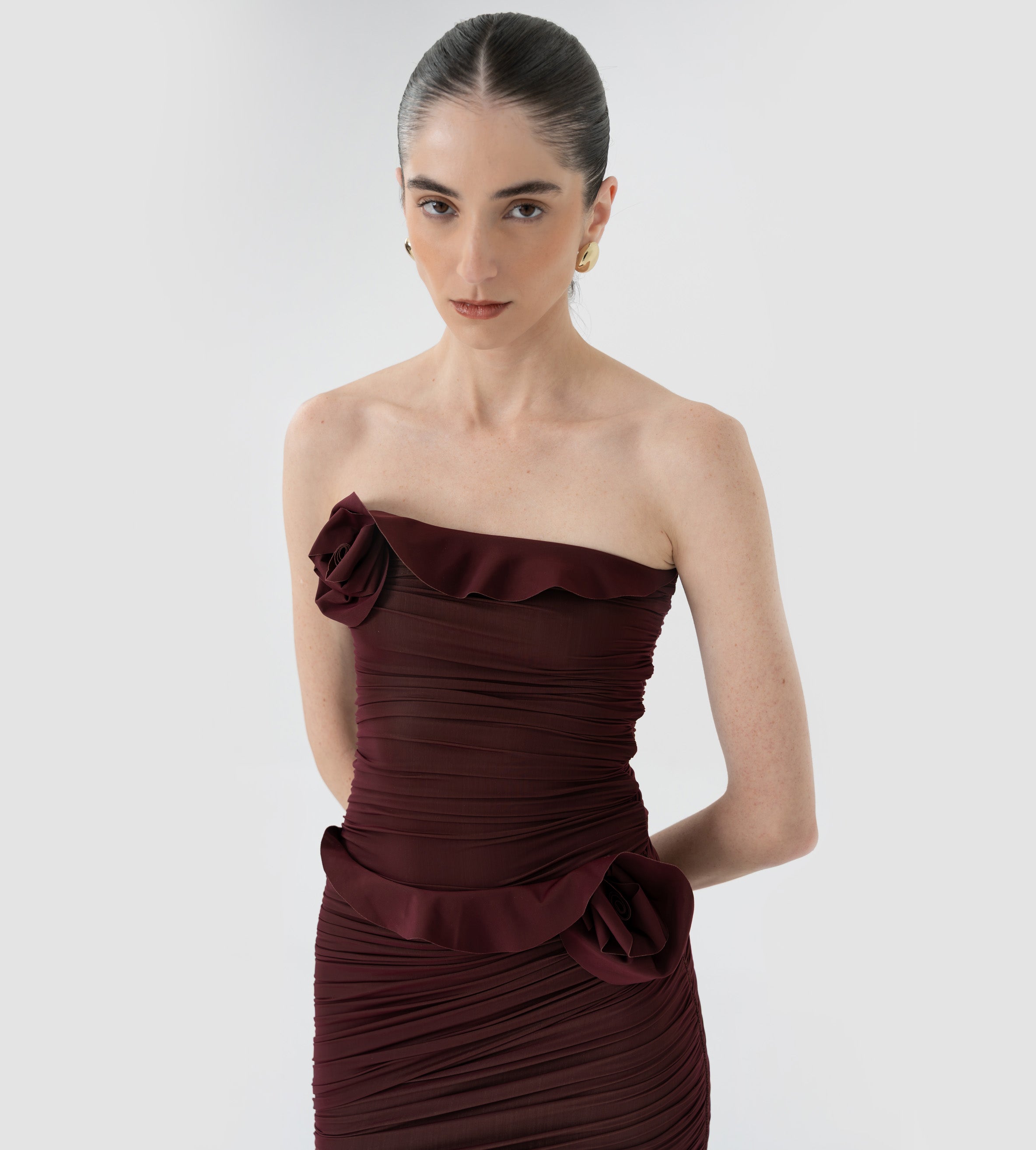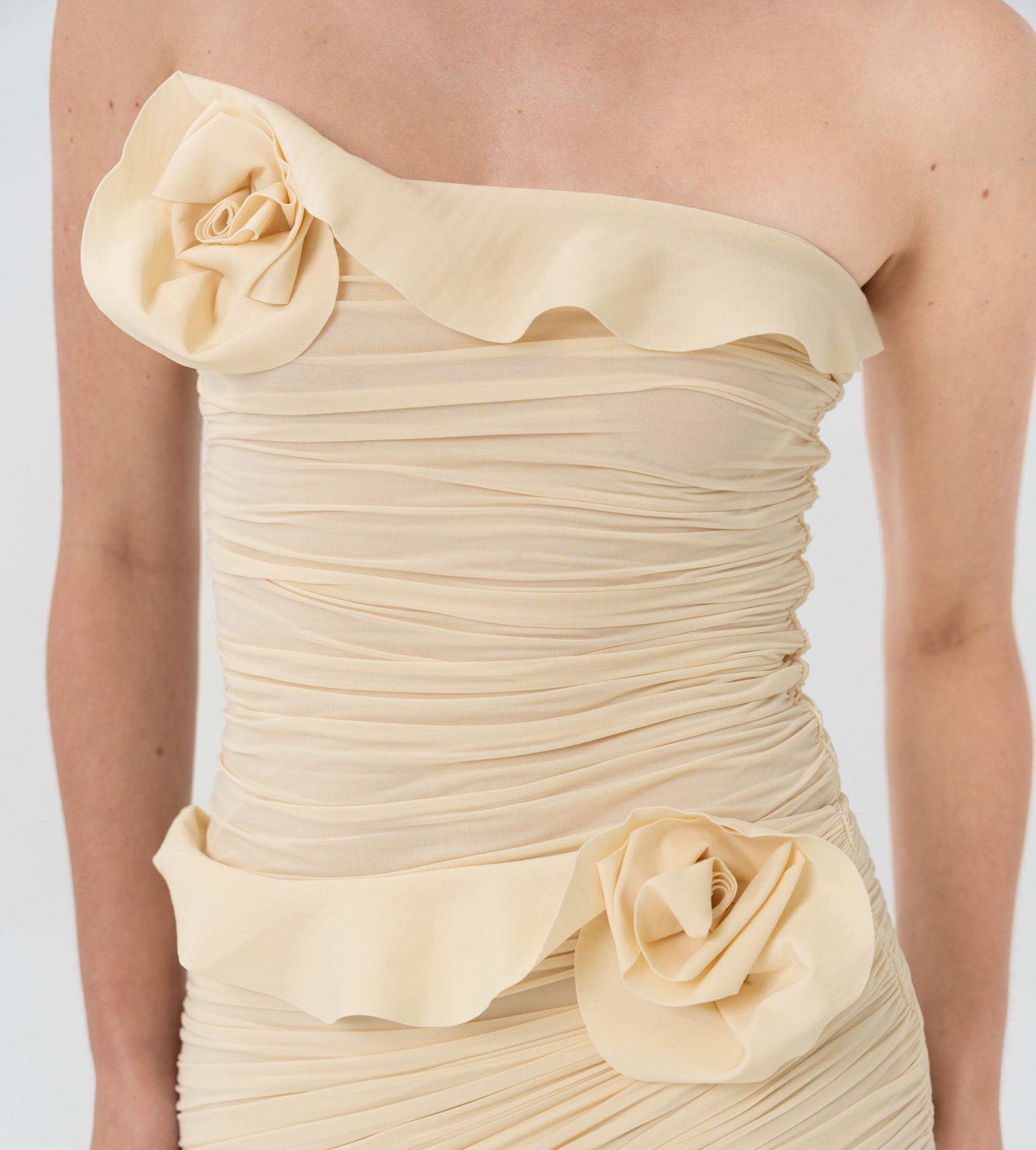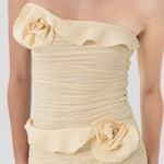 The Albura top features a strapless neckline with a sculptural 3D floral detail, from which cascades a delicate ruffle over the front. The design is balanced by a fully ruched bodice at both front and back, creating a sophisticated and harmonious silhouette.