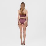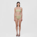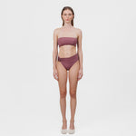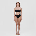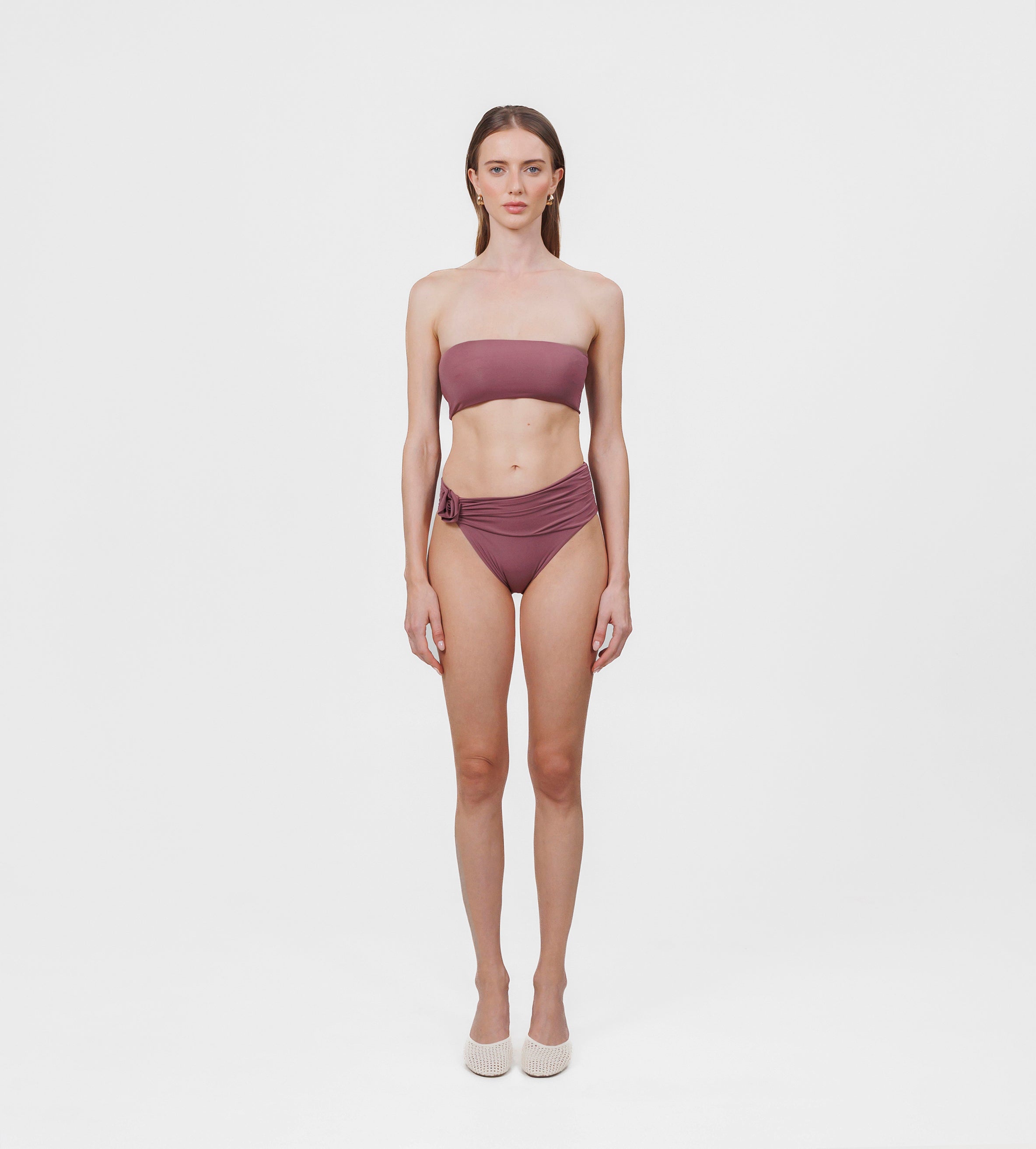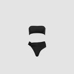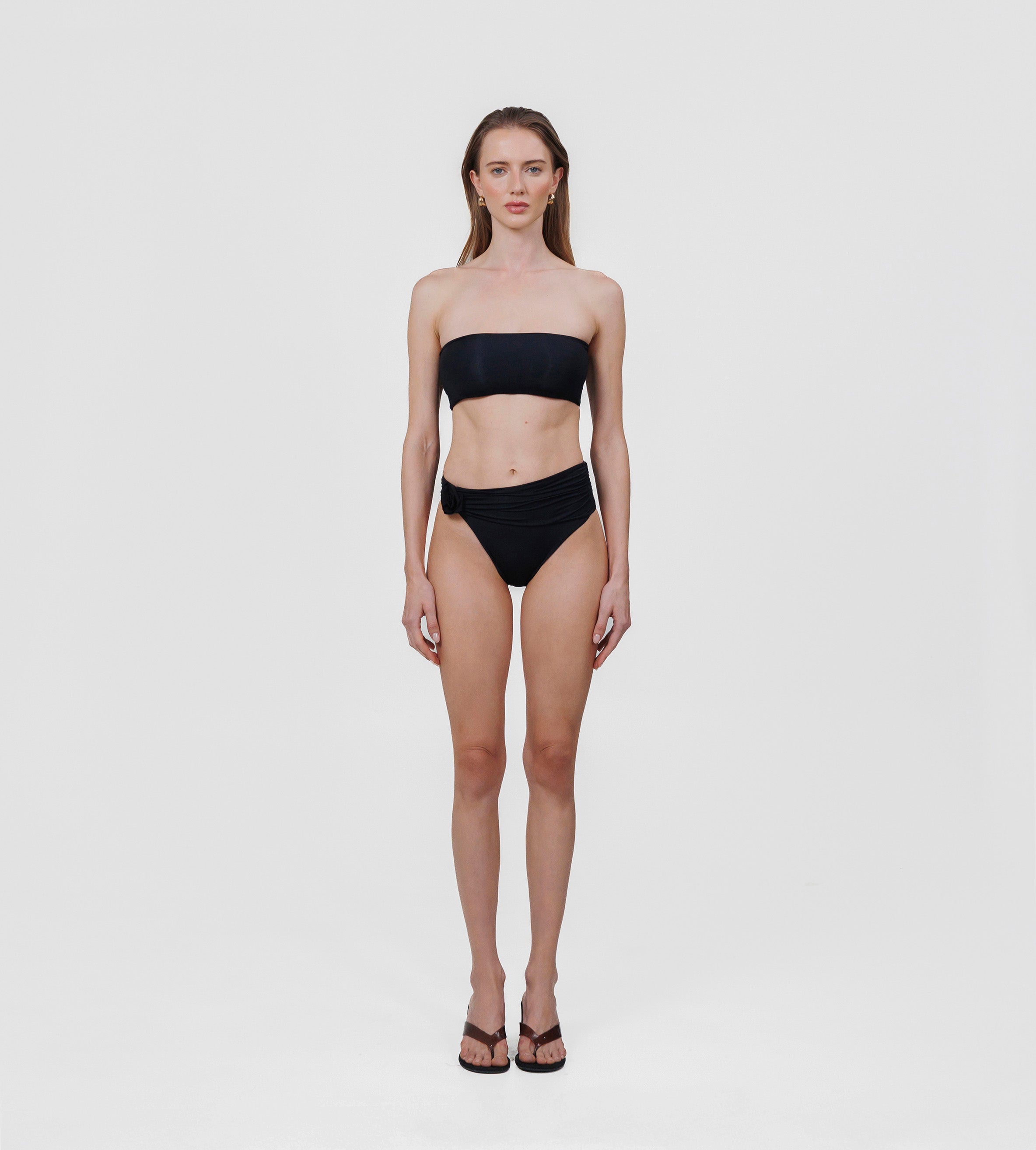 The Alheli two-piece features a sleek bandeau top, perfect for effortless day-to-night styling. Paired with high-waisted, medium coverage bottoms showcasing an asymmetric design with a ruched detail gathered by a 3D floral embellishment at the side, beautifully contouring the silhouette.