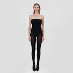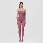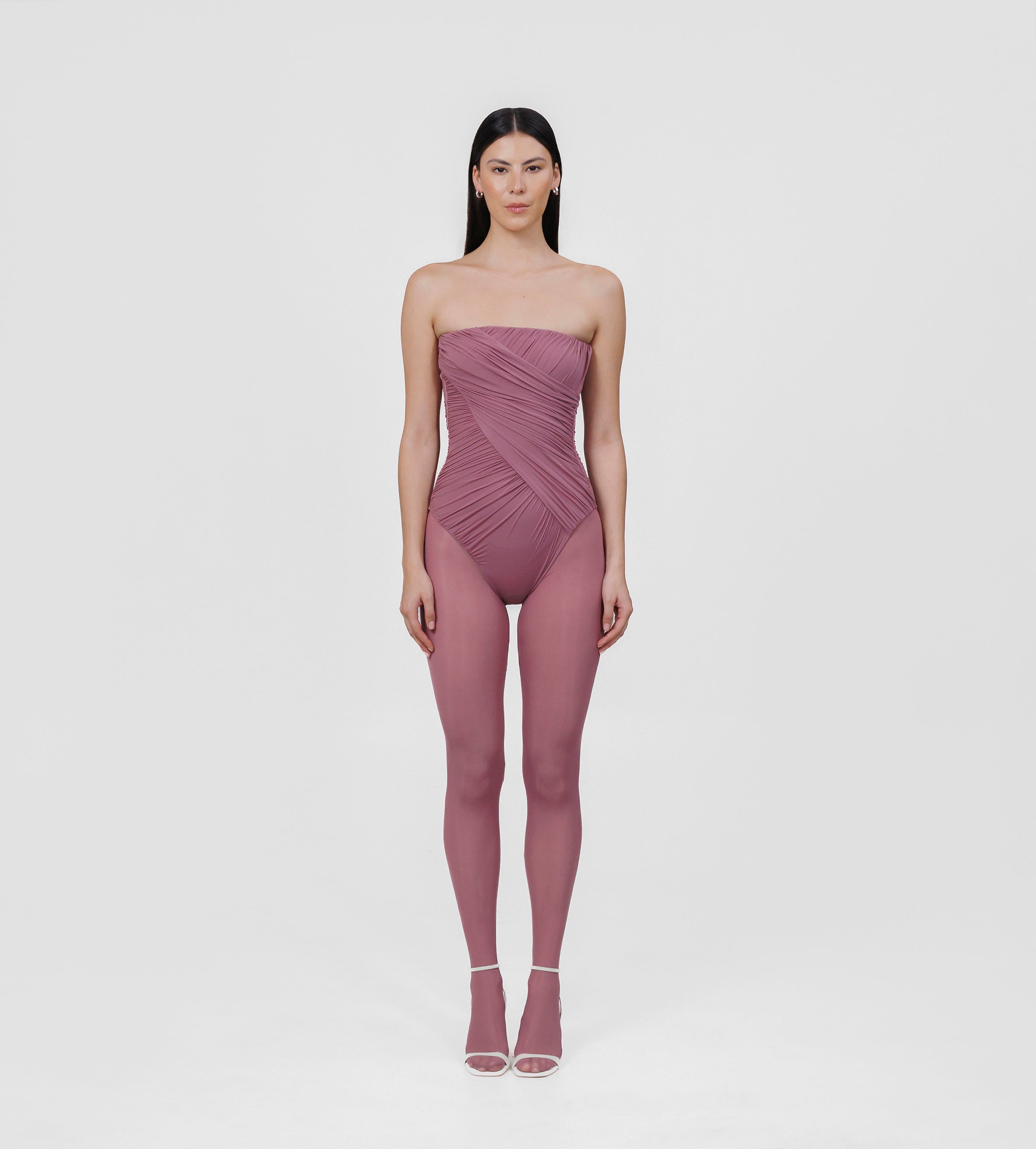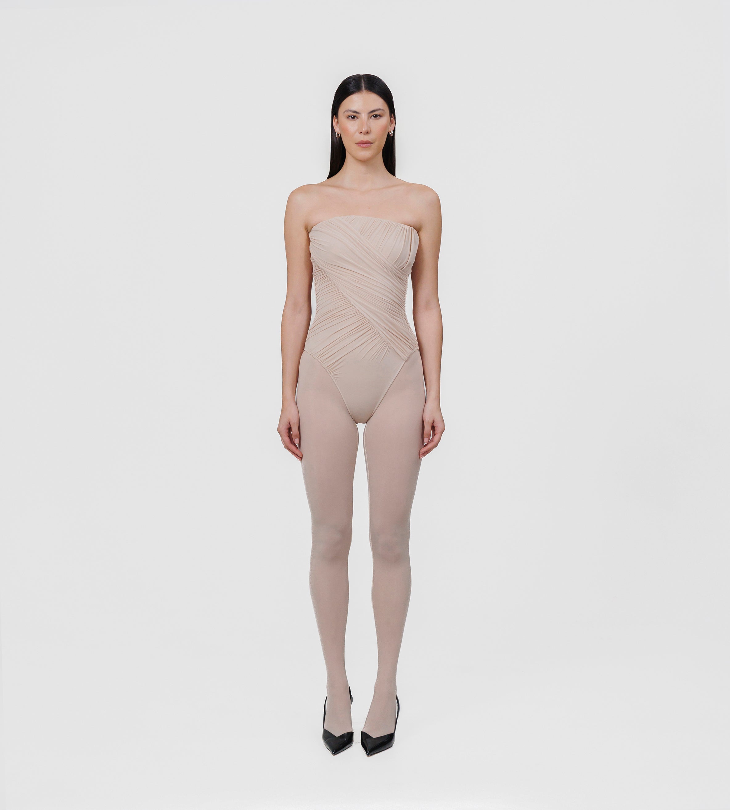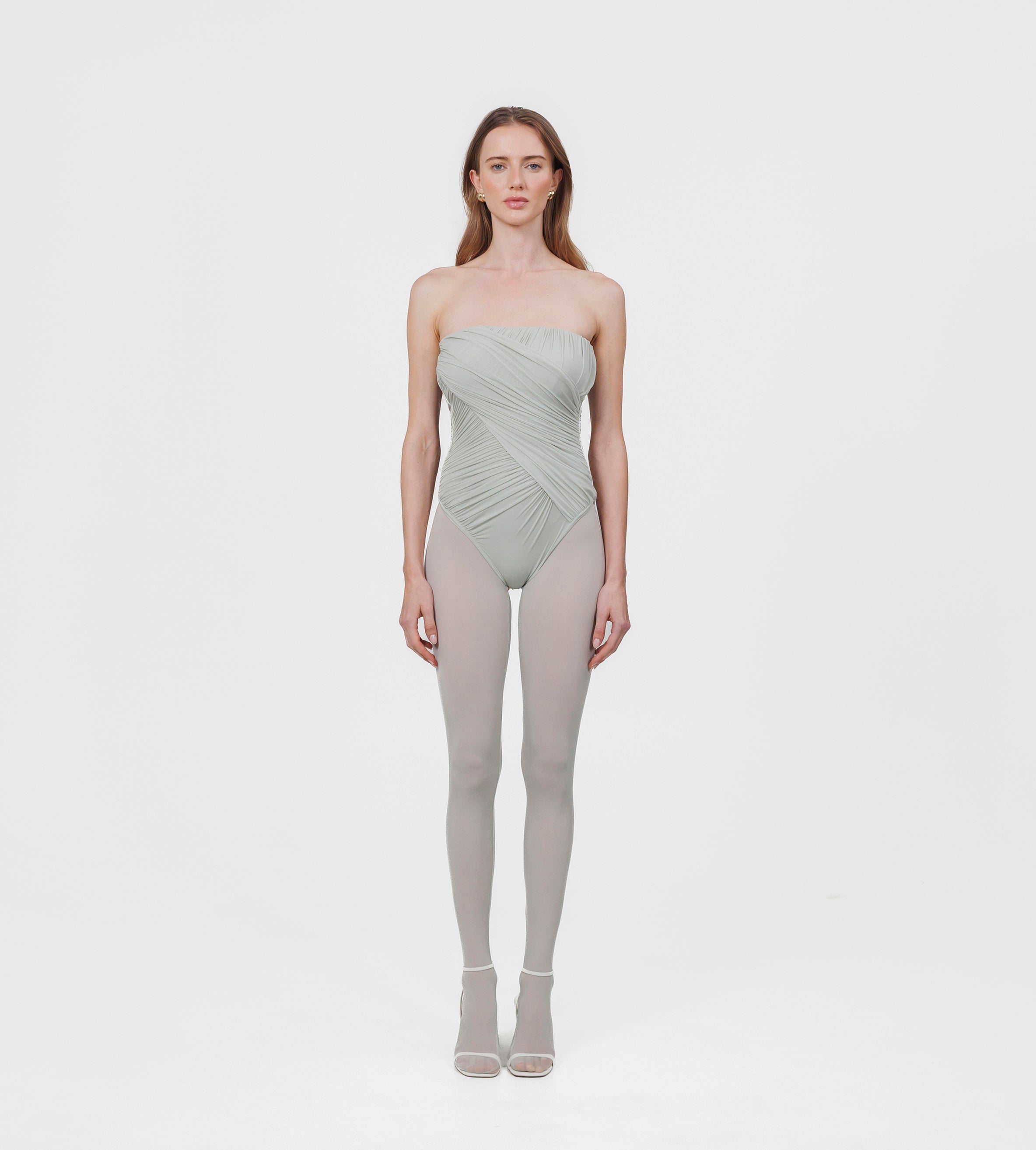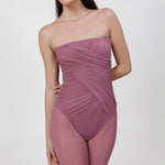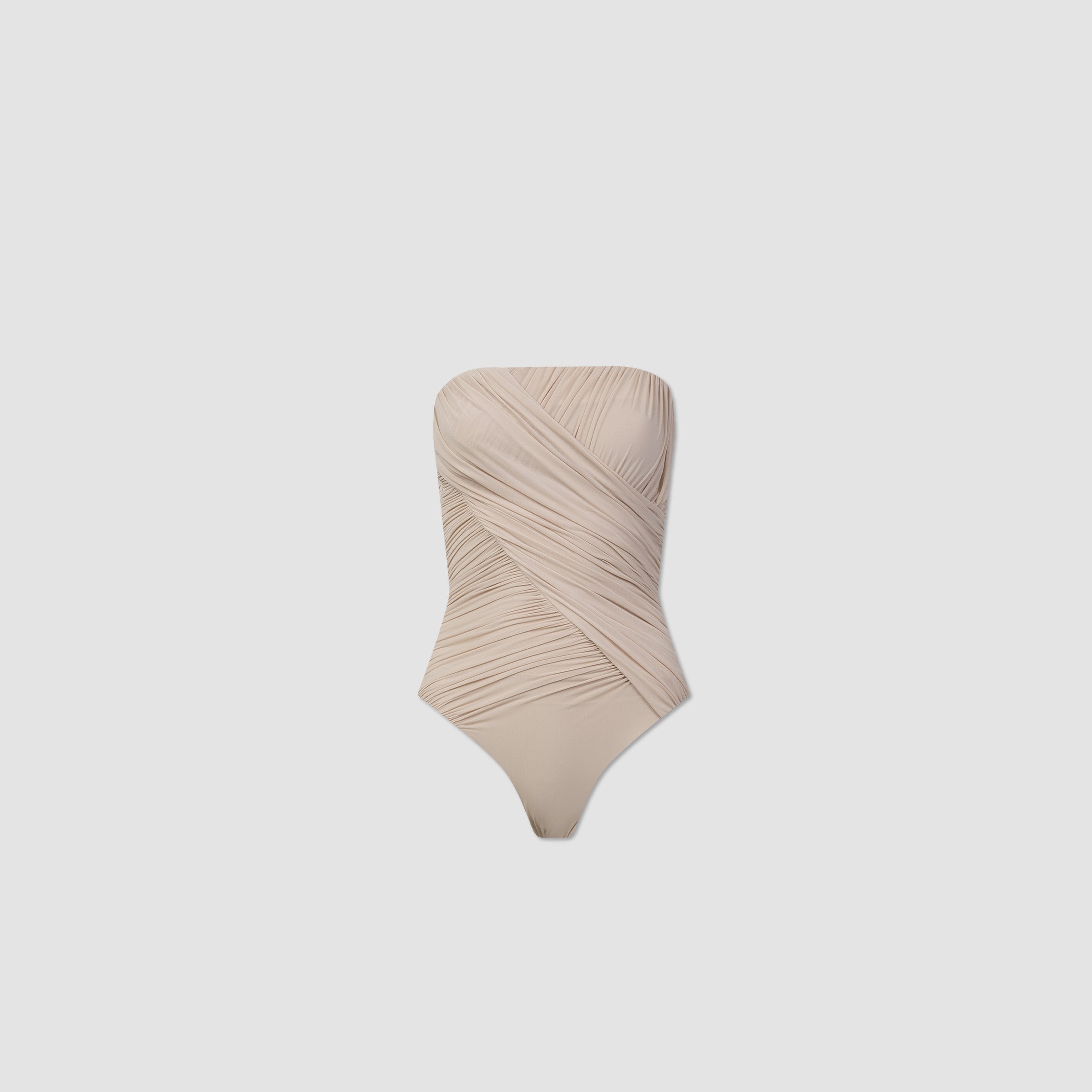 The Alondra one-piece showcases a soft, strapless neckline with intricate ruching that gracefully contours the body and continues into a fully ruched back. Its gathered texture accentuates the waist, creating a sculpted elegant look.