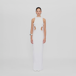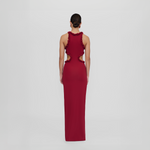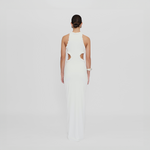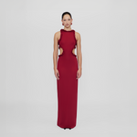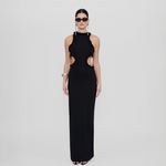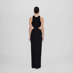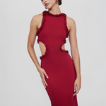 Long and sleek, our Anassa dress features a round neckline, sensual side cutouts and a flirtatious mini ruffle all around detail, wrap up with a long column-style skirt a sophisticated design perfect for any celebration.