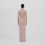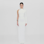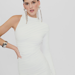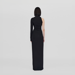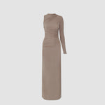 Funnel-neck long dress with a second-skin fit, featuring a draped front that cascades into a sleek column-style skirt and a long sleek sleeve. This refined design comes in a variety of stunning colors—opt for our new see through lycra in chai and kale, for a modern touch, or embrace timeless sophistication with our classic stretch fabric in black and white.