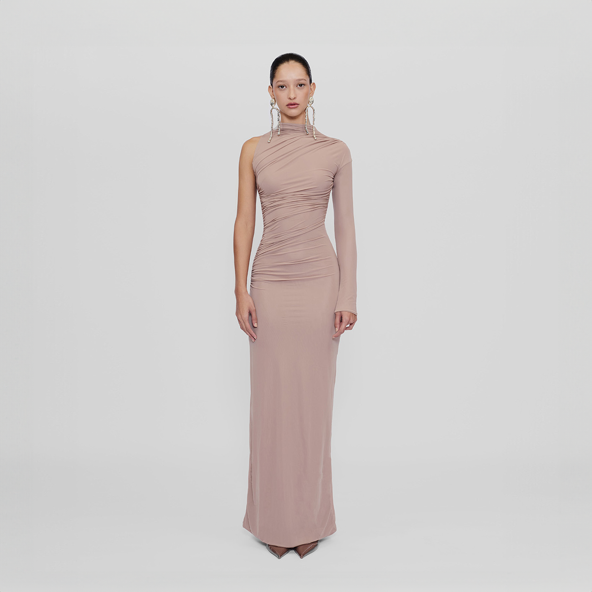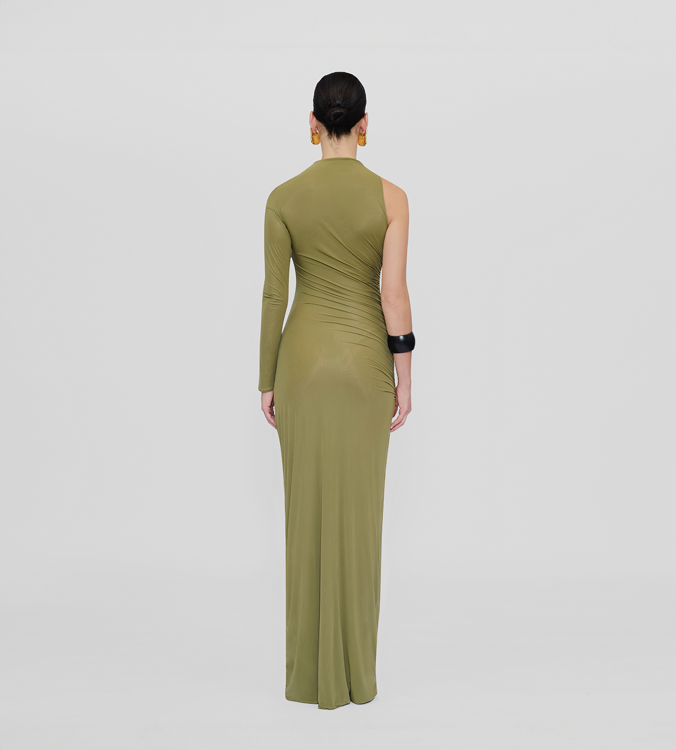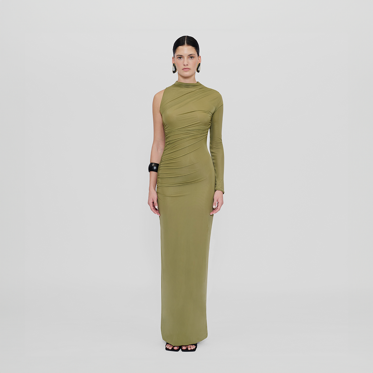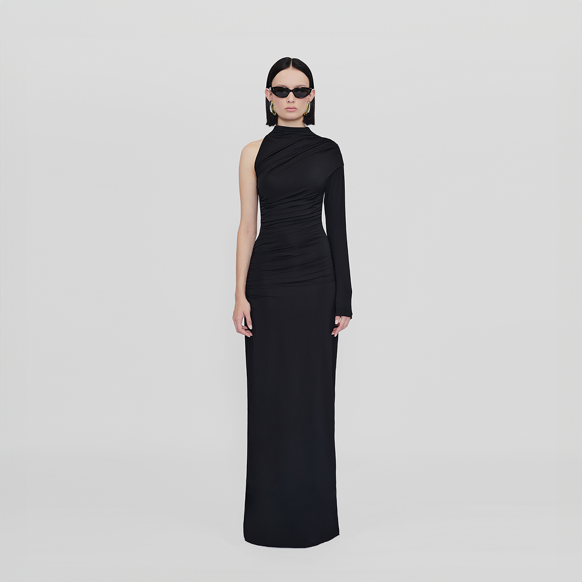 Funnel-neck long dress with a second-skin fit, featuring a draped front that cascades into a sleek column-style skirt and a long sleek sleeve. This refined design comes in a variety of stunning colors—opt for our new see through lycra in chai and kale, for a modern touch, or embrace timeless sophistication with our classic stretch fabric in black and white.