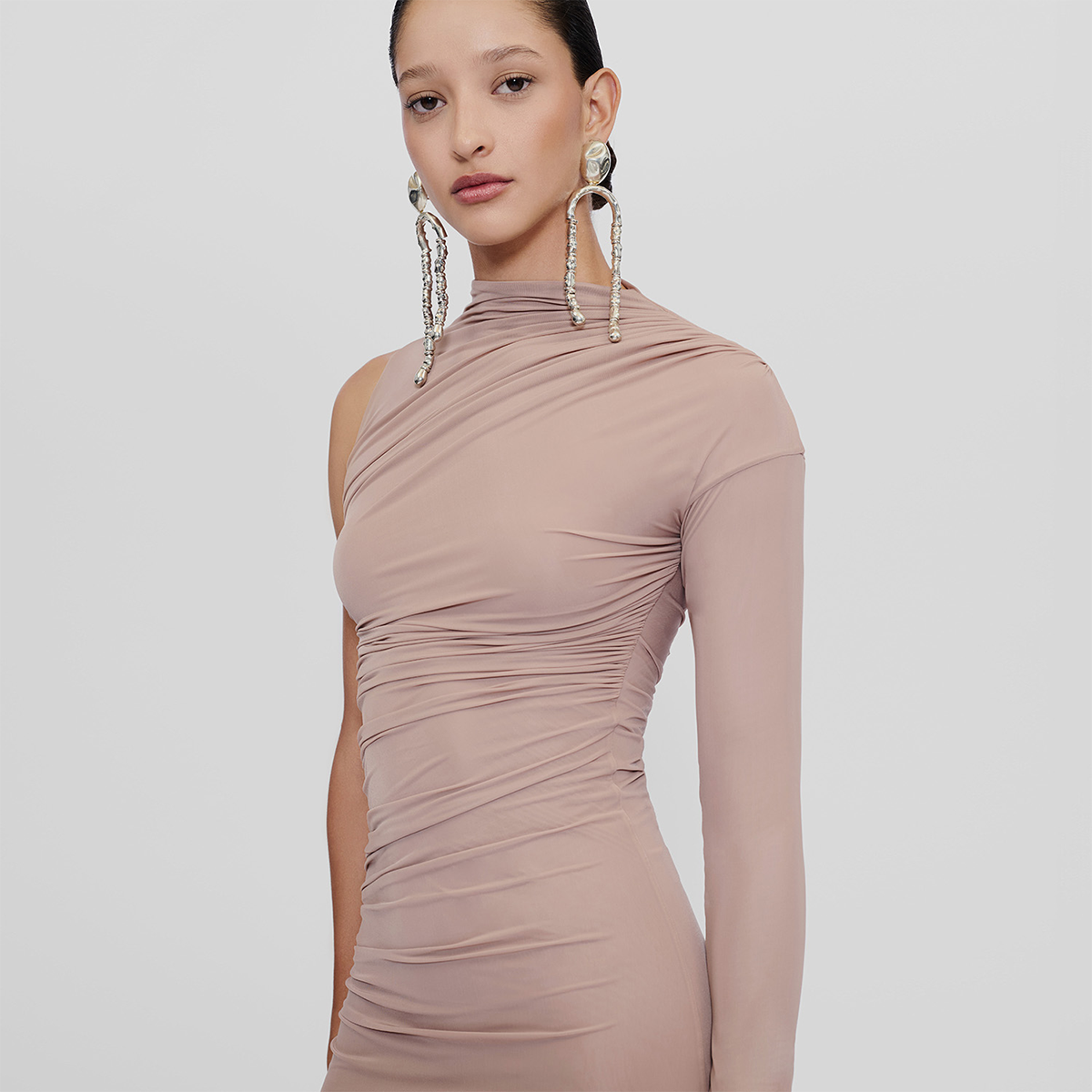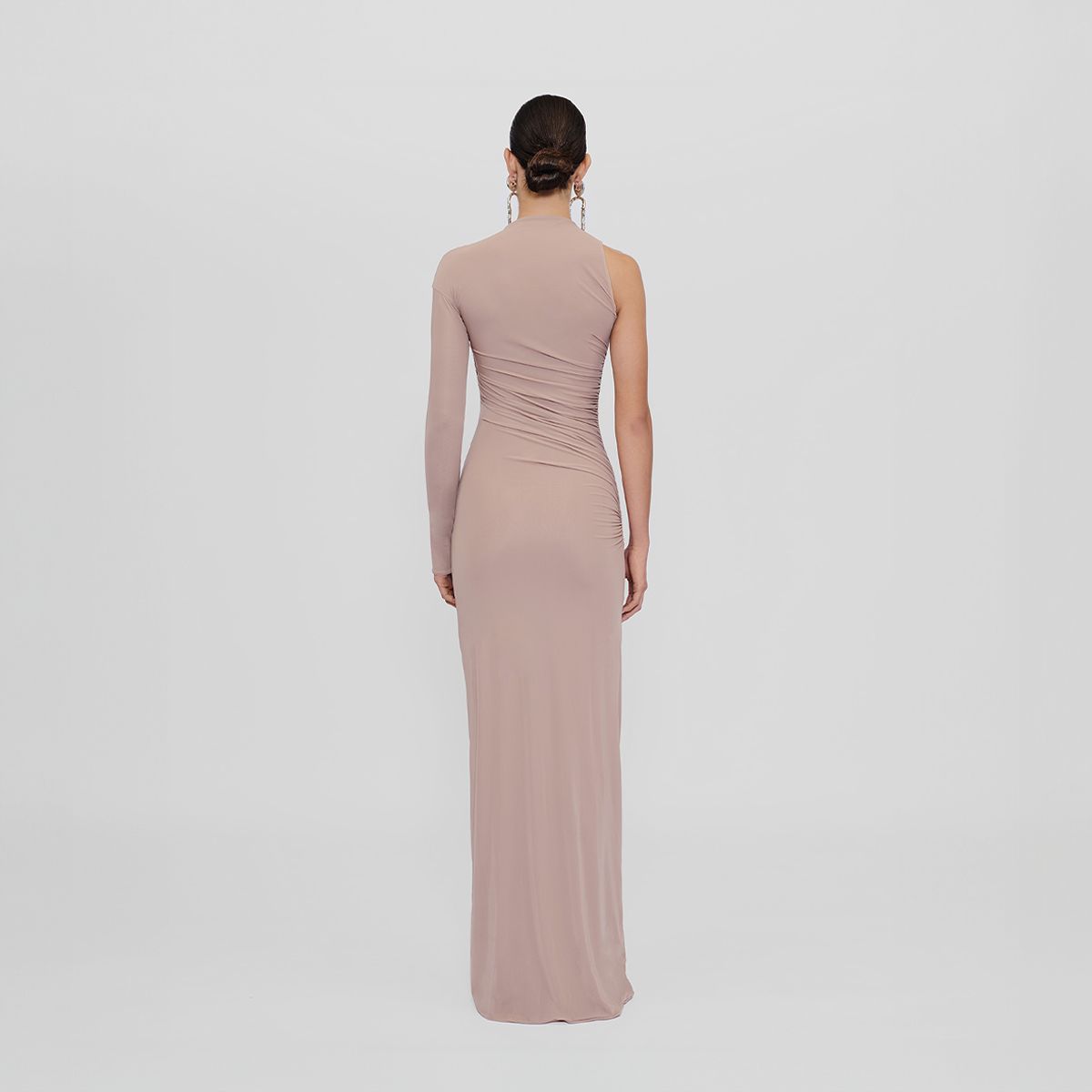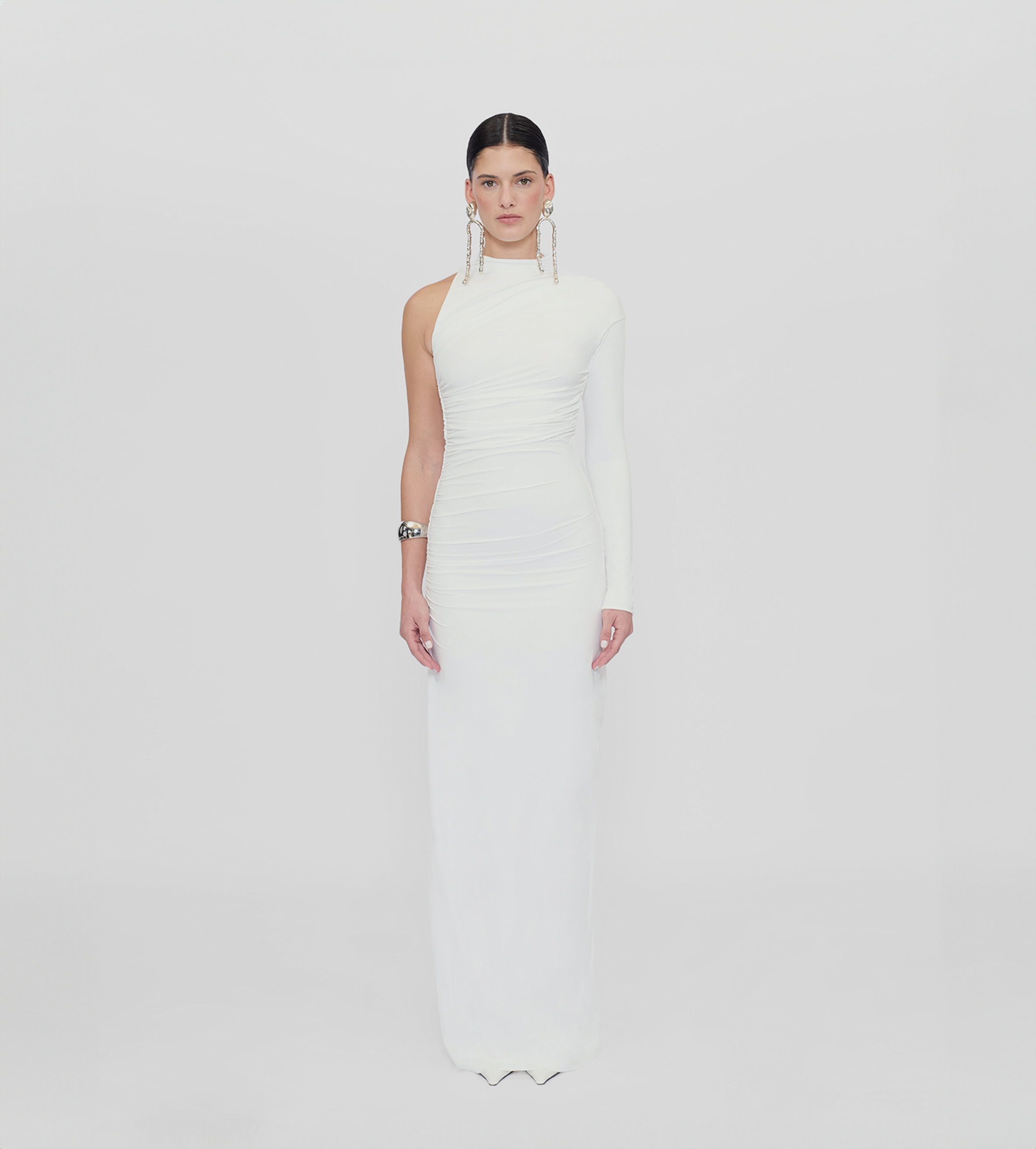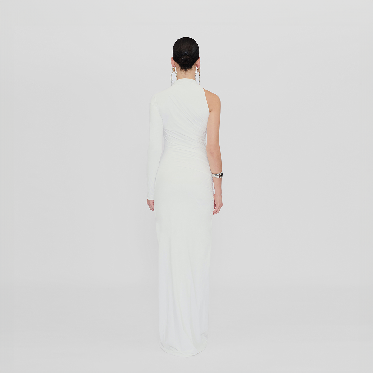 Funnel-neck long dress with a second-skin fit, featuring a draped front that cascades into a sleek column-style skirt and a long sleek sleeve. This refined design comes in a variety of stunning colors—opt for our new see through lycra in chai and kale, for a modern touch, or embrace timeless sophistication with our classic stretch fabric in black and white.