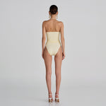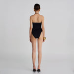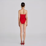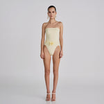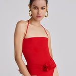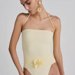 Straight neckline one-piece with delicate ruched detail at the waist in front and back, wrapped up with our signature 3D handmade flower at front and an elegant thin strap to the neck; a minimal design that embodies the brand's feminine essence.