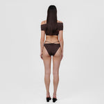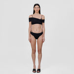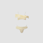 The Aria two-piece features an off-shoulder bandeau top with thin straps an asymmetric layered design. A wide ruched overlay gathered by a delicate 3D floral embellishment contrasts with the diagonally draped under layer—creating the illusion of two pieces in one. It pairs with a mid-rise, medium-coverage bottom that echoes the same dual concept, combining thin straps with a wide ruched band for a versatile and sophisticated ensemble.