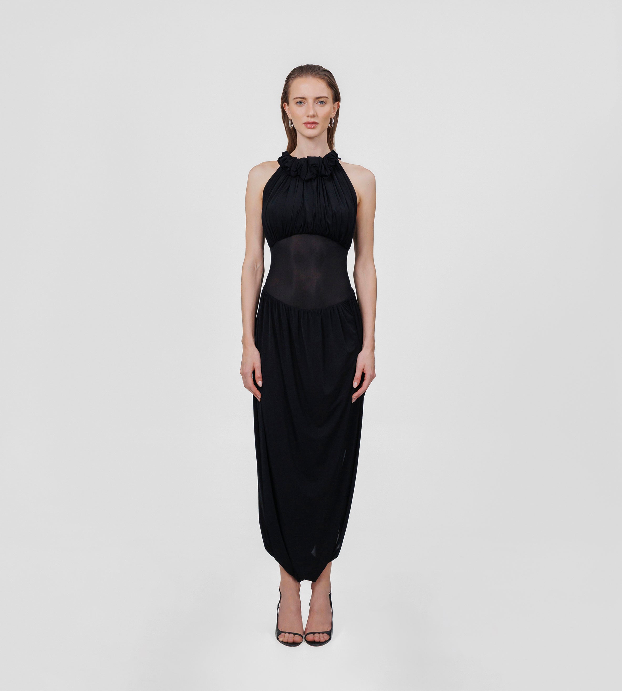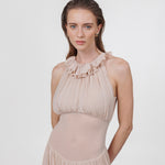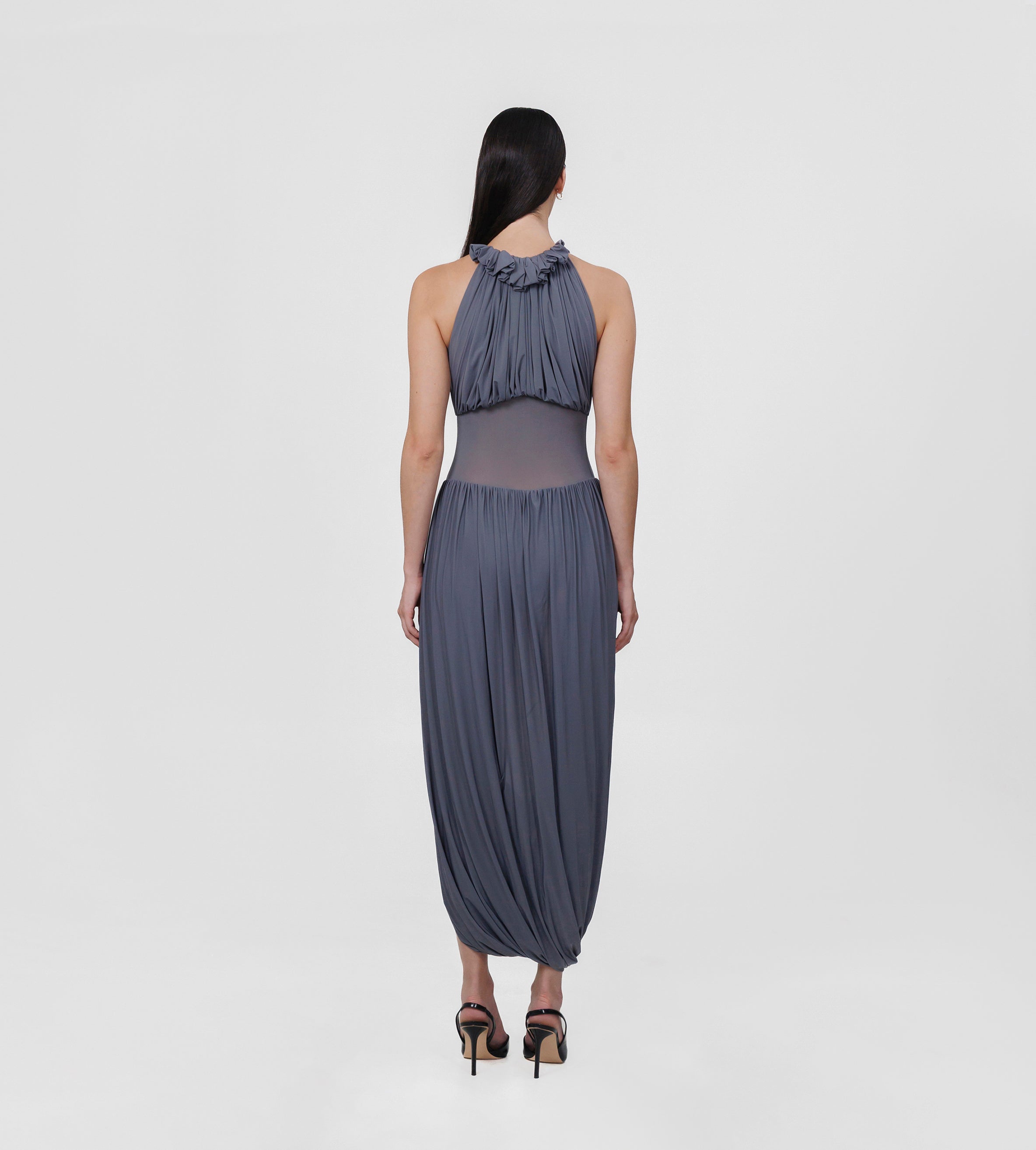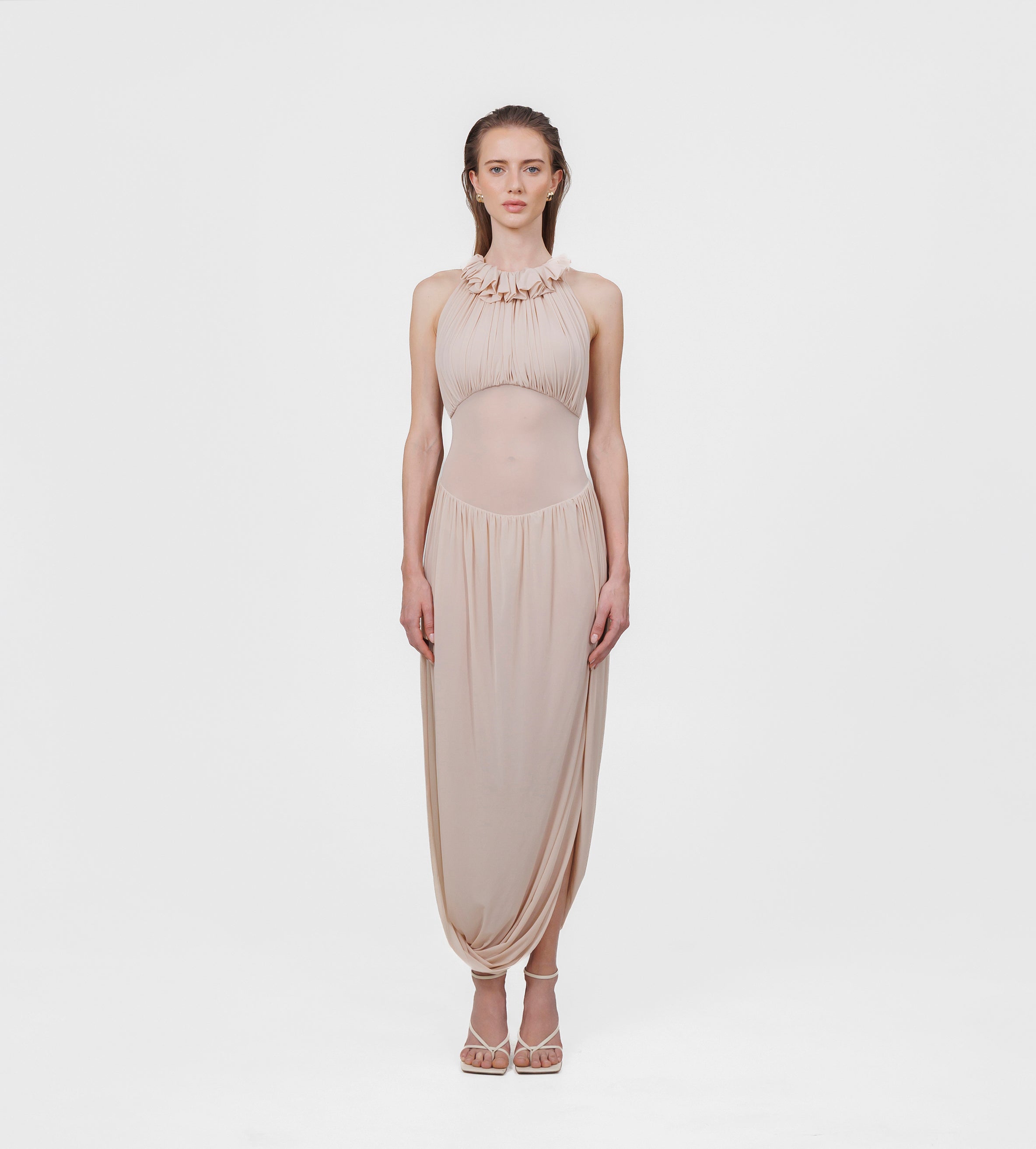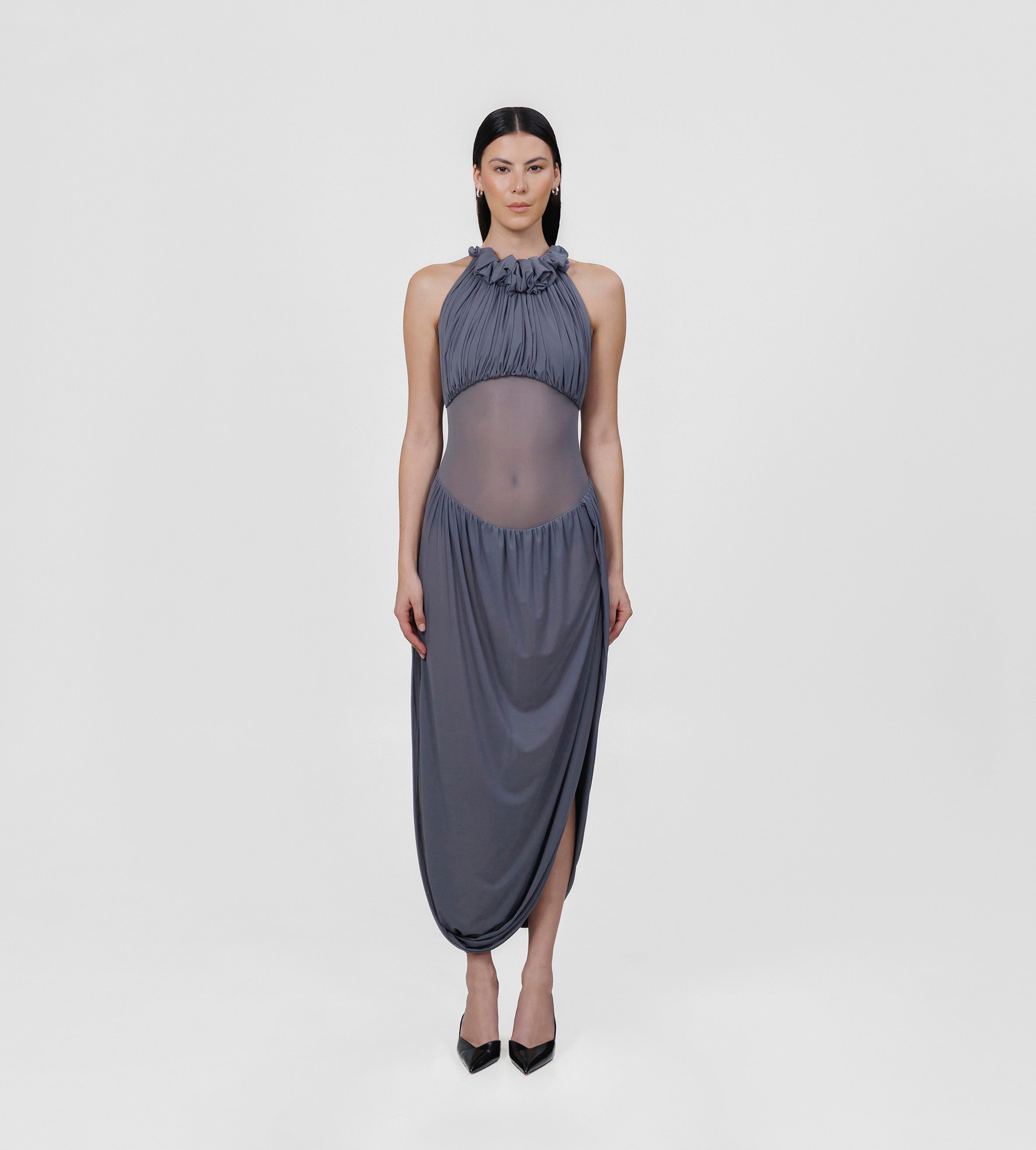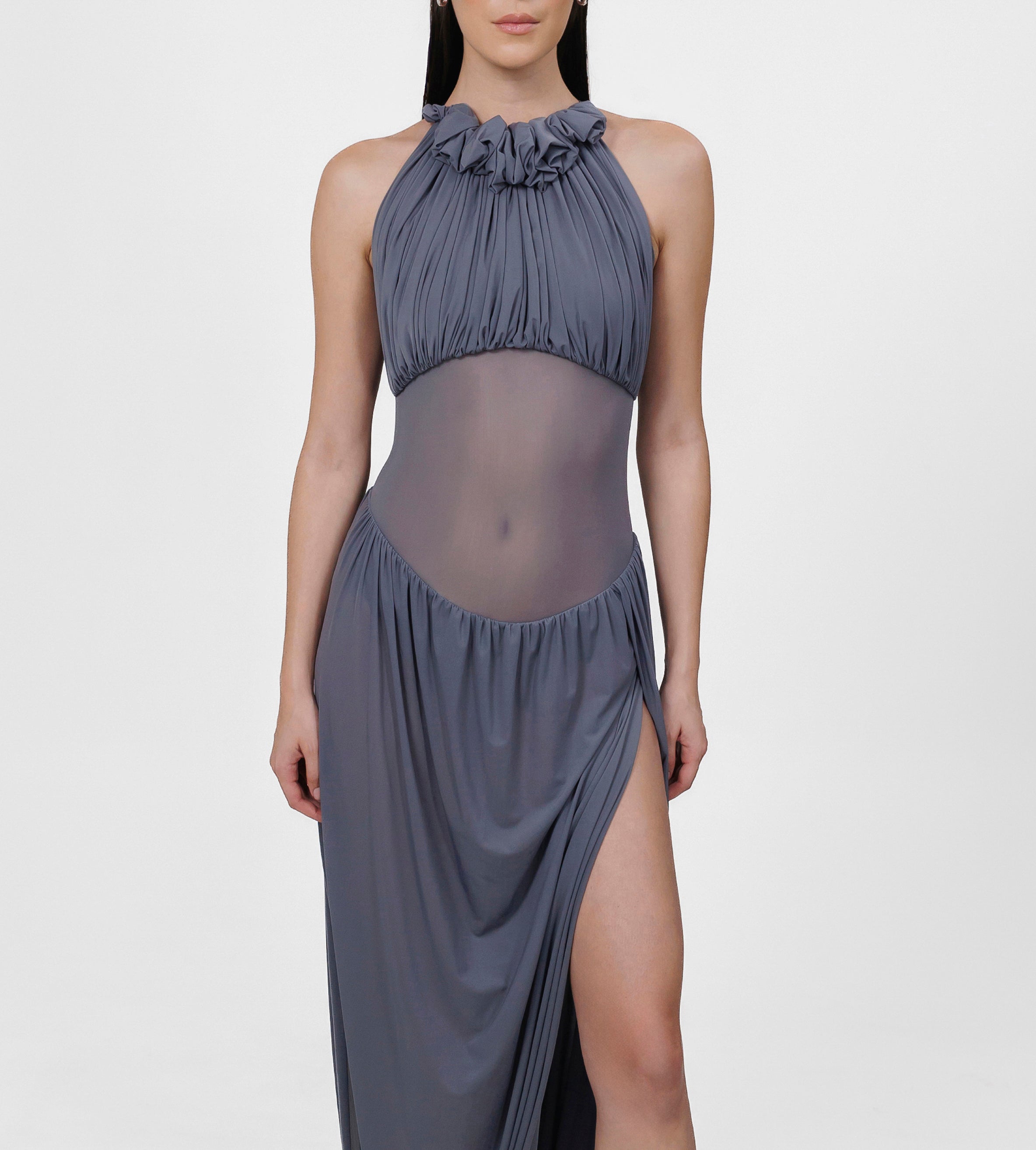 The Azzurra long dress blends the delicate shades of our sheer fabric, featuring a soft round neckline adorned with mini ruffles and a button clasp at the back. A ruched bodice gently contours the silhouette, revealing a subtle translucent layer at the torso that transitions into a fully gathered, twisted long skirt with a graceful side opening. For added comfort, the Azzurra dress includes an internal bodysuit clasp, ensuring both ease and elegance in every movement.