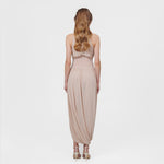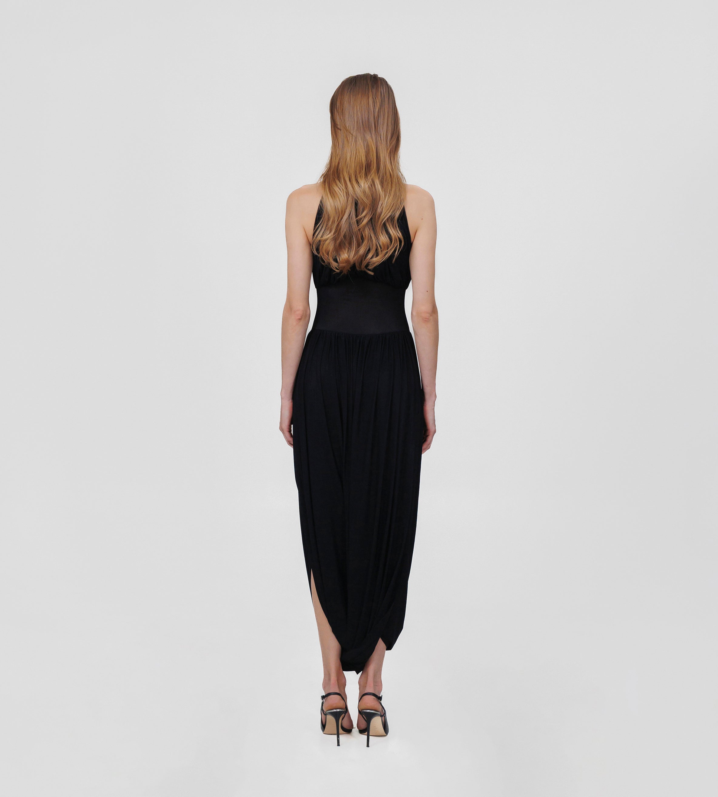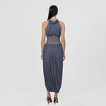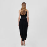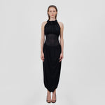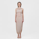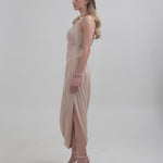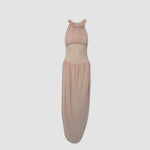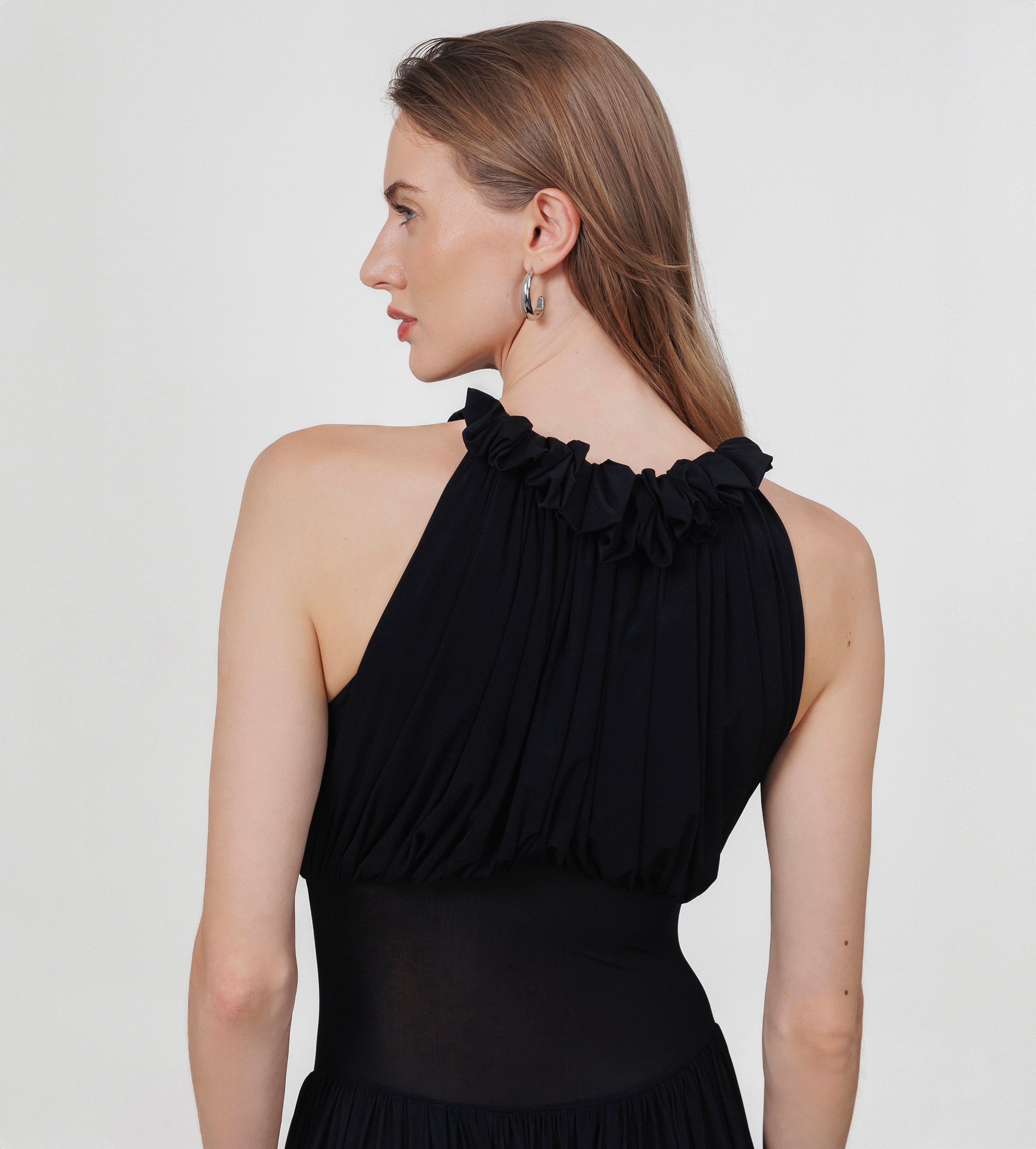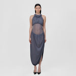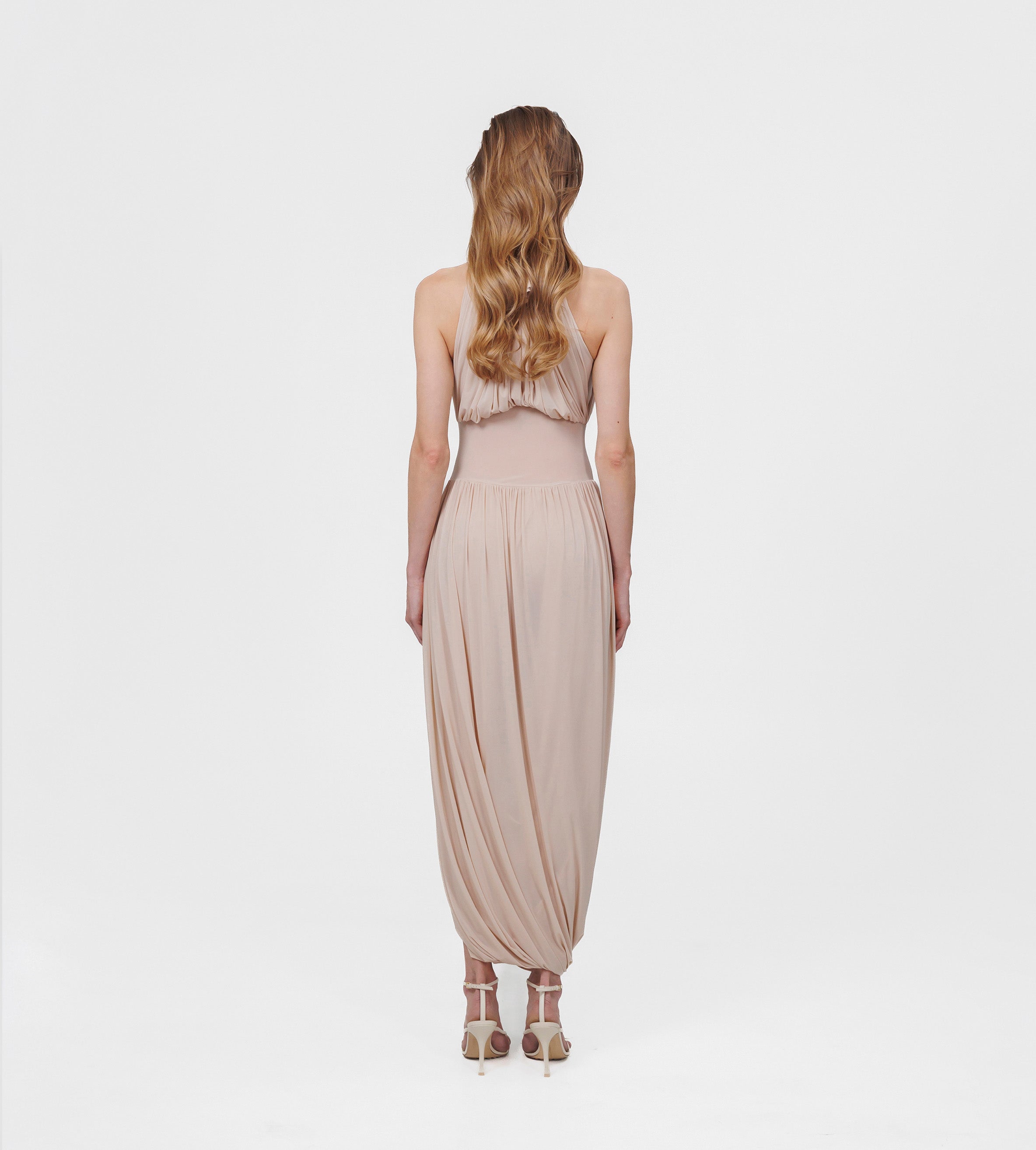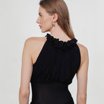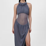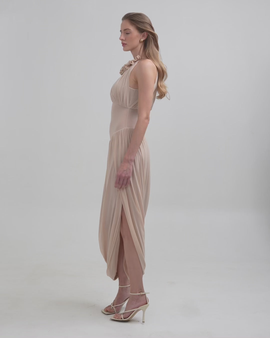 The Azzurra long dress blends the delicate shades of our sheer fabric, featuring a soft round neckline adorned with mini ruffles and a button clasp at the back. A ruched bodice gently contours the silhouette, revealing a subtle translucent layer at the torso that transitions into a fully gathered, twisted long skirt with a graceful side opening. For added comfort, the Azzurra dress includes an internal bodysuit clasp, ensuring both ease and elegance in every movement.