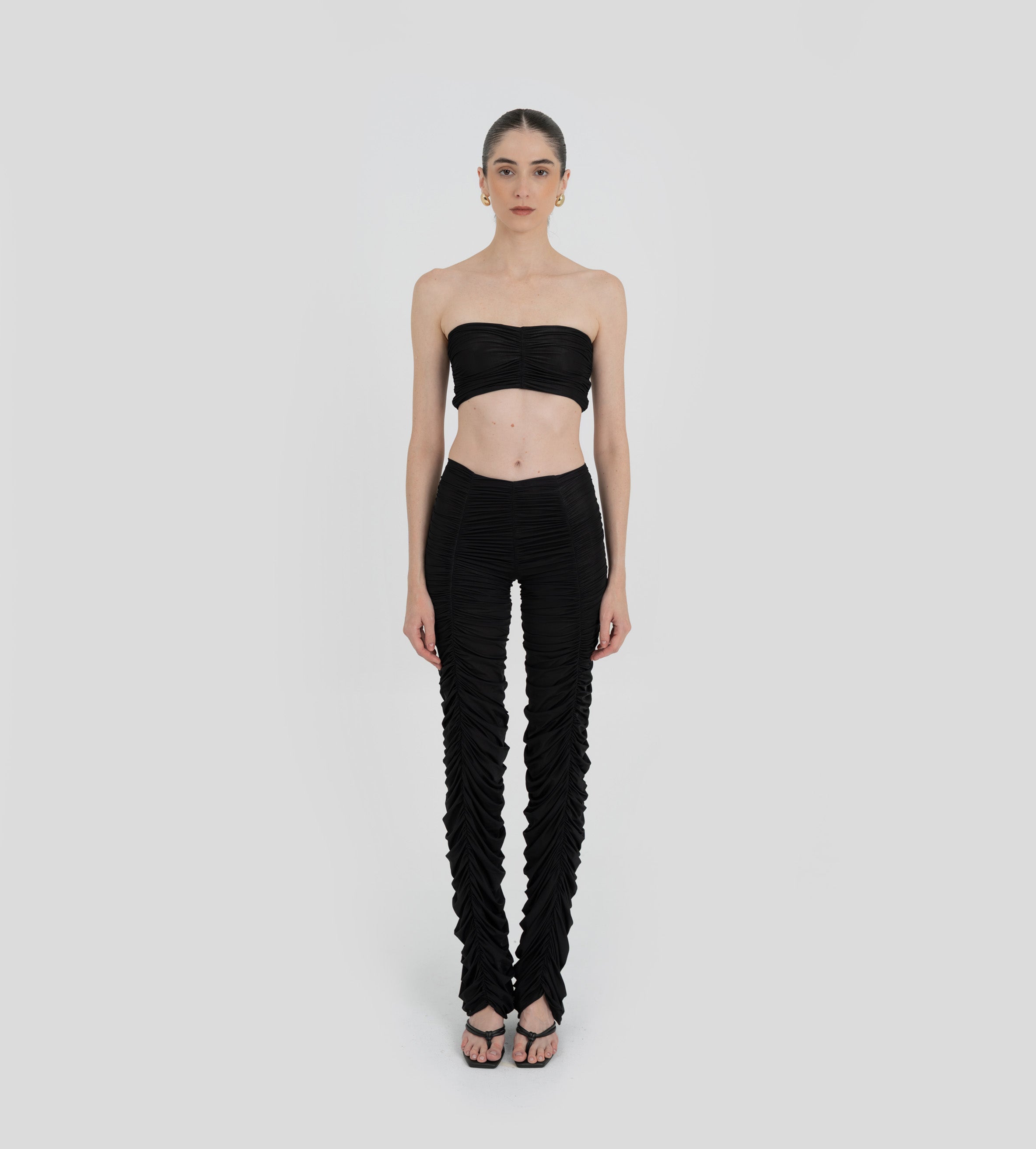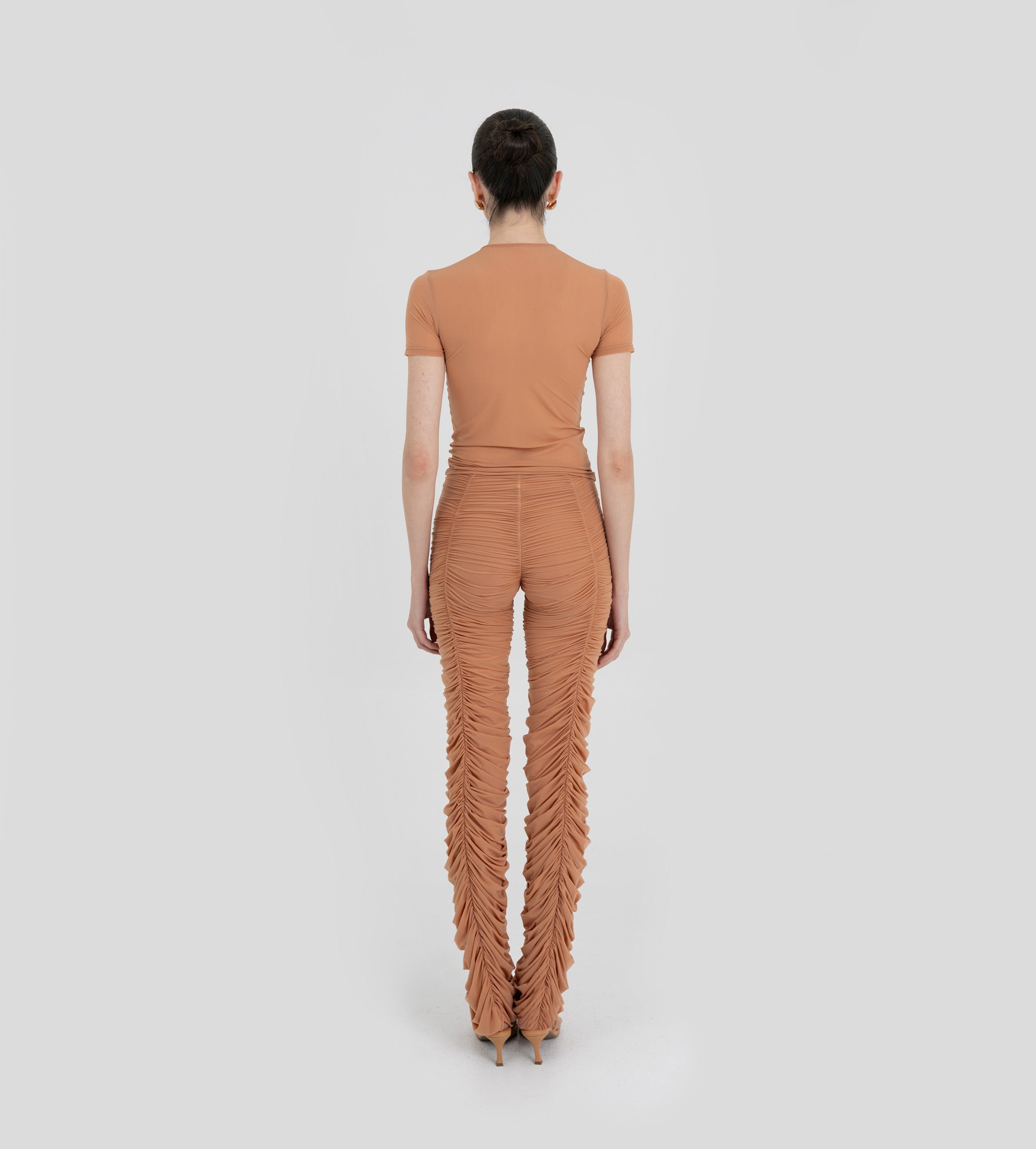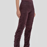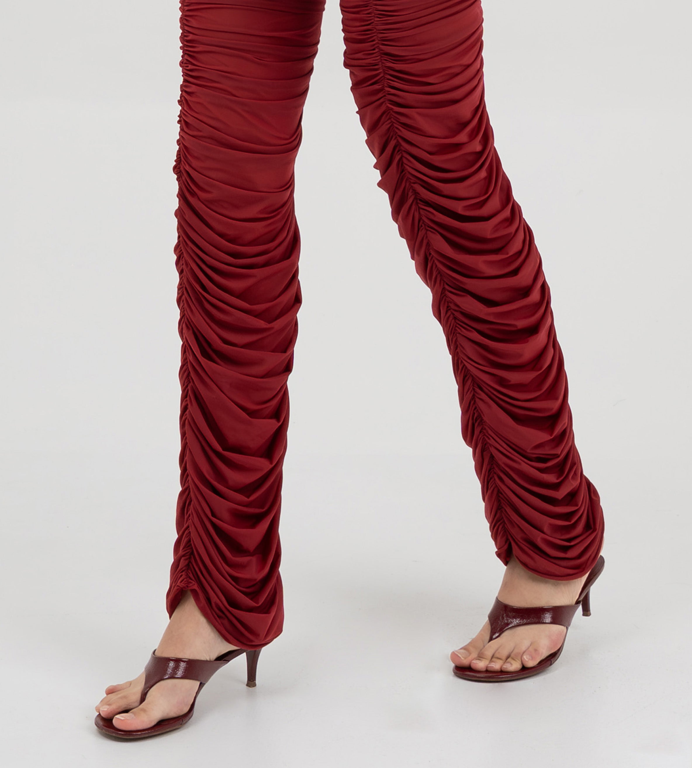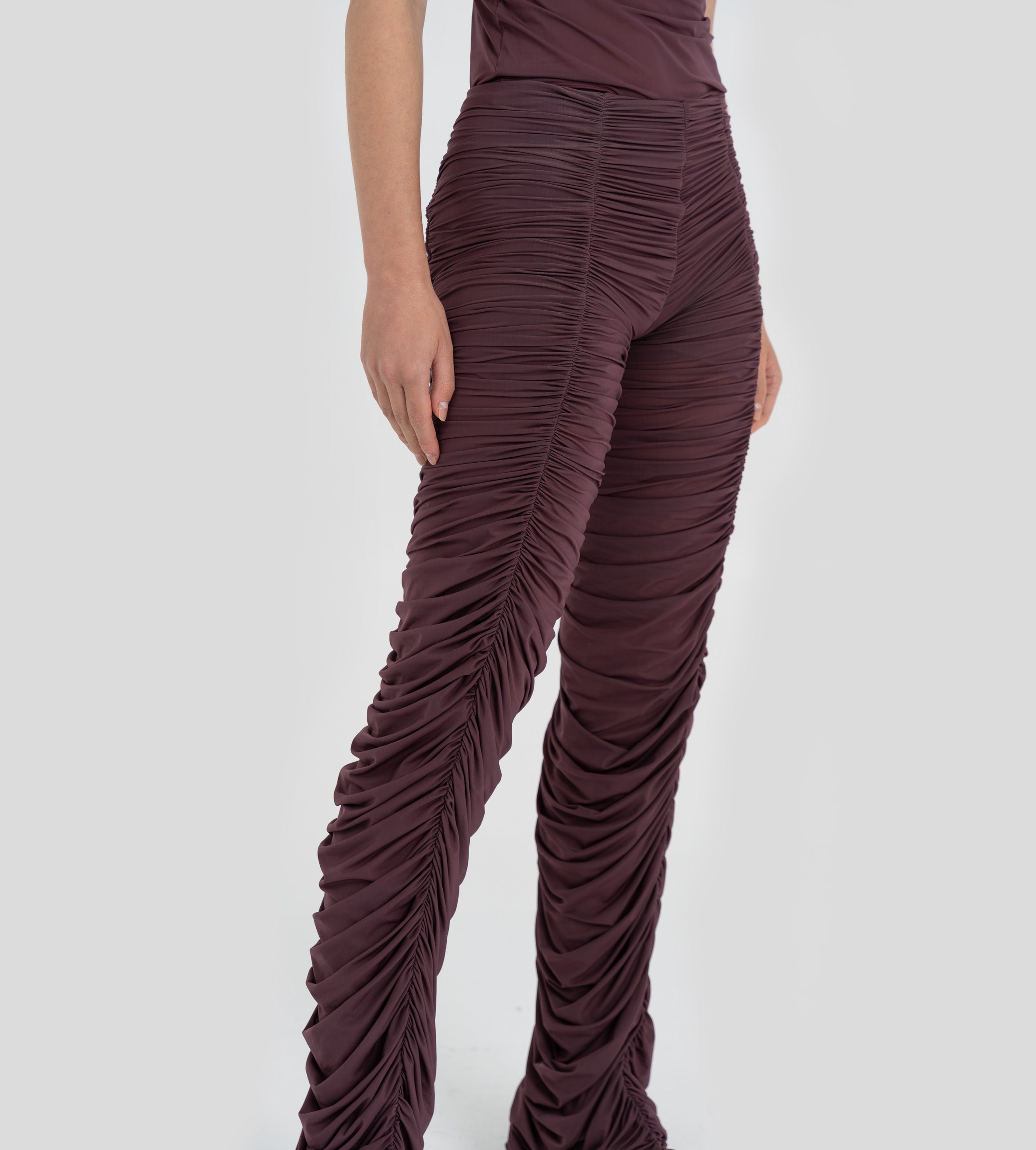 The Baena pants feature a mid-rise fit and a fully ruched design that cascades elegantly over the legs, expanding dynamically from top to hem for a striking, sculptural effect. An internal short is incorporated for added comfort and ease to wear, ensuring both style and functionality.