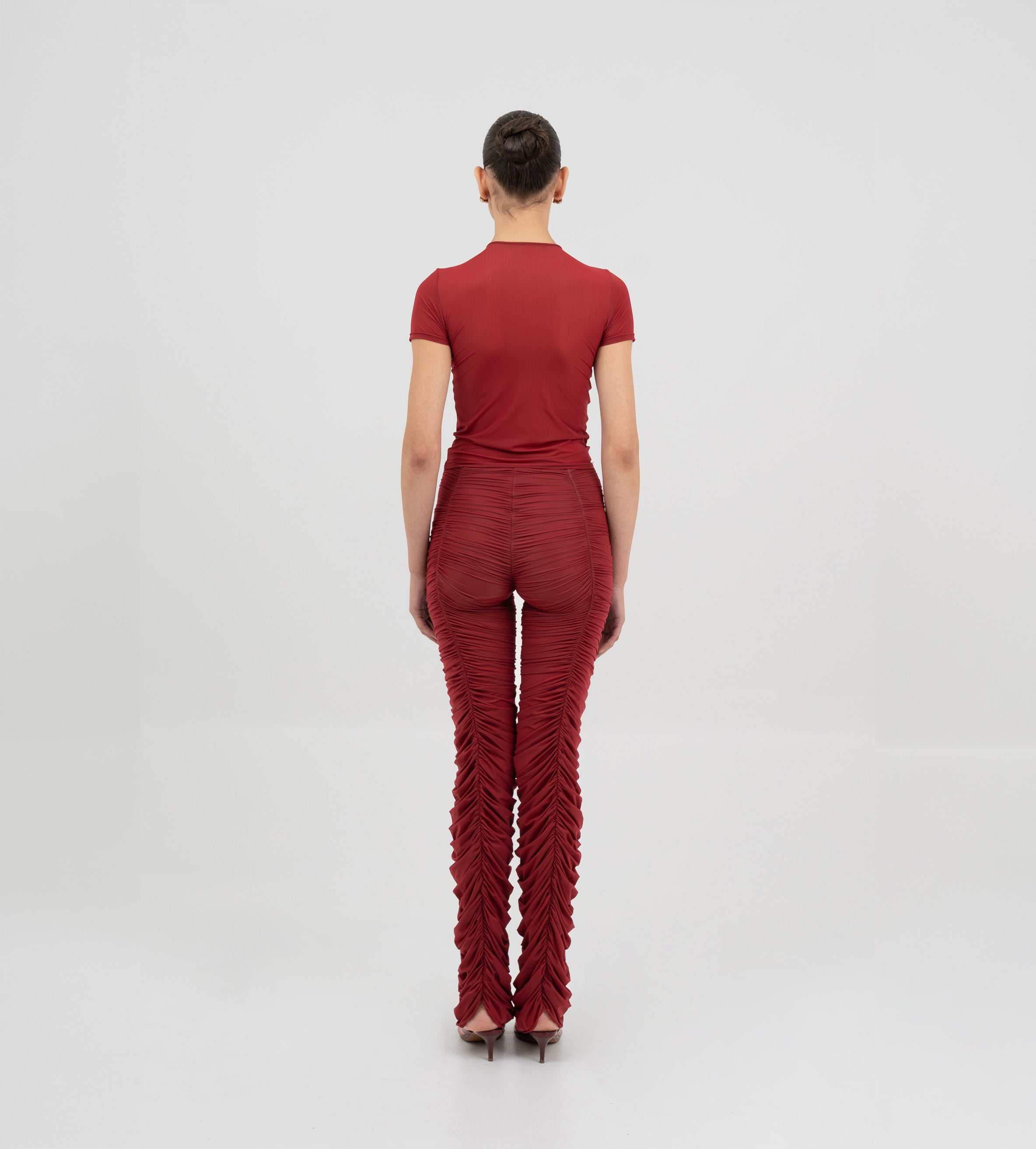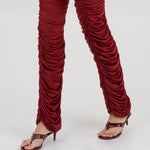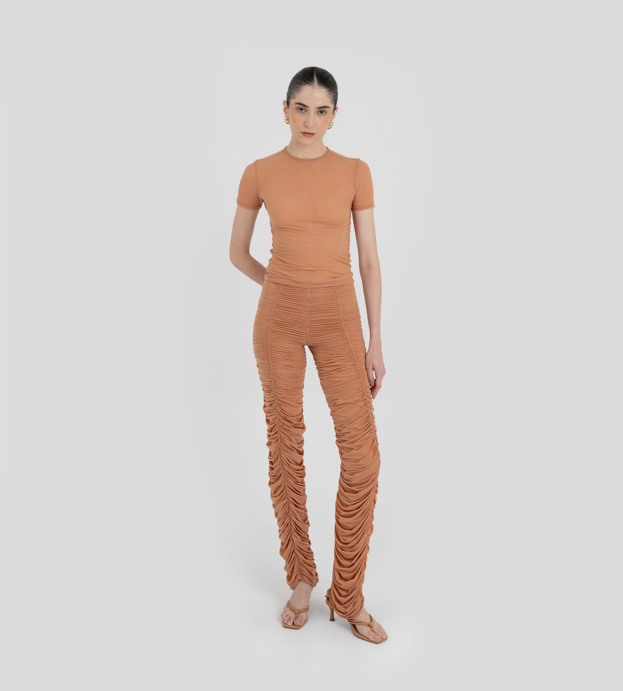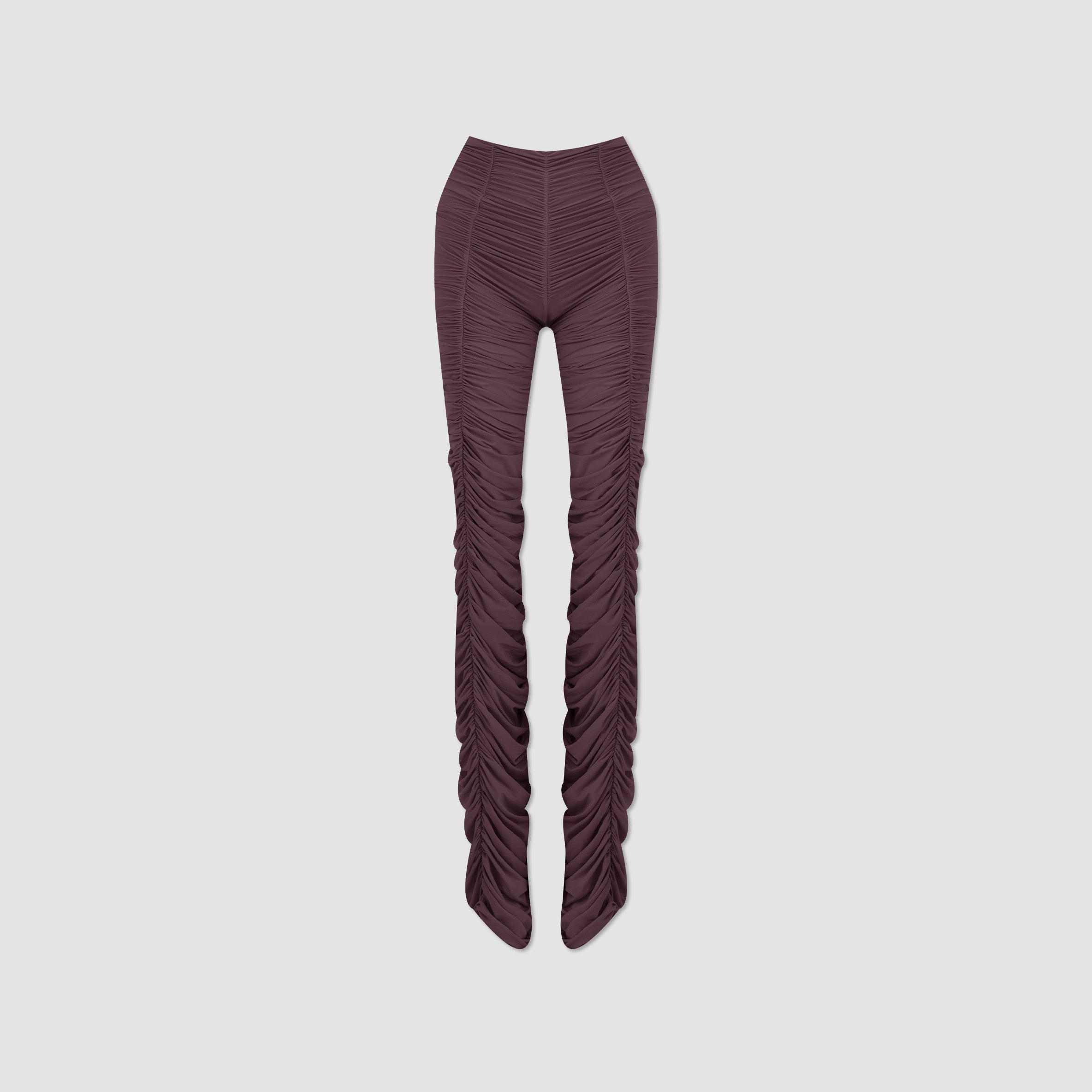 The Baena pants feature a mid-rise fit and a fully ruched design that cascades elegantly over the legs, expanding dynamically from top to hem for a striking, sculptural effect. An internal short is incorporated for added comfort and ease to wear, ensuring both style and functionality.