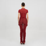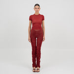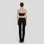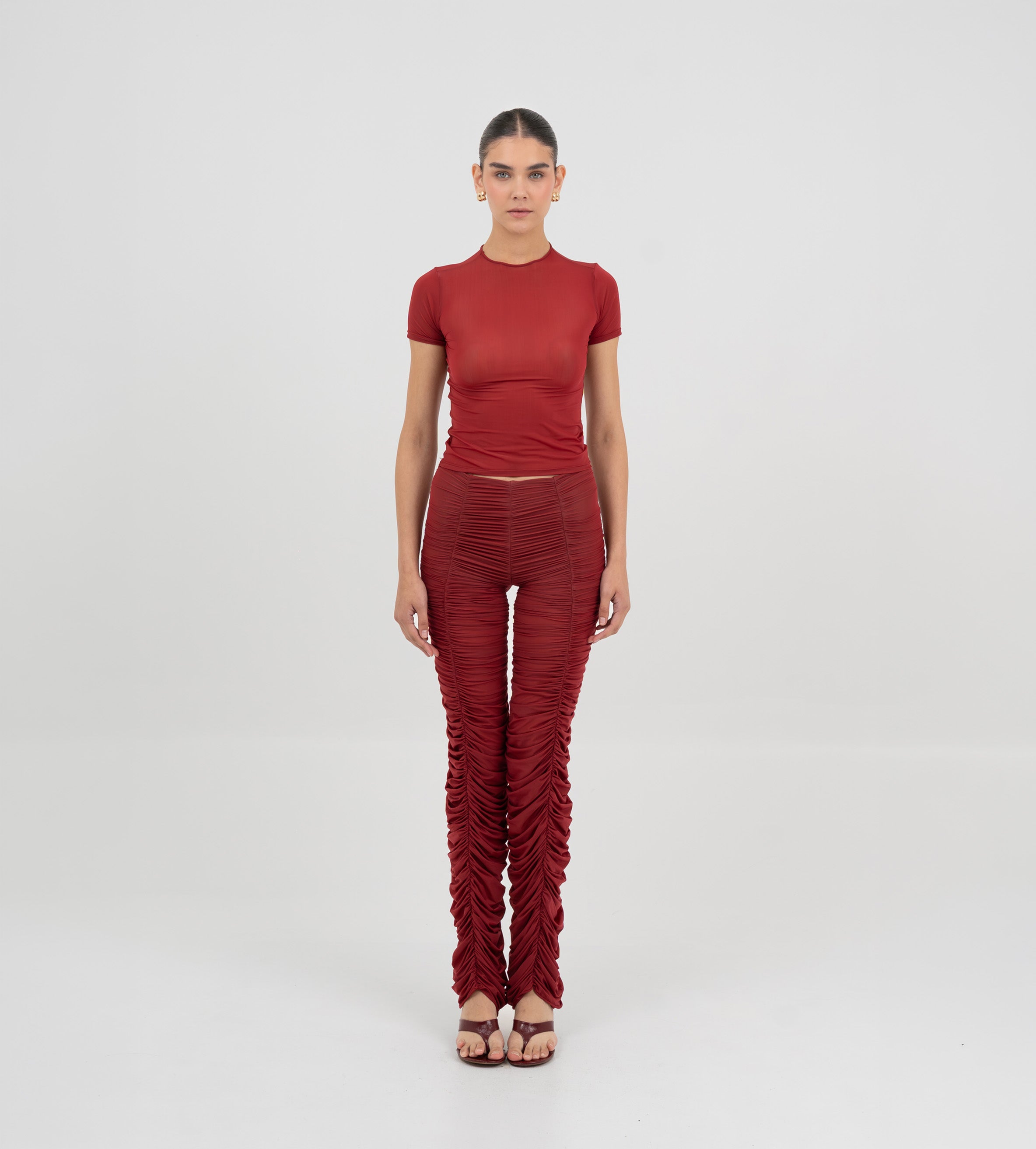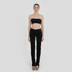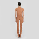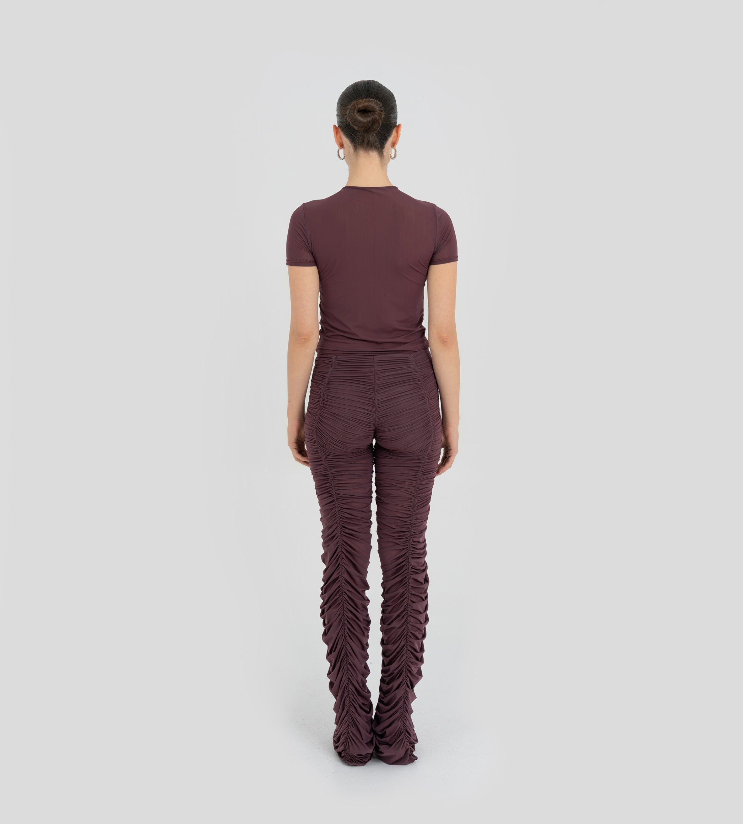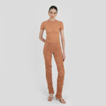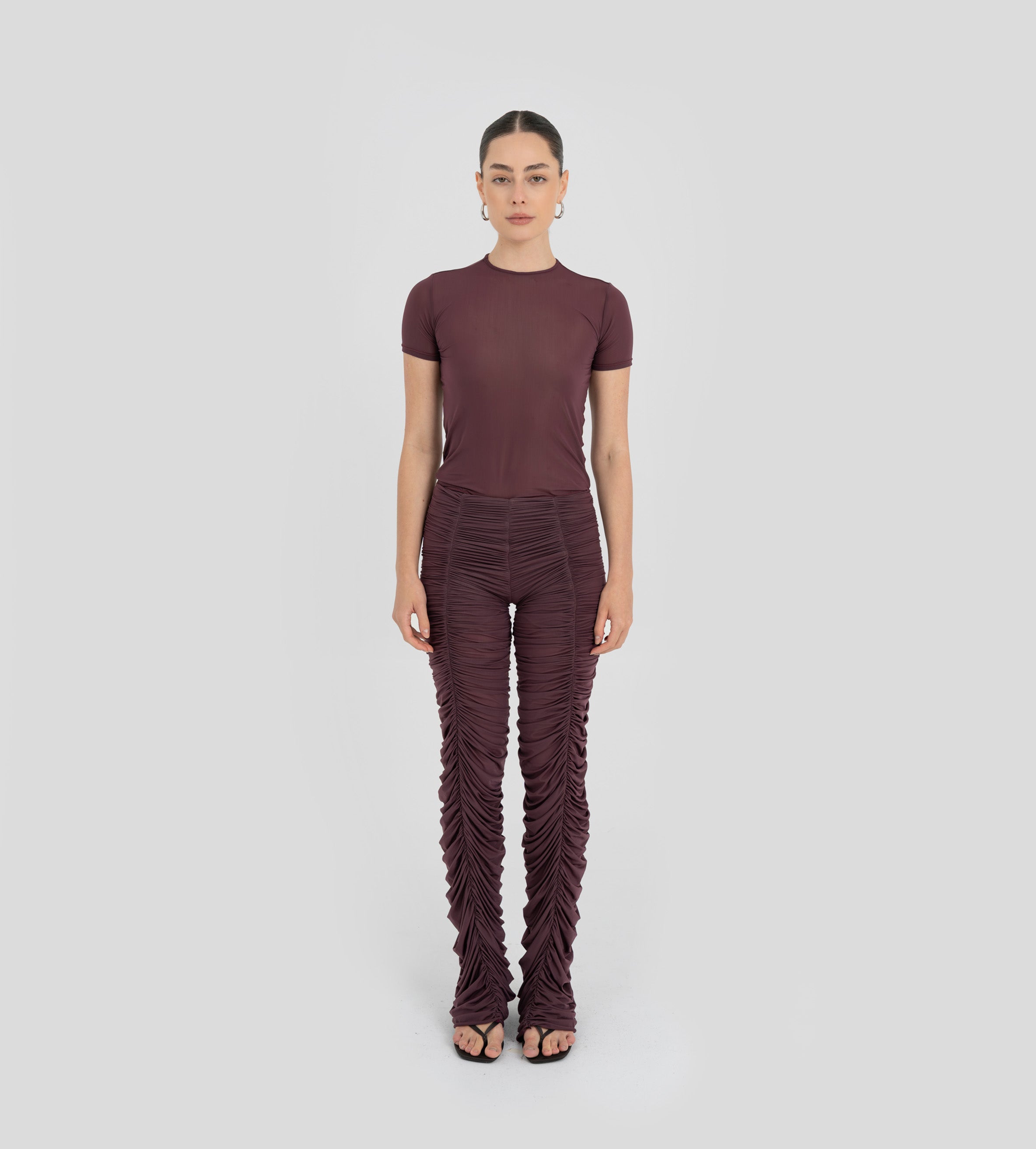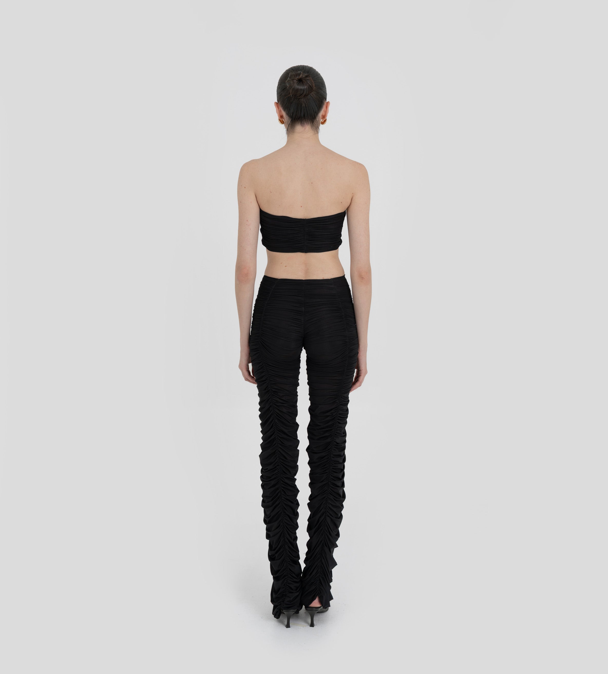The Baena pants feature a mid-rise fit and a fully ruched design that cascades elegantly over the legs, expanding dynamically from top to hem for a striking, sculptural effect. An internal short is incorporated for added comfort and ease to wear, ensuring both style and functionality.