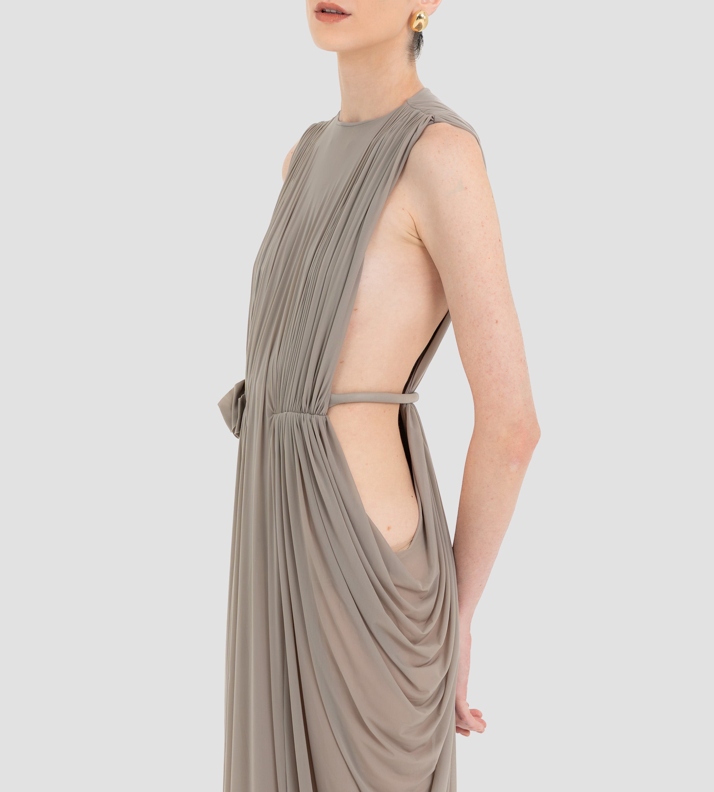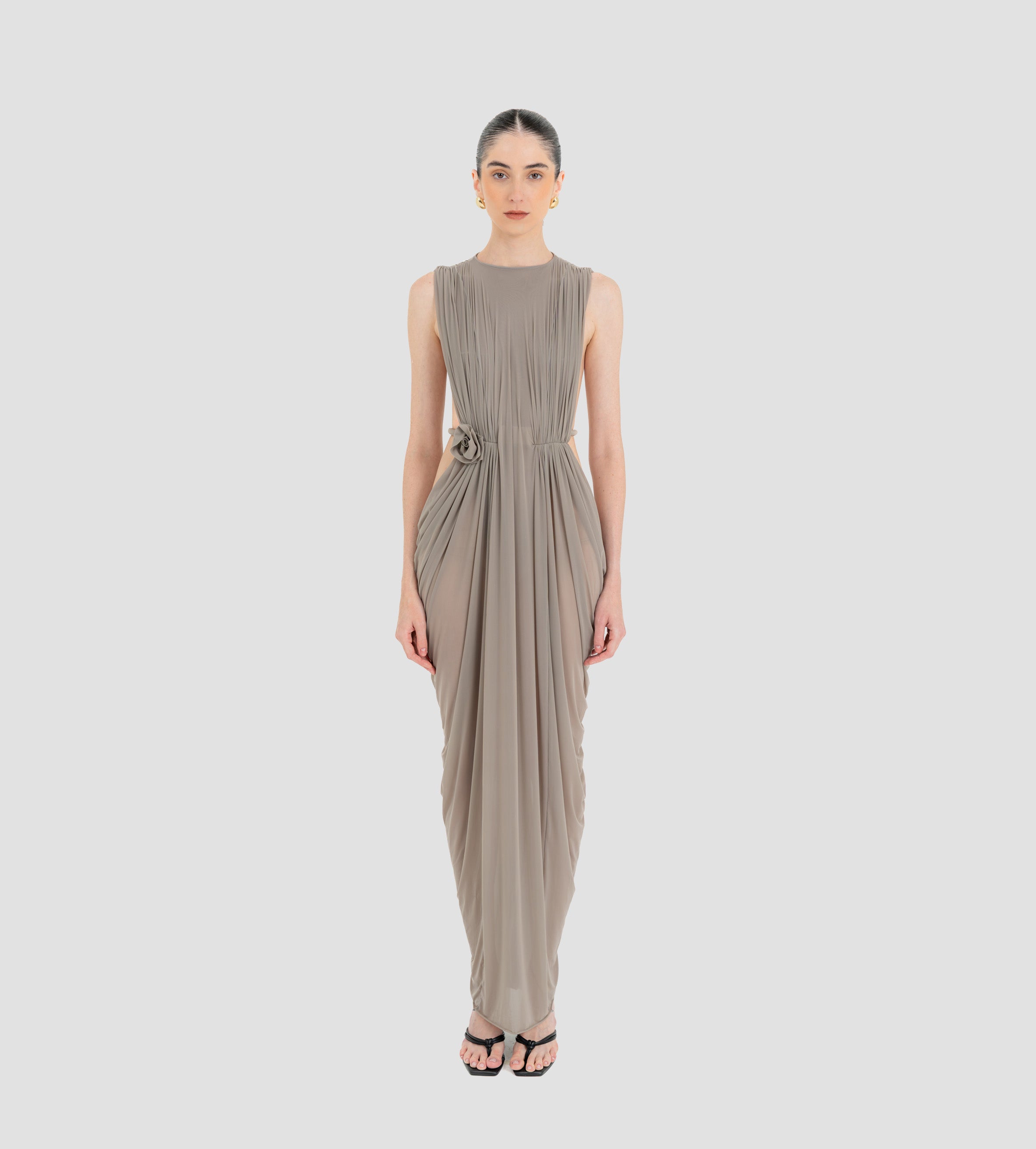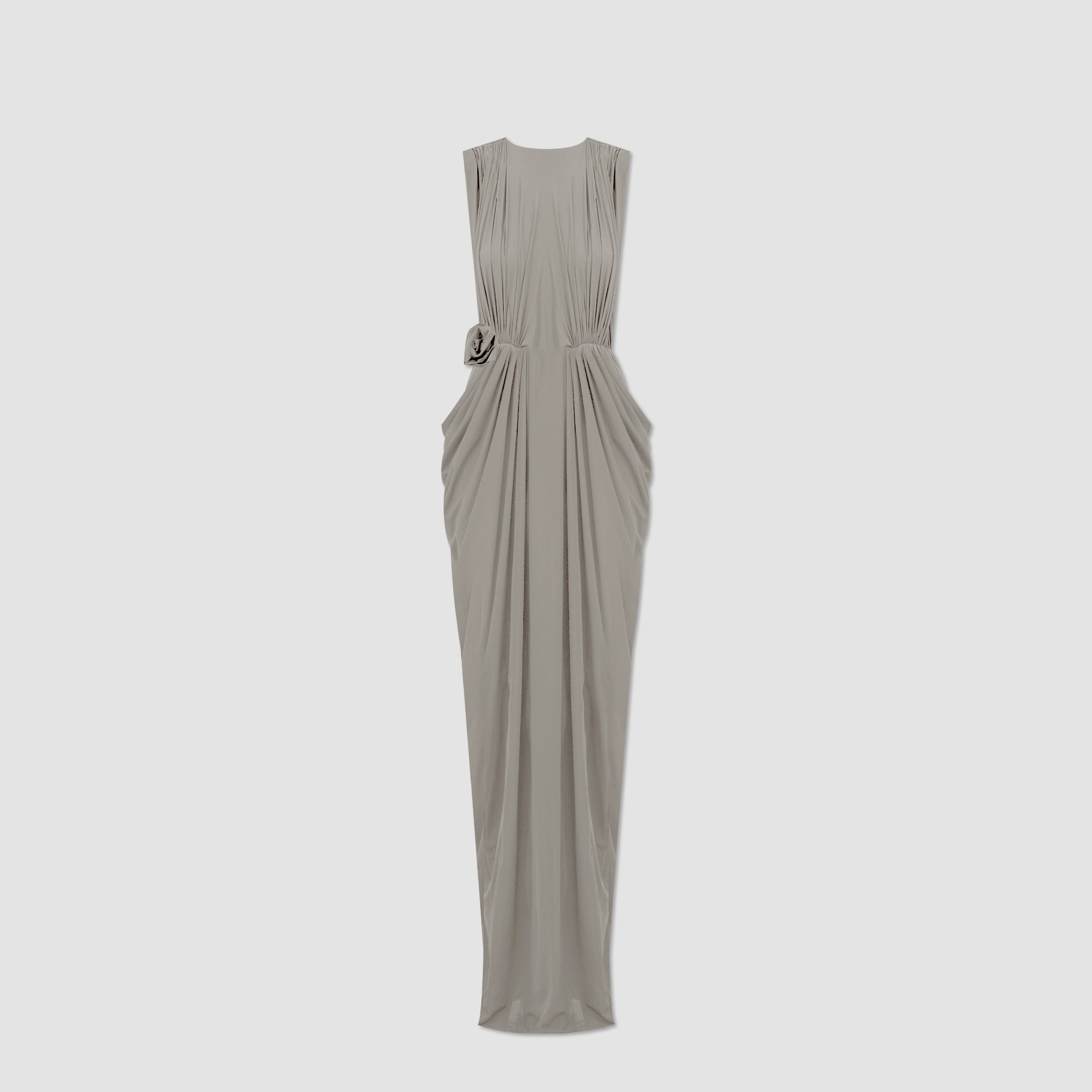 The Baluarte long dress showcases a high, rounded neckline that flows into an open sided silhouette, with an internal bodysuit for a better fit and comfort. Captivating ruching envelops the bodice at both front and back cinched at the waist by a lateral adjustable strap adorned with a sculptural 3D floral detail. From the waist, the design cascades into a long skirt with dramatic double-side draping. At the back, the fabric gathers at the waist over the adjustable strap, further defining and enhancing this alluring silhouette.