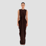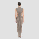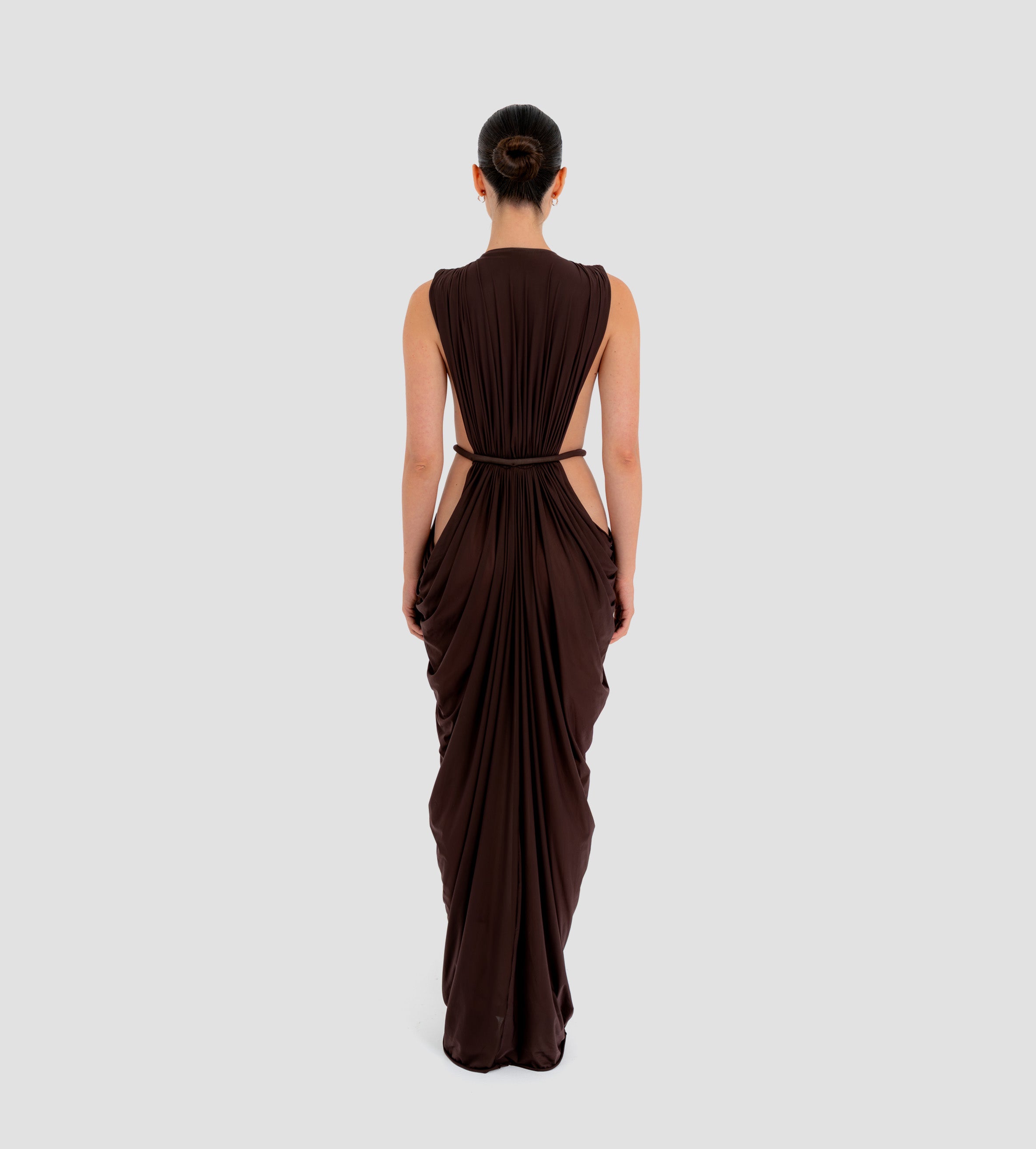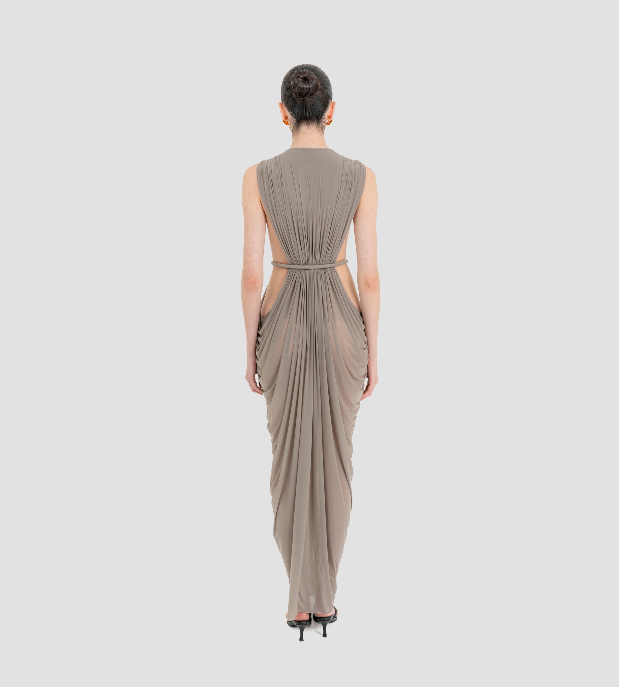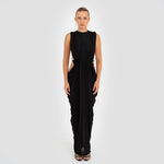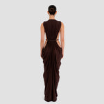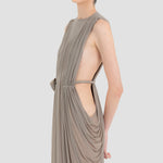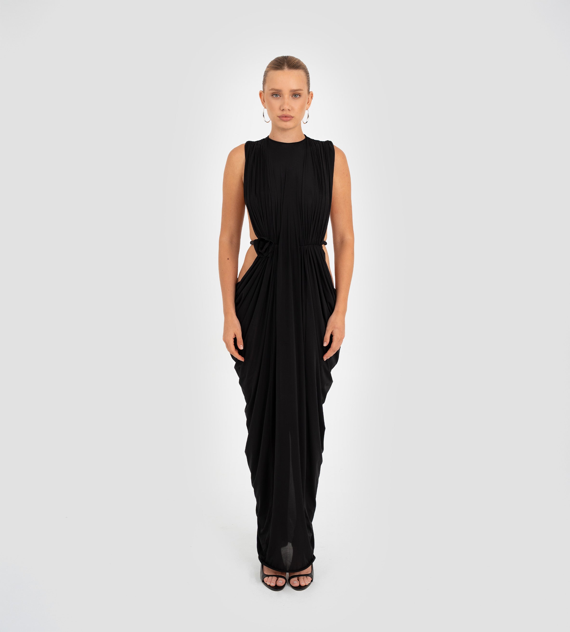 The Baluarte long dress showcases a high, rounded neckline that flows into an open sided silhouette, with an internal bodysuit for a better fit and comfort. Captivating ruching envelops the bodice at both front and back cinched at the waist by a lateral adjustable strap adorned with a sculptural 3D floral detail. From the waist, the design cascades into a long skirt with dramatic double-side draping. At the back, the fabric gathers at the waist over the adjustable strap, further defining and enhancing this alluring silhouette.