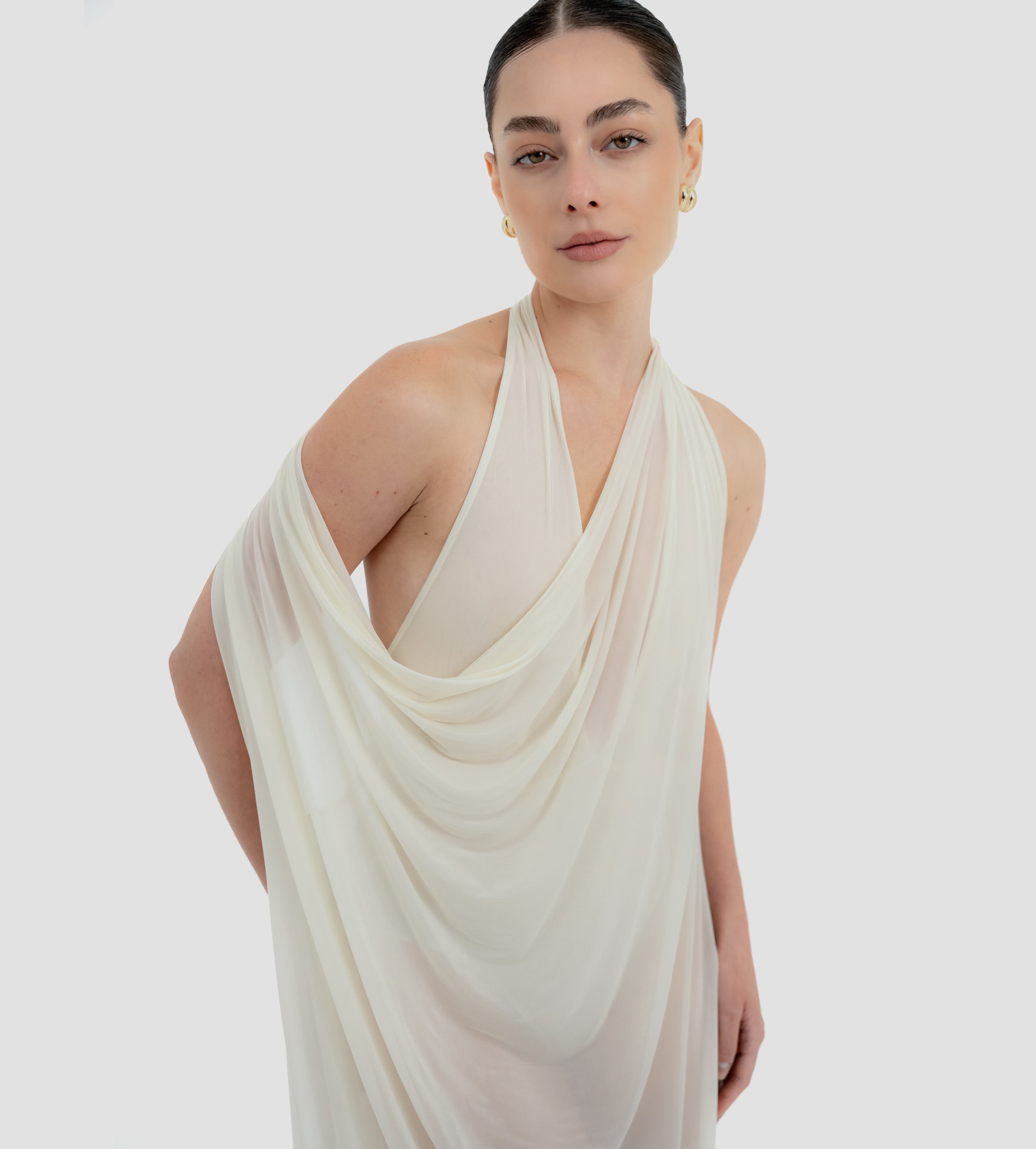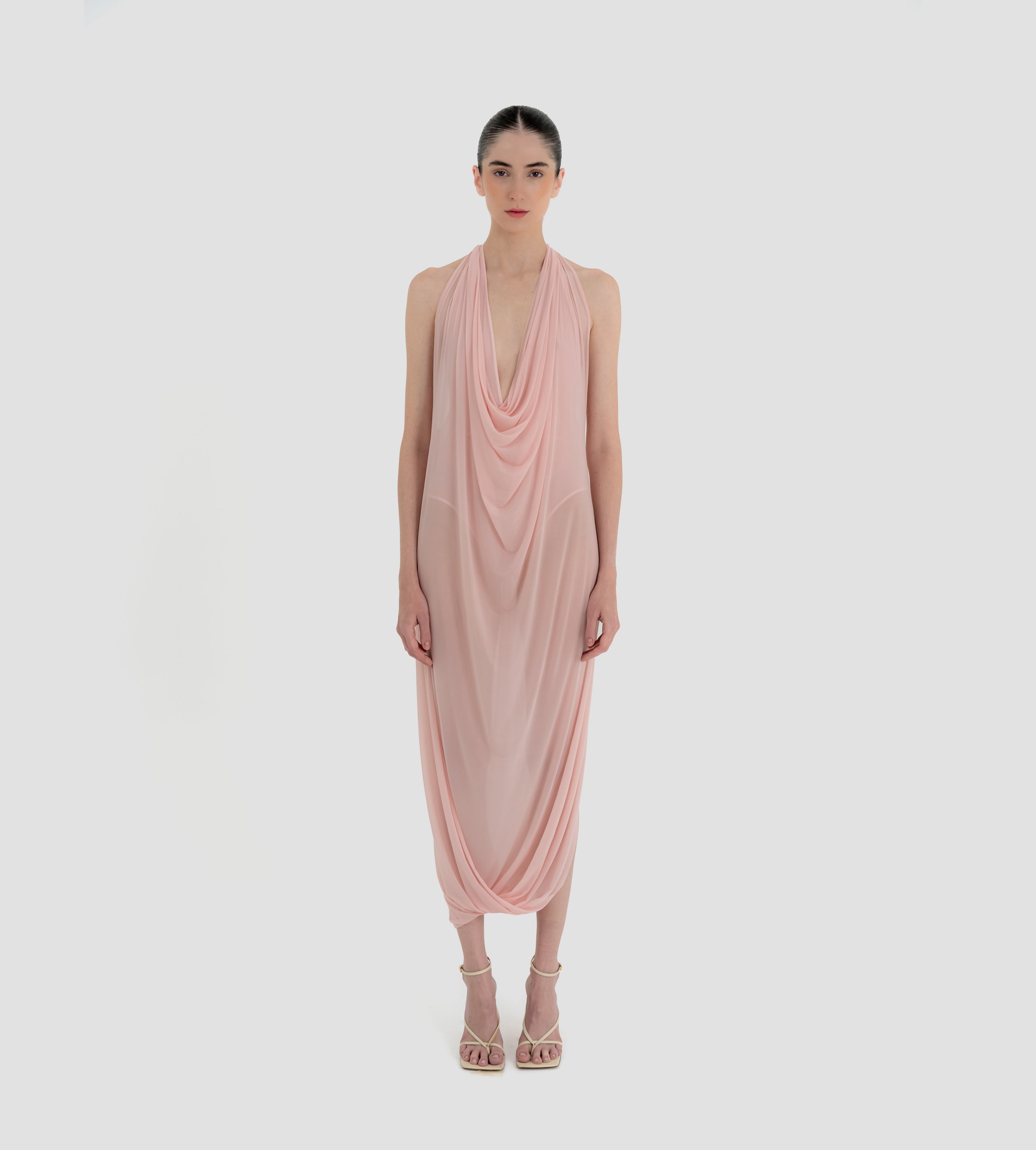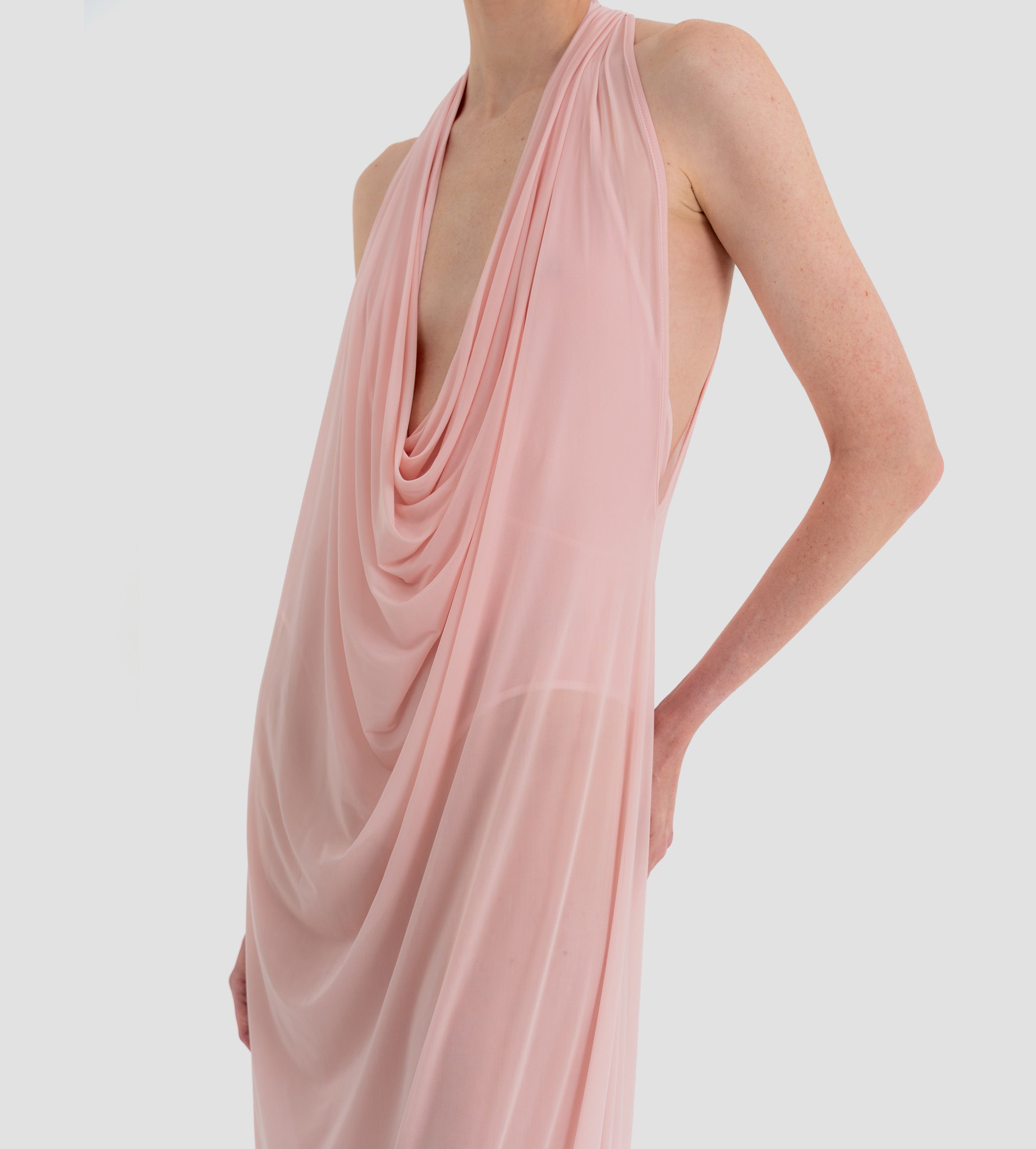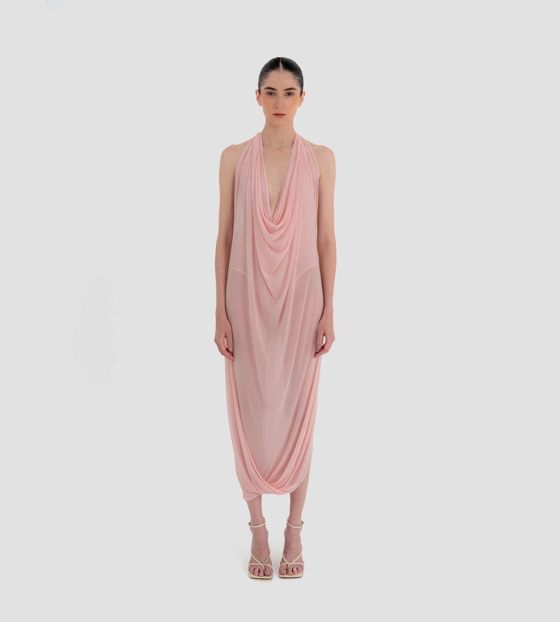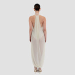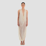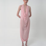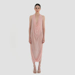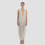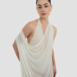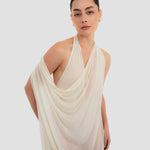The Baru dress presents our new cupro fabric, defined by a deep cowl neckline and plunging armholes that open into a fluid, flowing silhouette. At the back, a tunnel construction gathers the fabric allowing it to cascade gracefully down the back for a soft, sensual effect.