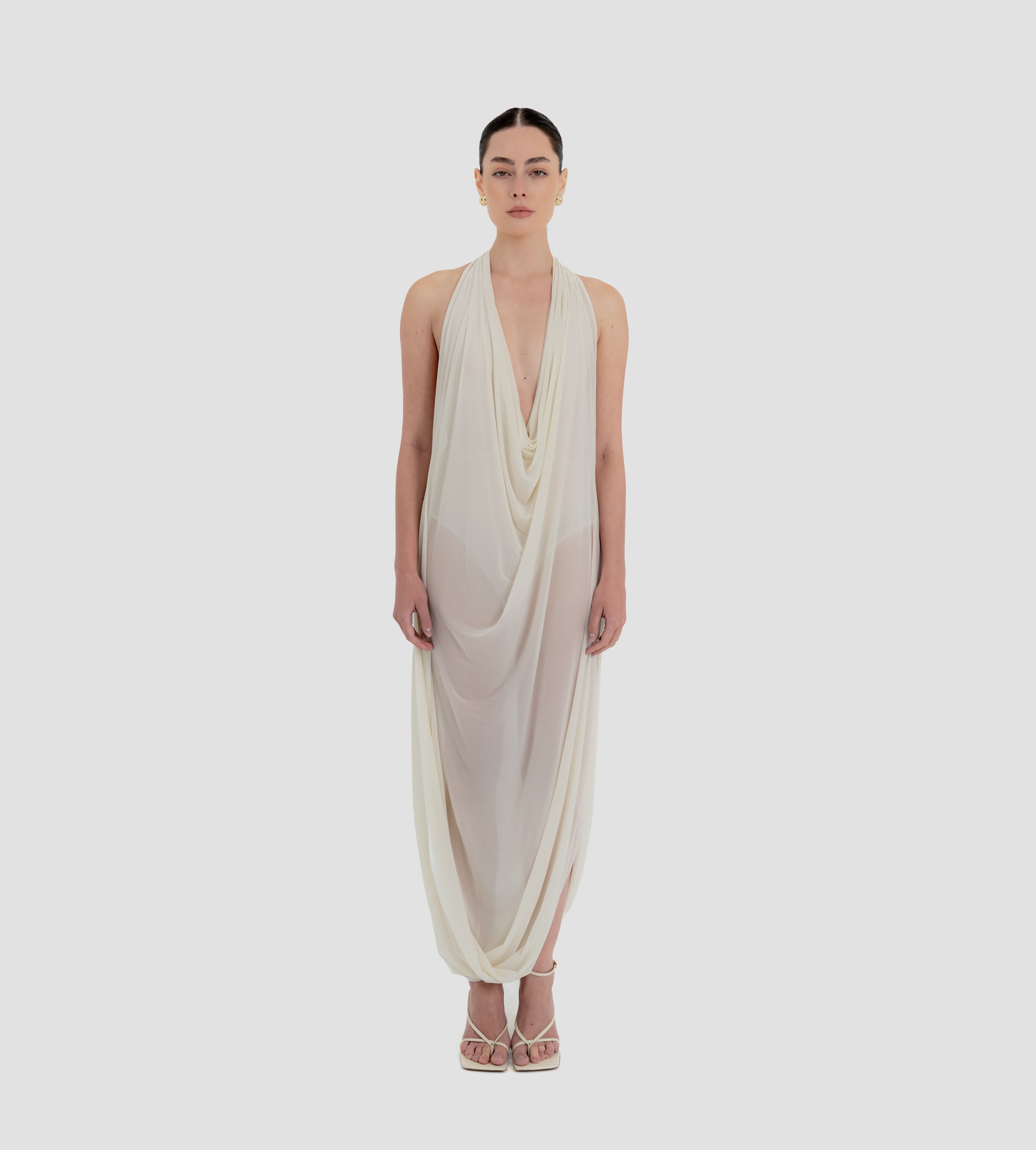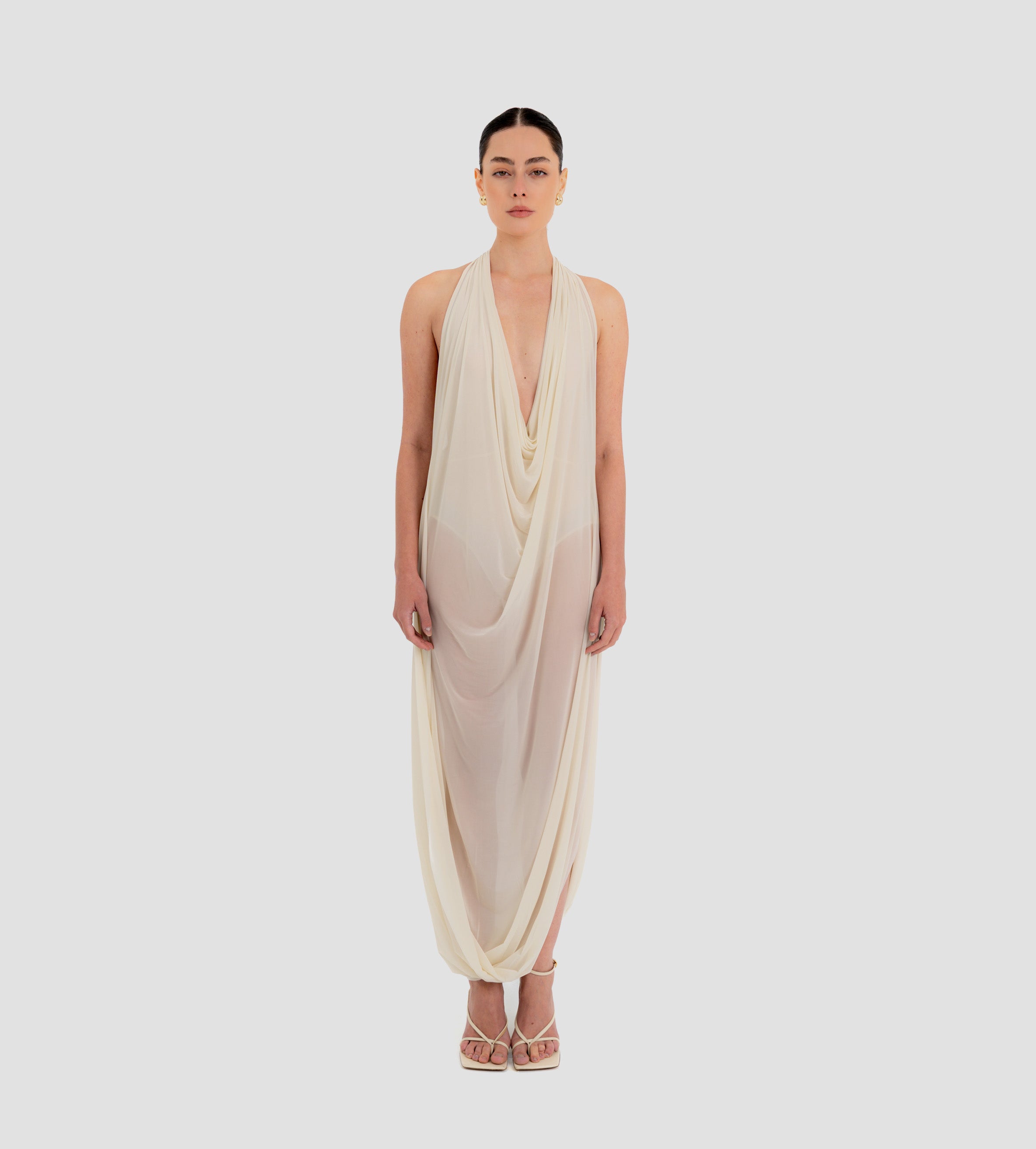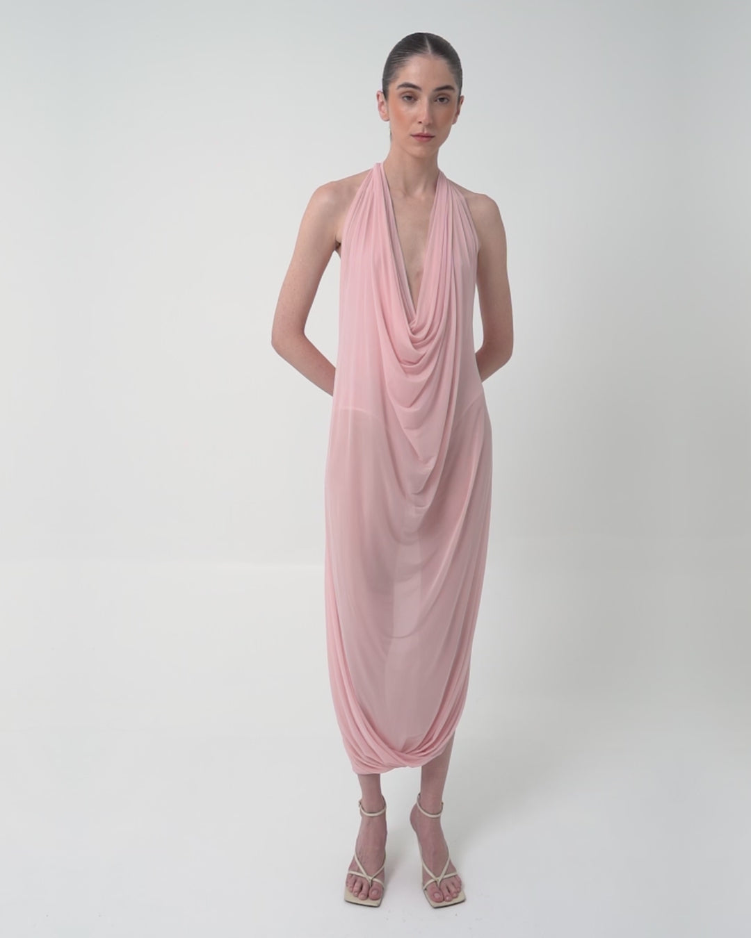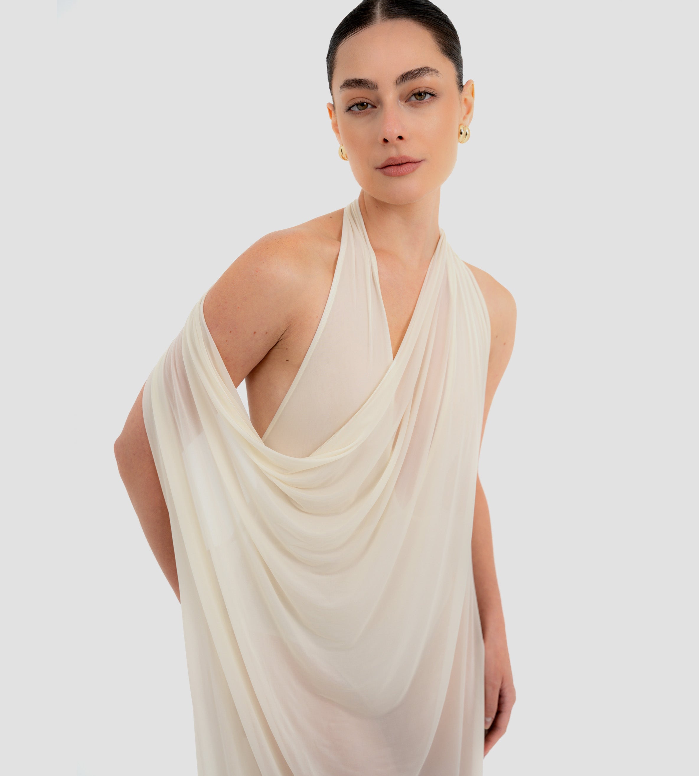 The Baru dress presents our new cupro fabric, defined by a deep cowl neckline and plunging armholes that open into a fluid, flowing silhouette. At the back, a tunnel construction gathers the fabric allowing it to cascade gracefully down the back for a soft, sensual effect.