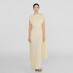 The Batista long dress boasts a softly draped cowl scoop neckline and a deep, round open back, followed by flowing shoulder sashes that cascade into a sleek, column-shaped silhouette.