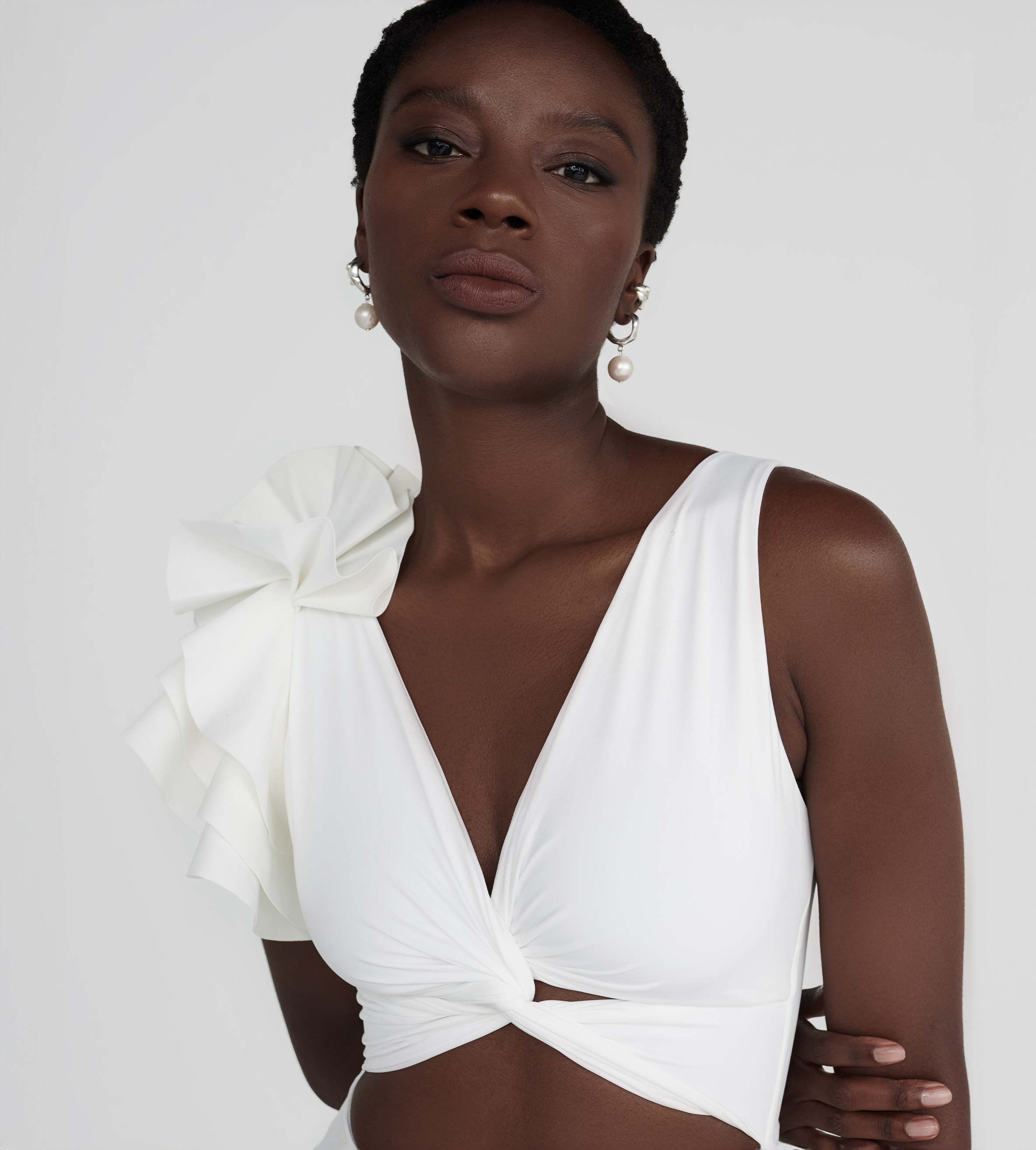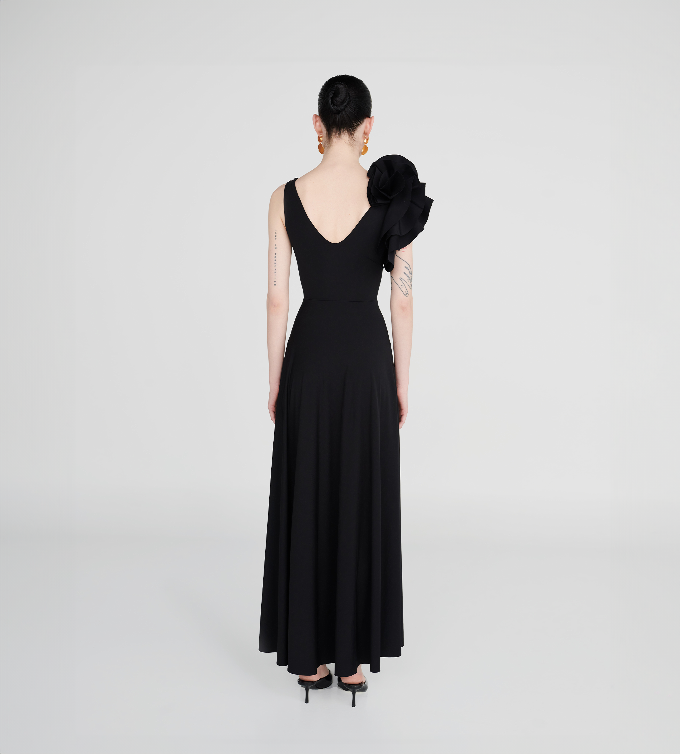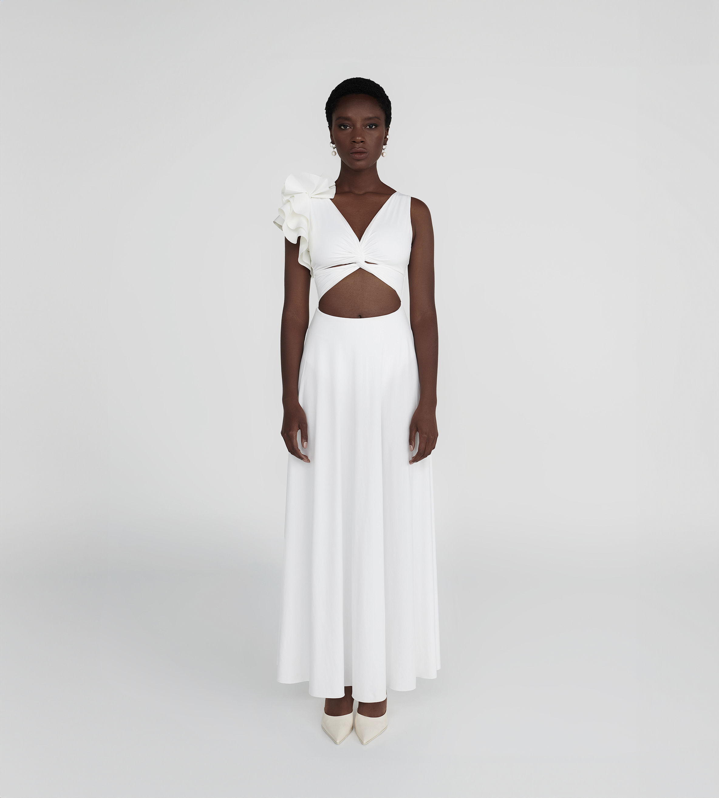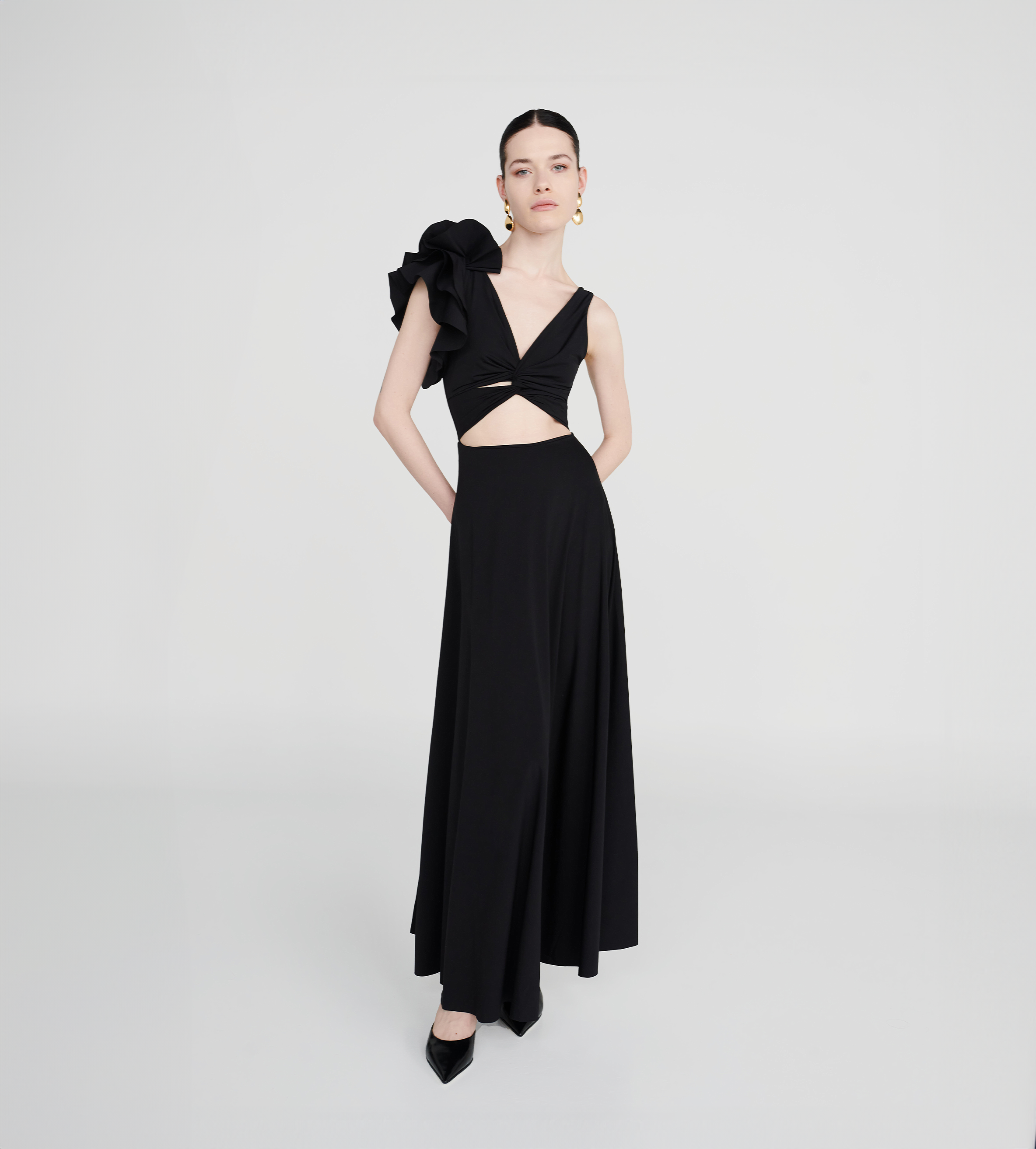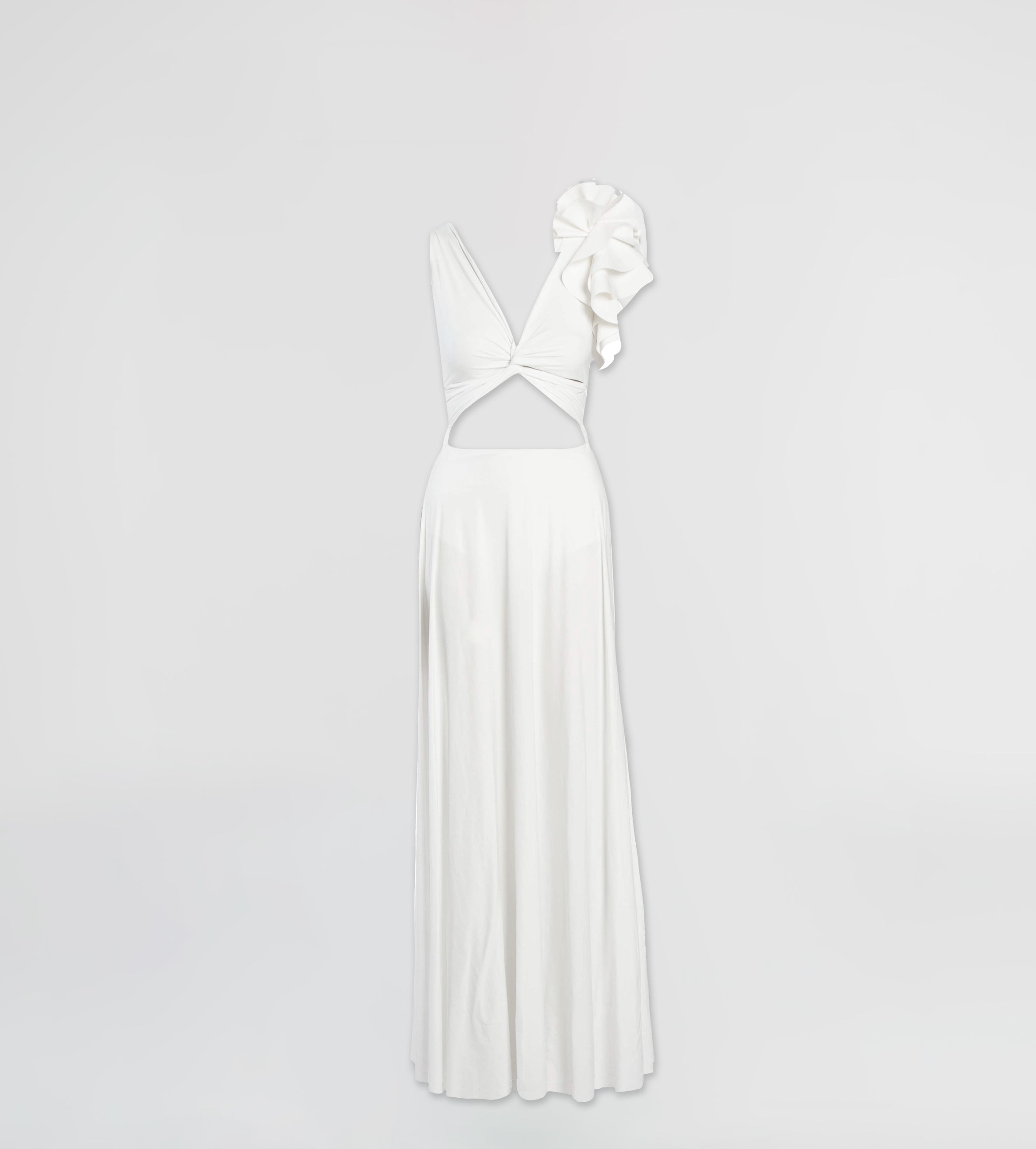 Reversible maxi dress, deep triangular neckline with twist knot and abdomen cut-out on one side and round neckline on the other side. Thick sleeves with pronounced unilateral ruffled-detail that covers the shoulder. Includes high-waisted underwear that stylizes the figure.