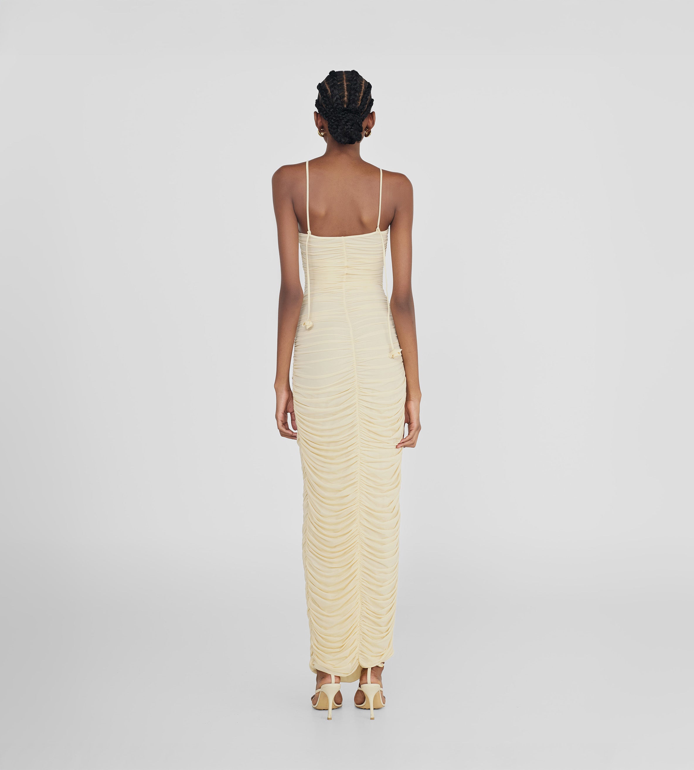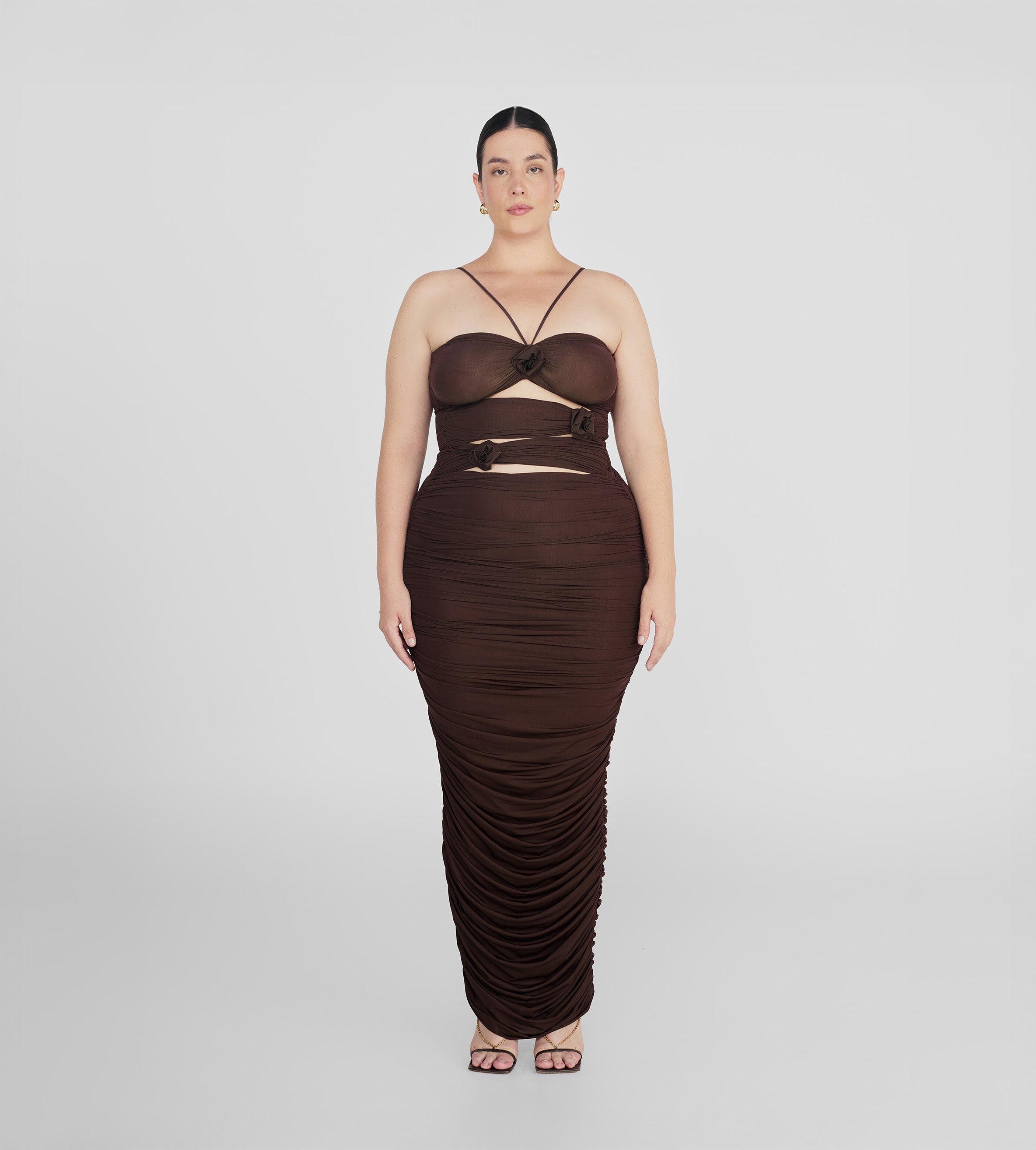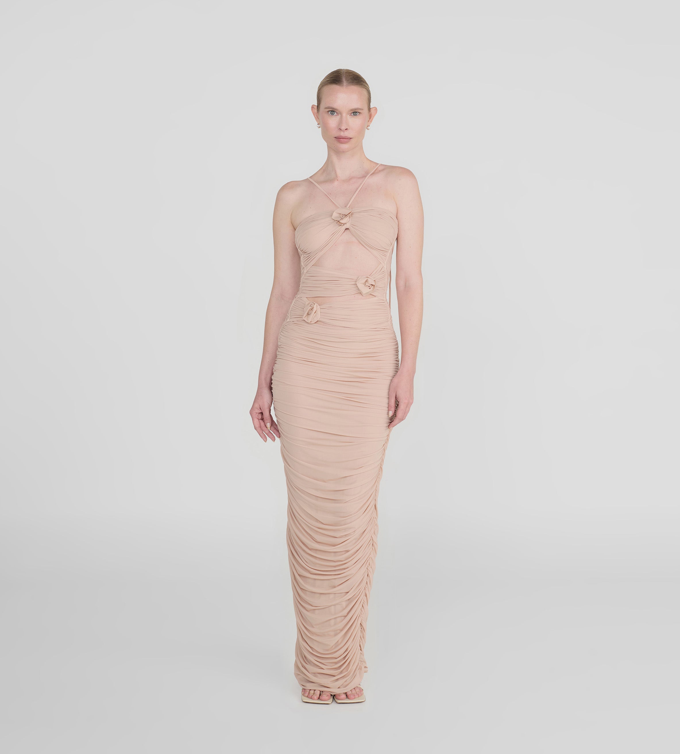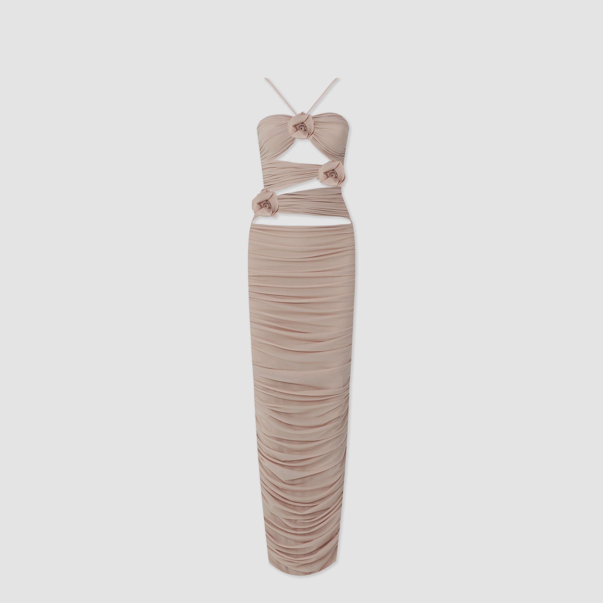 Long, straight-cut dress crafted from fully ruched stretch mesh. It features a knotted closure and asymmetrical cut-outs at the waist, adorned with three ruffled flower appliqués. The straps are embellished with our new, delicate rosebud details.
